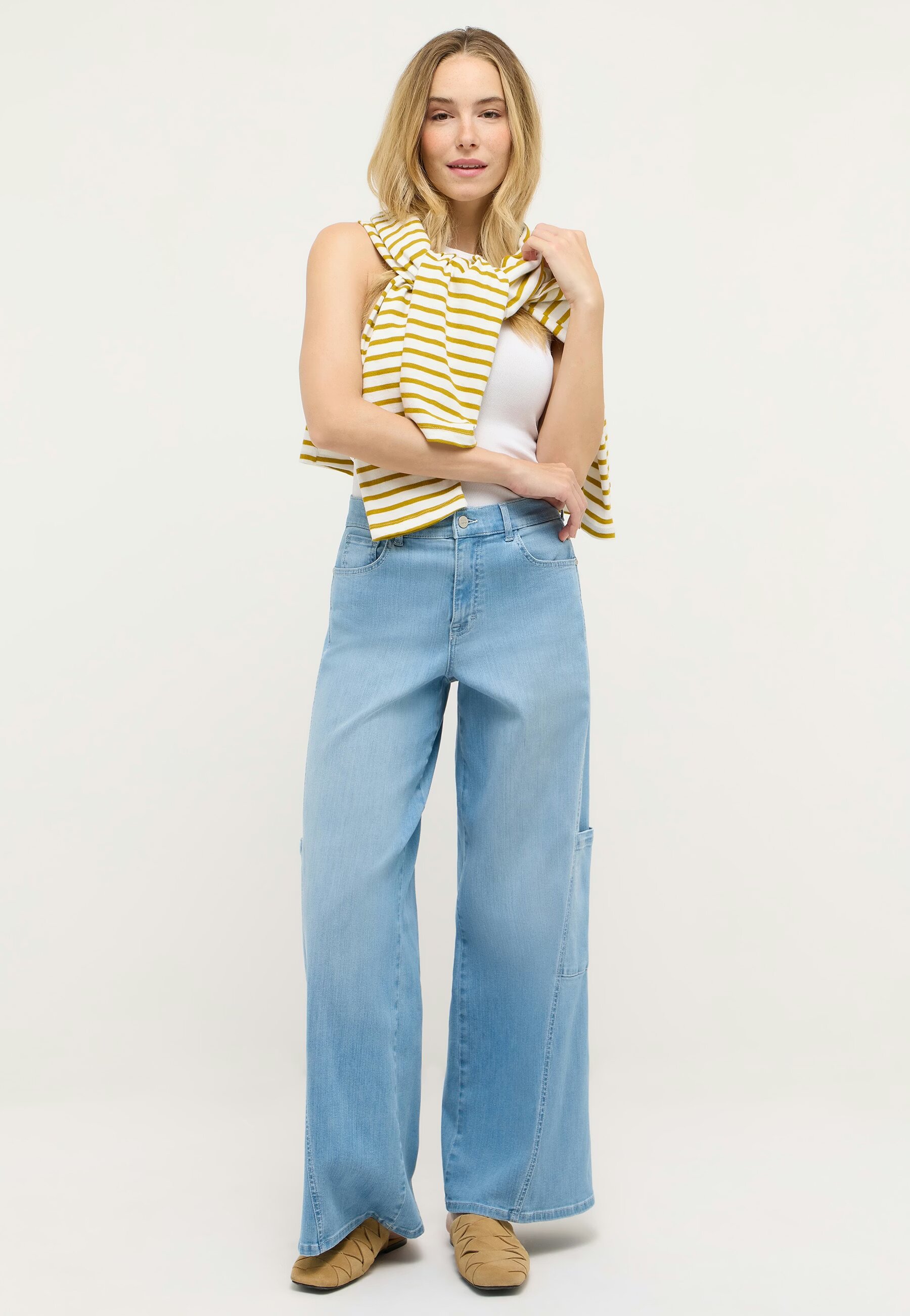Джинсы Liva (Лива) свободного кроя с широкими штанинами сочетают в себе повседневный стиль с пятью карманами и характерную потертую обработку. Большие боковые карманы добавляют практичности и стиля – идеально для создания непринужденного образа с характером.