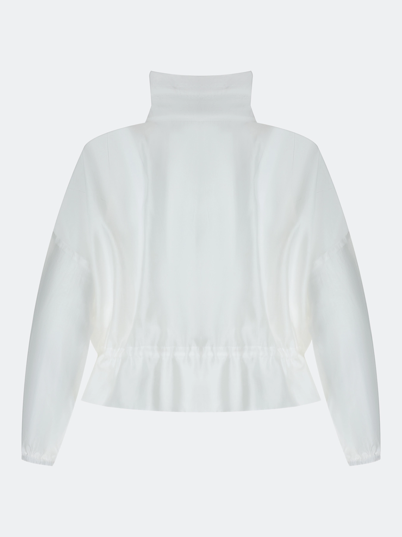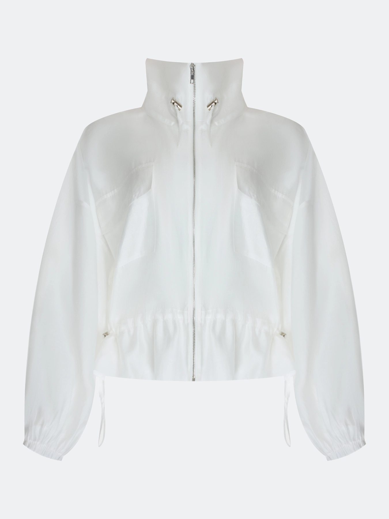 Полупрозрачный тонкий жакет из тенселя. Свободный силуэт. Высокий воротник стойка дополнен утяжниками. Застежка на молнию. Спущенная линия плеч и длинные рукава с резинкой по низу. Накладные боковые карманы с клапанами. Дополнен кулисой по низу изделия.