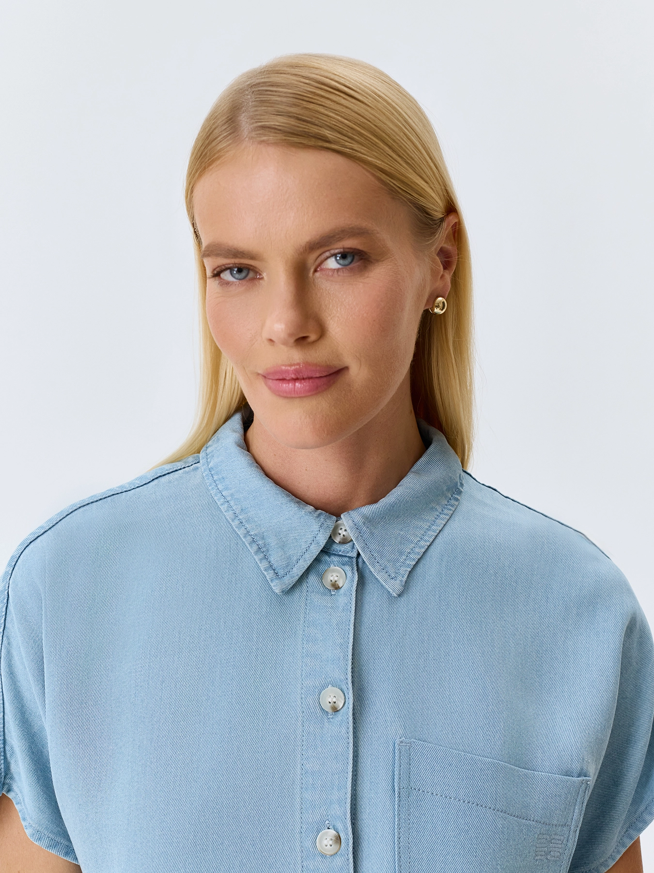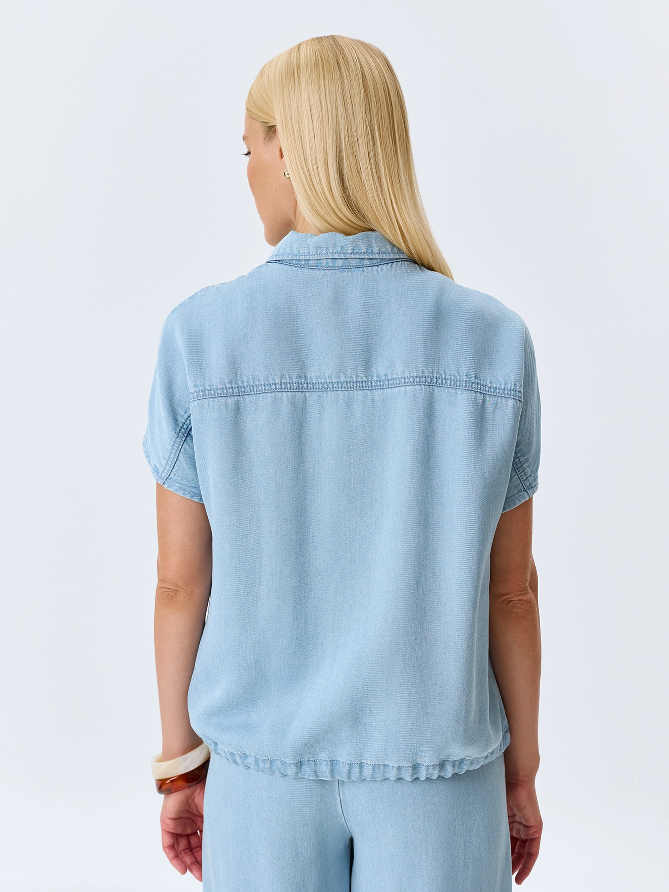 Блузка из тонкого денима. Прямой силуэт. Отложной воротник. Застежка на пуговицы. Накладной нагрудный карман. Короткие цельнокроенные рукава. Дополнена кулисой по низу изделия. В составе 100% тенсель. Комплект с 4267616.