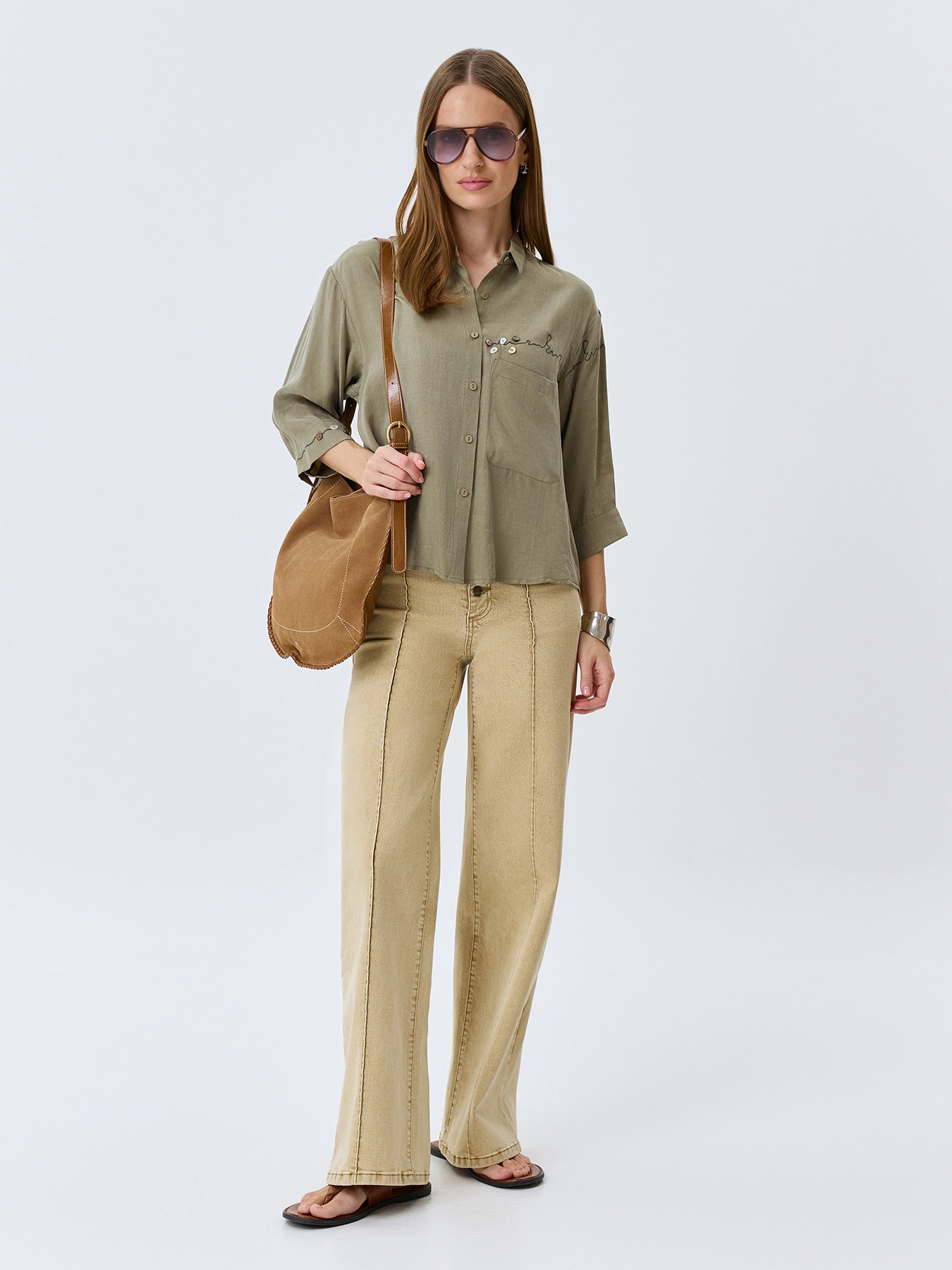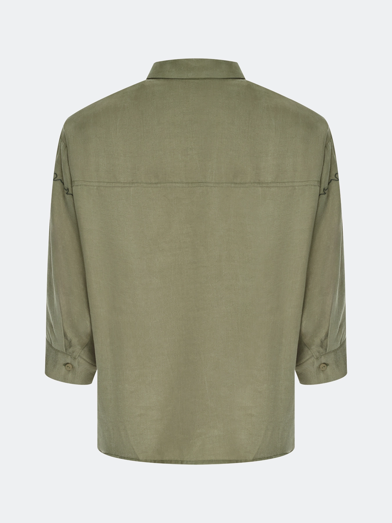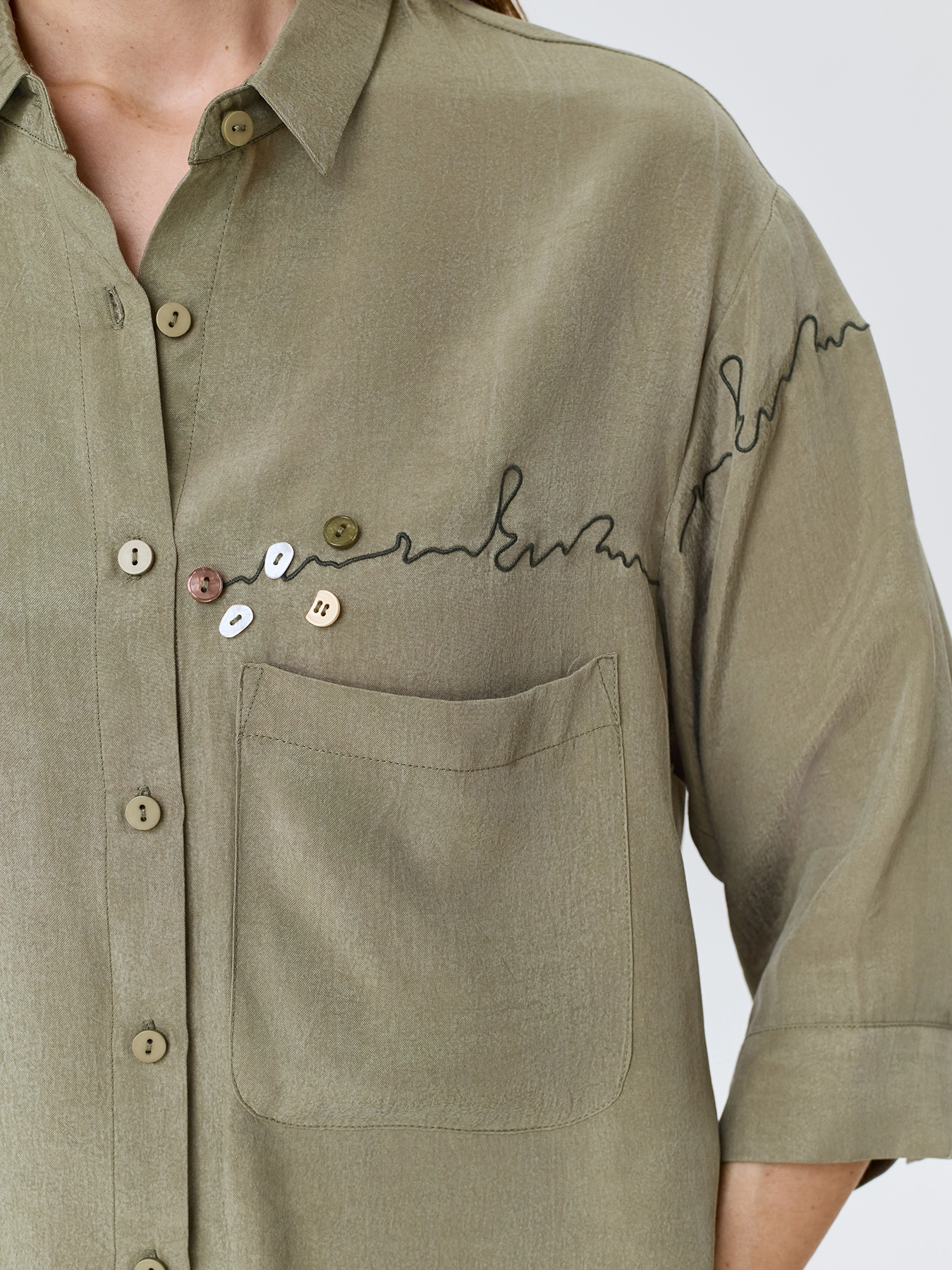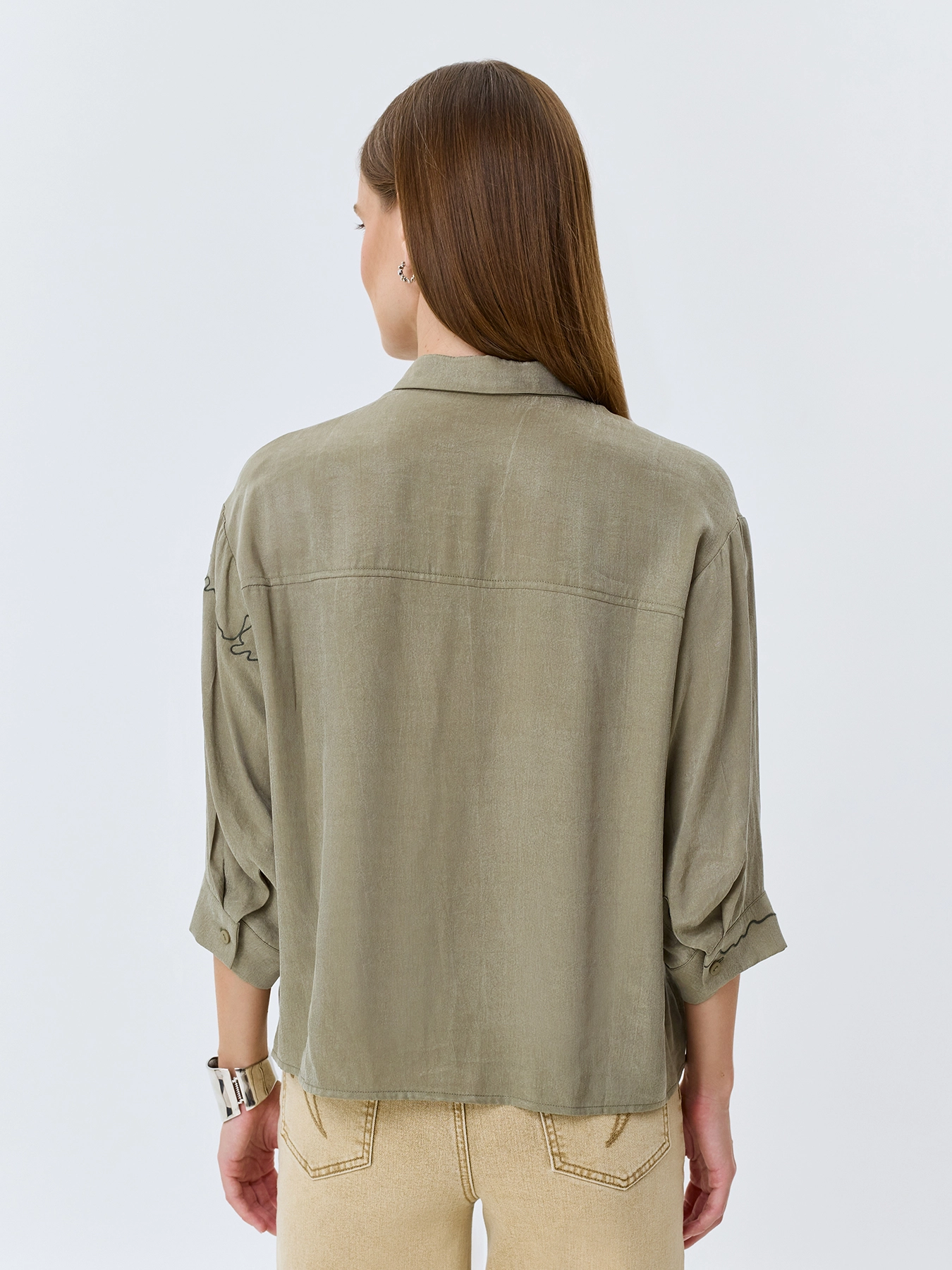Оливковая блузка из тенселя и вискозы. Свободный силуэт. Отложной воротник. Застежка на пуговицы. Спущенная линия плеч и втачные рукава 3/4. Накладной нагрудный карман. Дополнена акцентной вышивкой и декором.