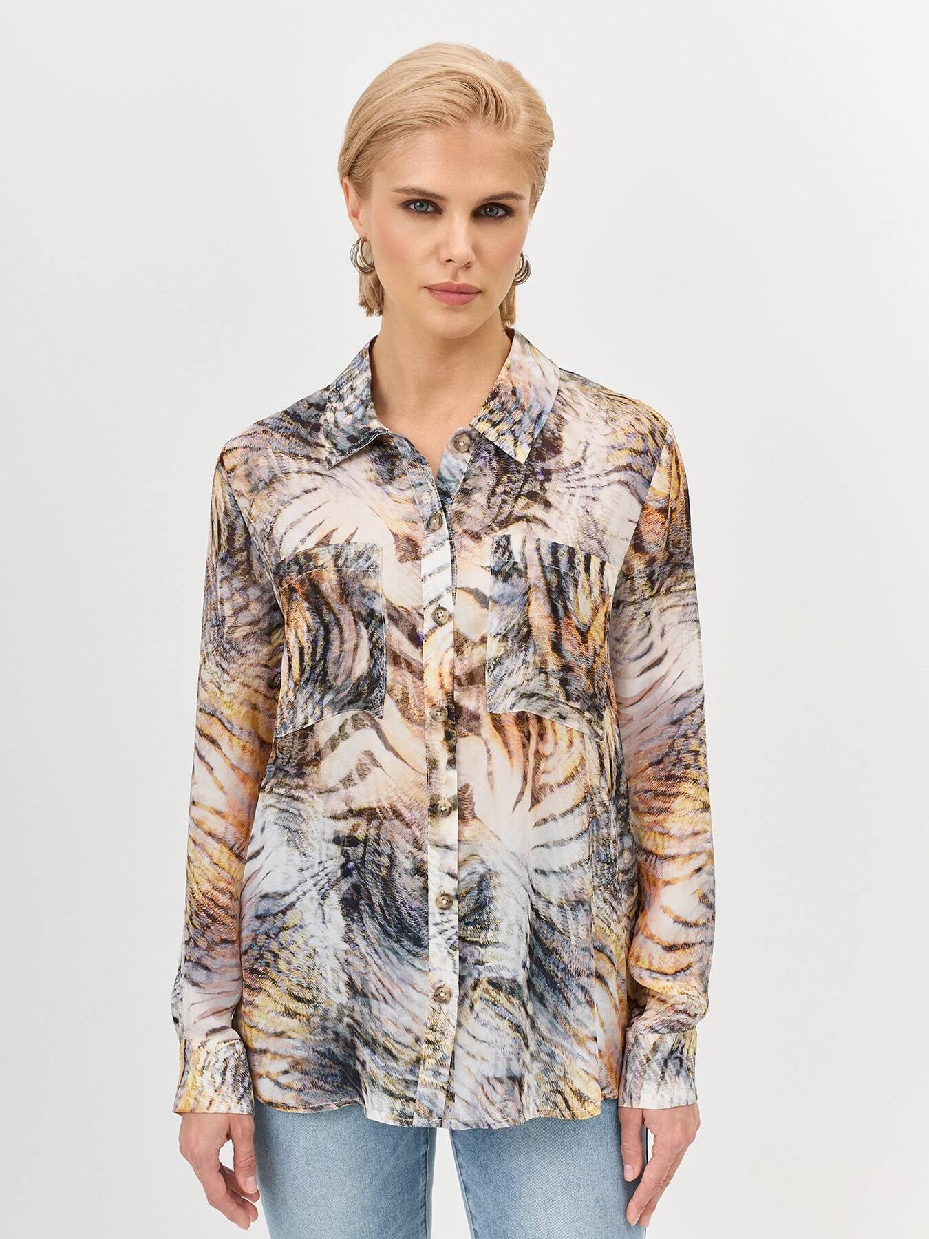 Блузка с анималистичным принтом из 100% вискозы. Прямой силуэт. Отложной воротник. Застежка на пуговицы. Длинные свободные рукава с манжетами. Накладные нагрудные карманы.