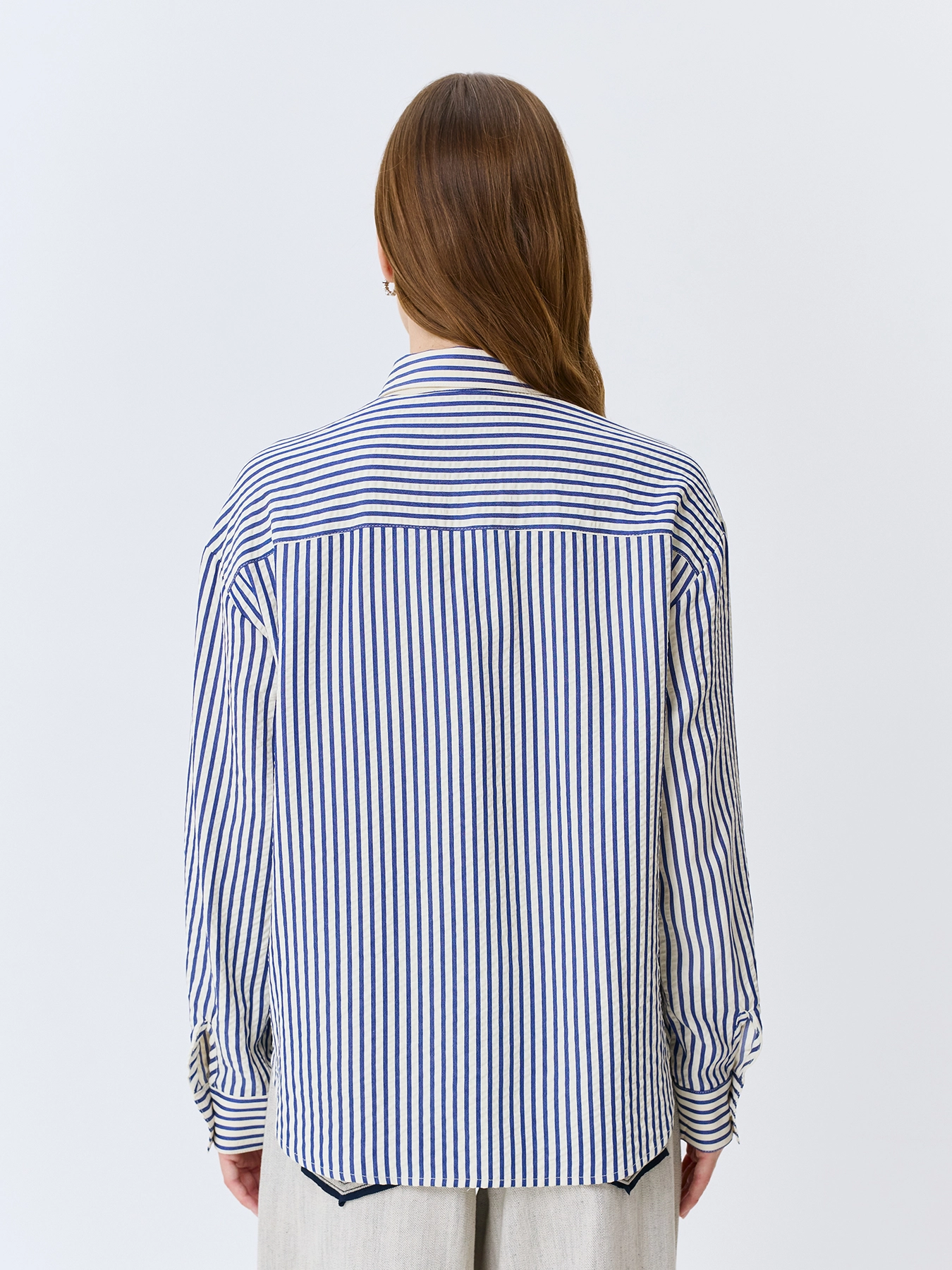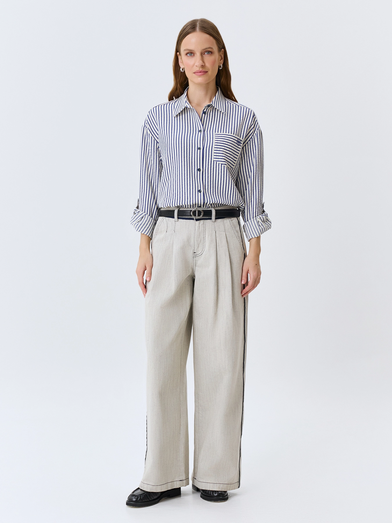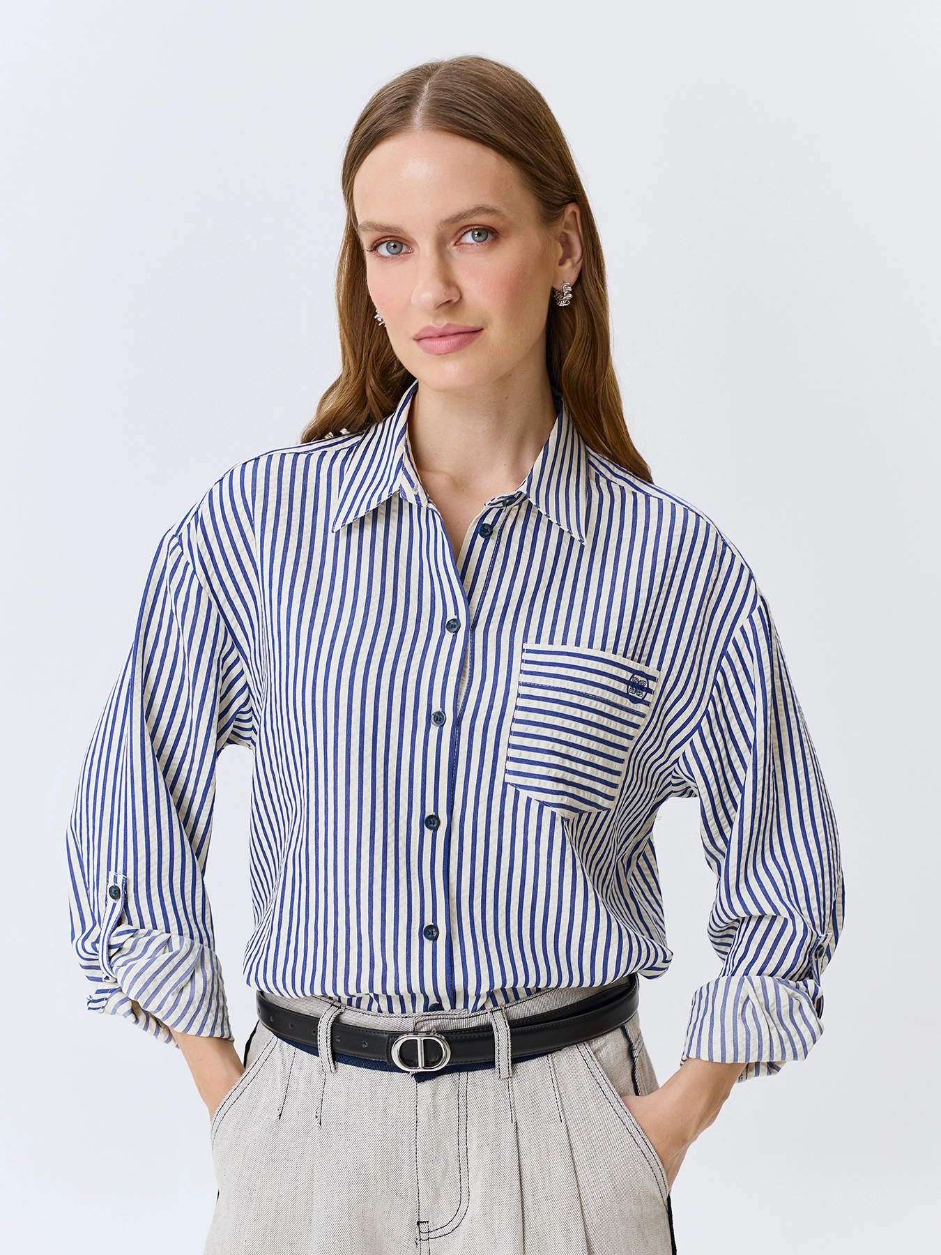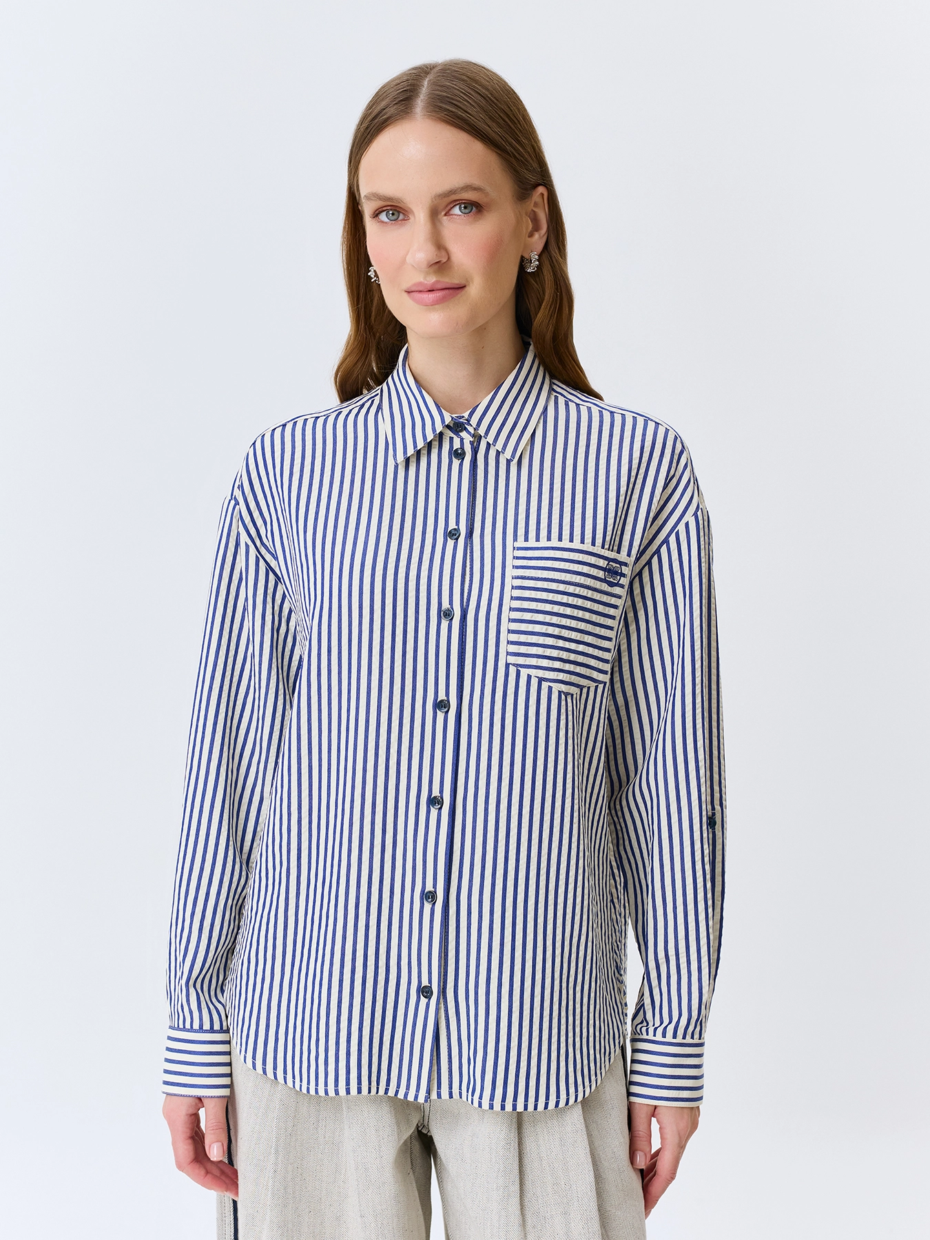 Блузка в тонкую полоску из смесовой вискозы. Прямой силуэт. Отложной воротник. Застежка на пуговицы. Накладной нагрудный карман дополнен деликатной вышивкой. Длинные рукава дополнены манжетами по низу и хлястиками для регулировки длины. Линия плеч немного спущена.