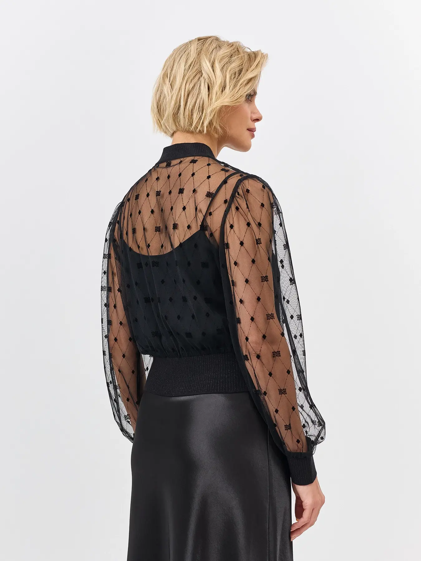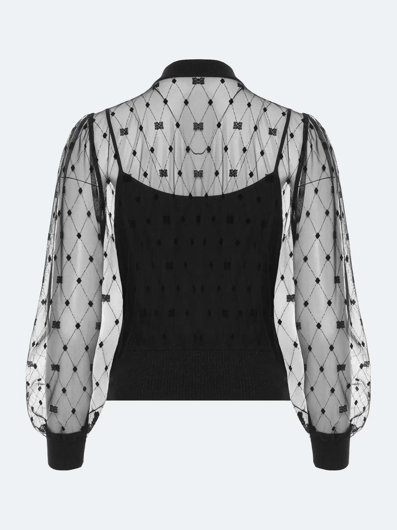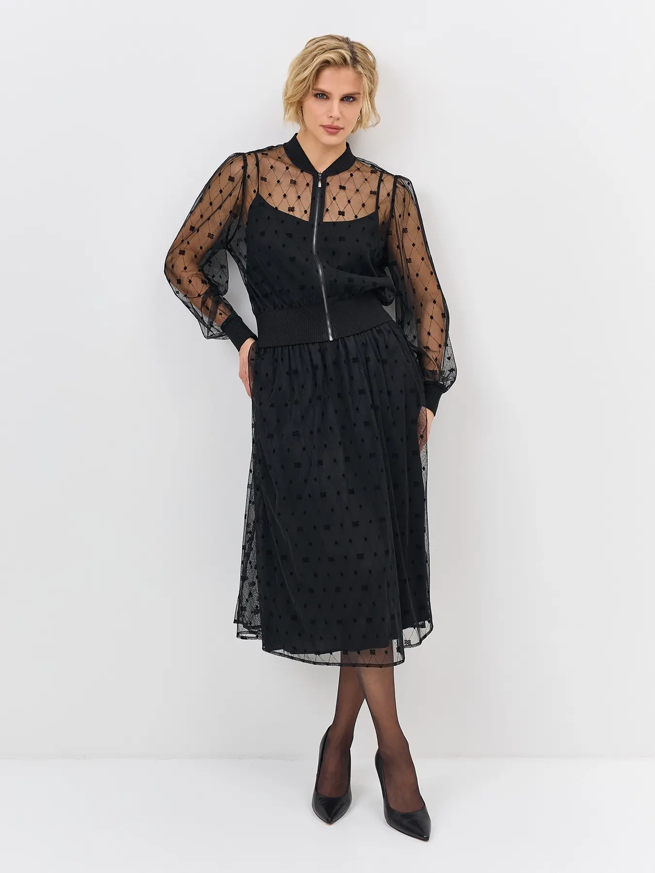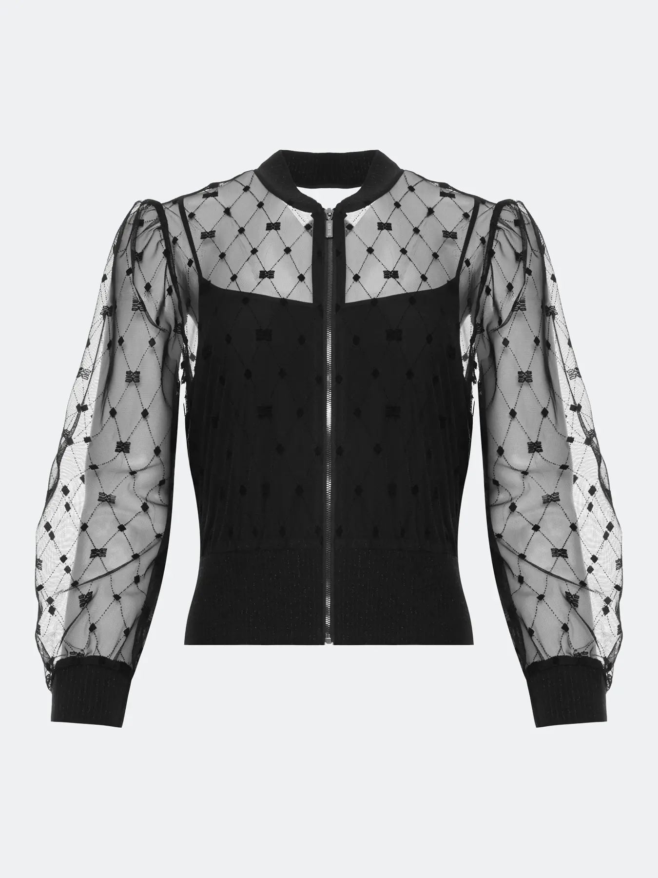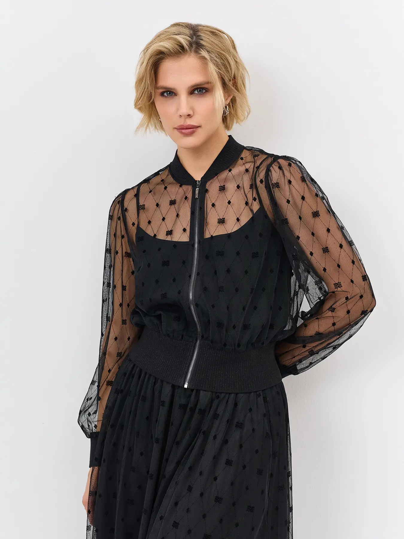 Эффектный бомбер из прозрачной брендированной сетки. Свободный силуэт. Воротник стойка. Объемные длинные рукава с манжетами по низу. Застежка на молнию. Приталенная подкладка-топ из вискозы.