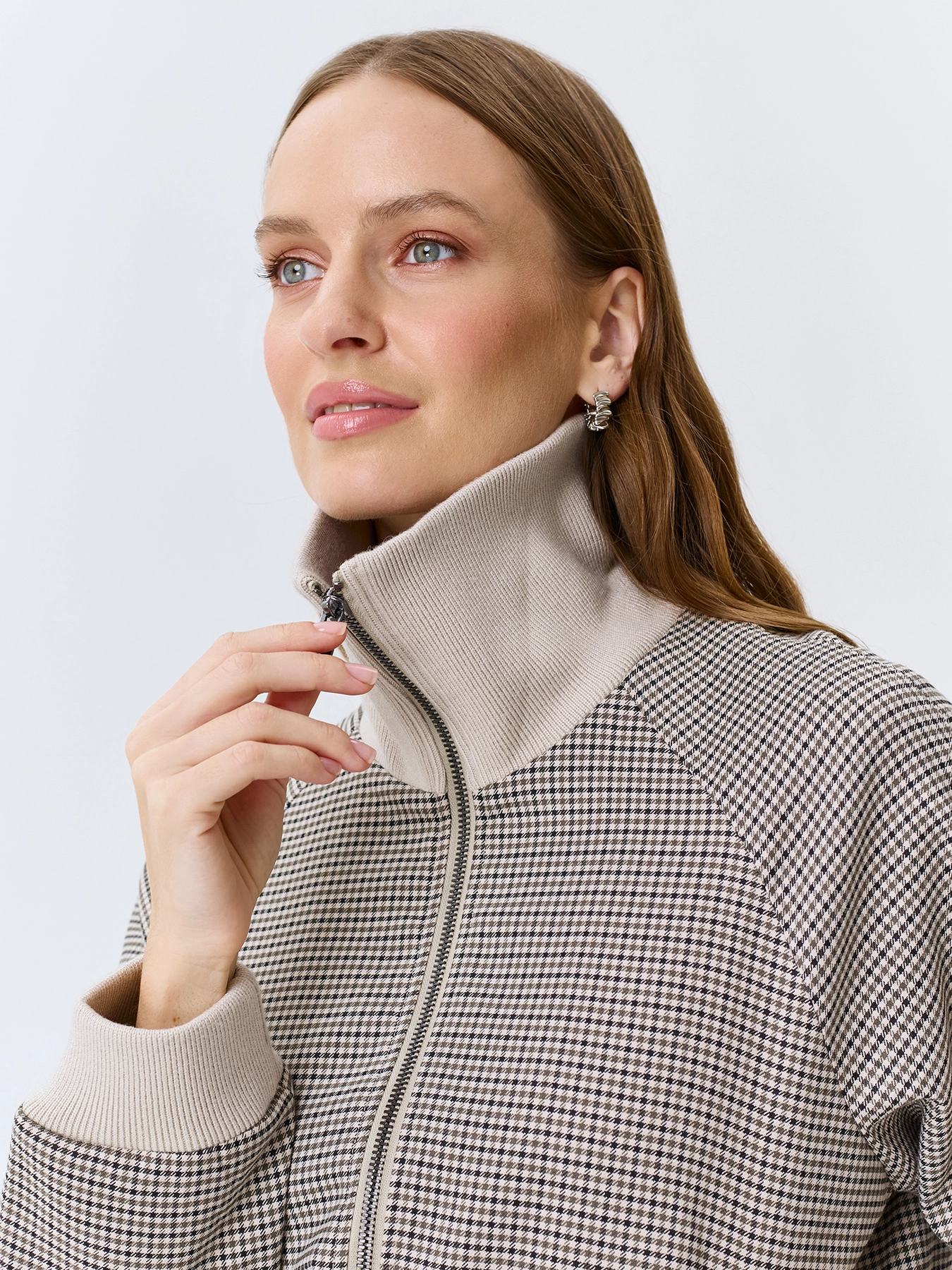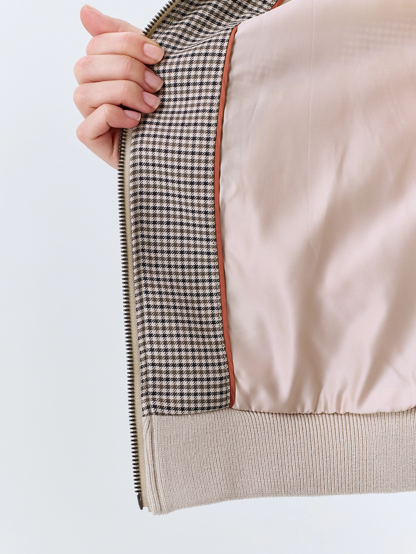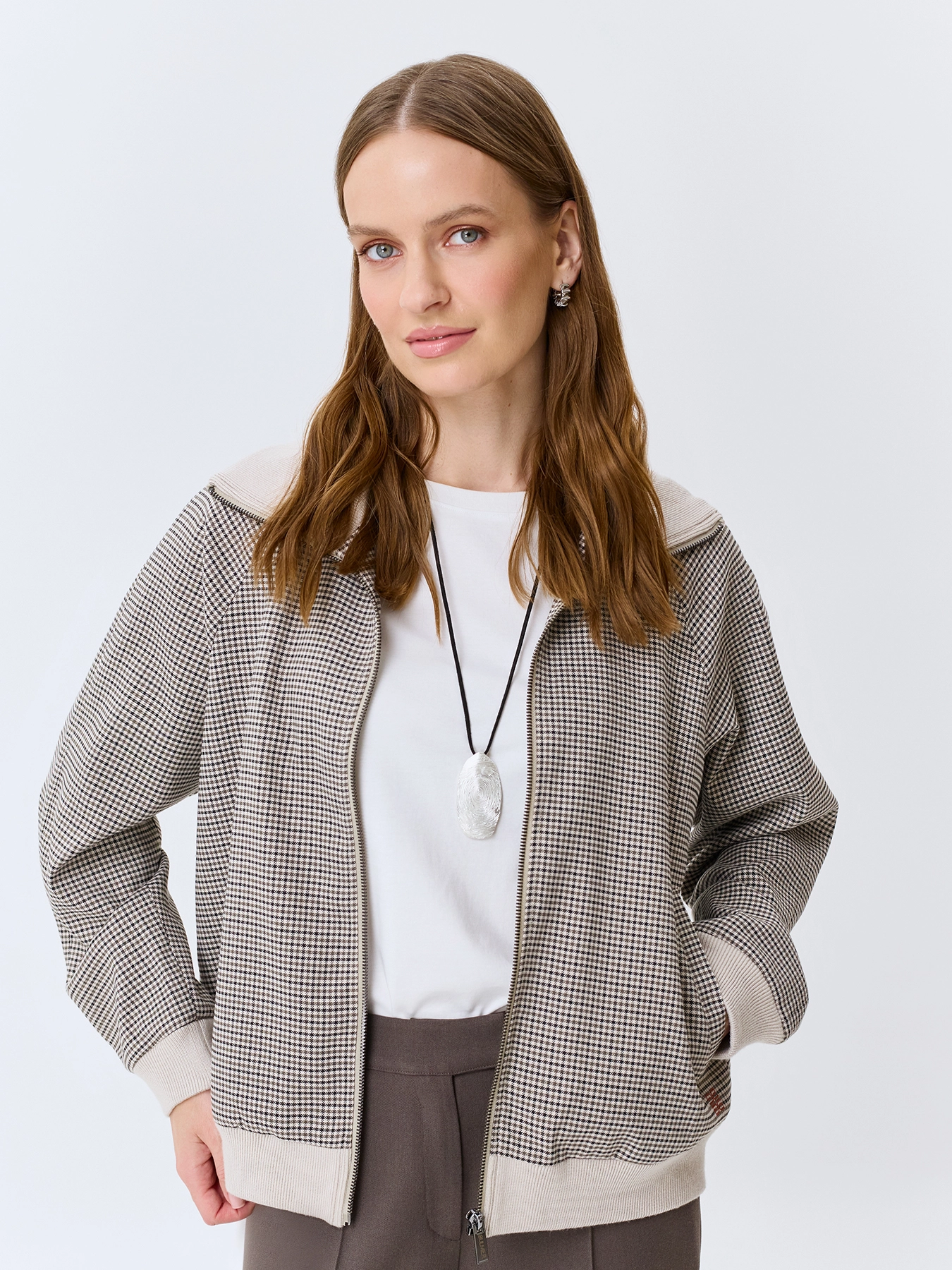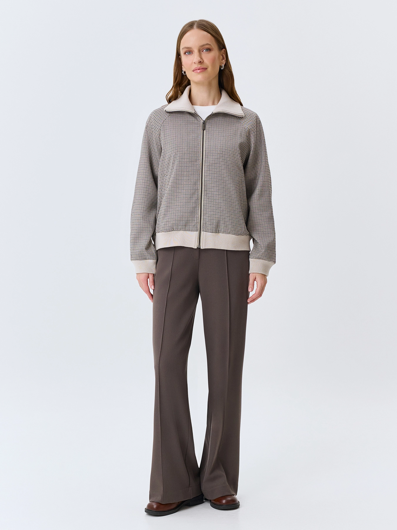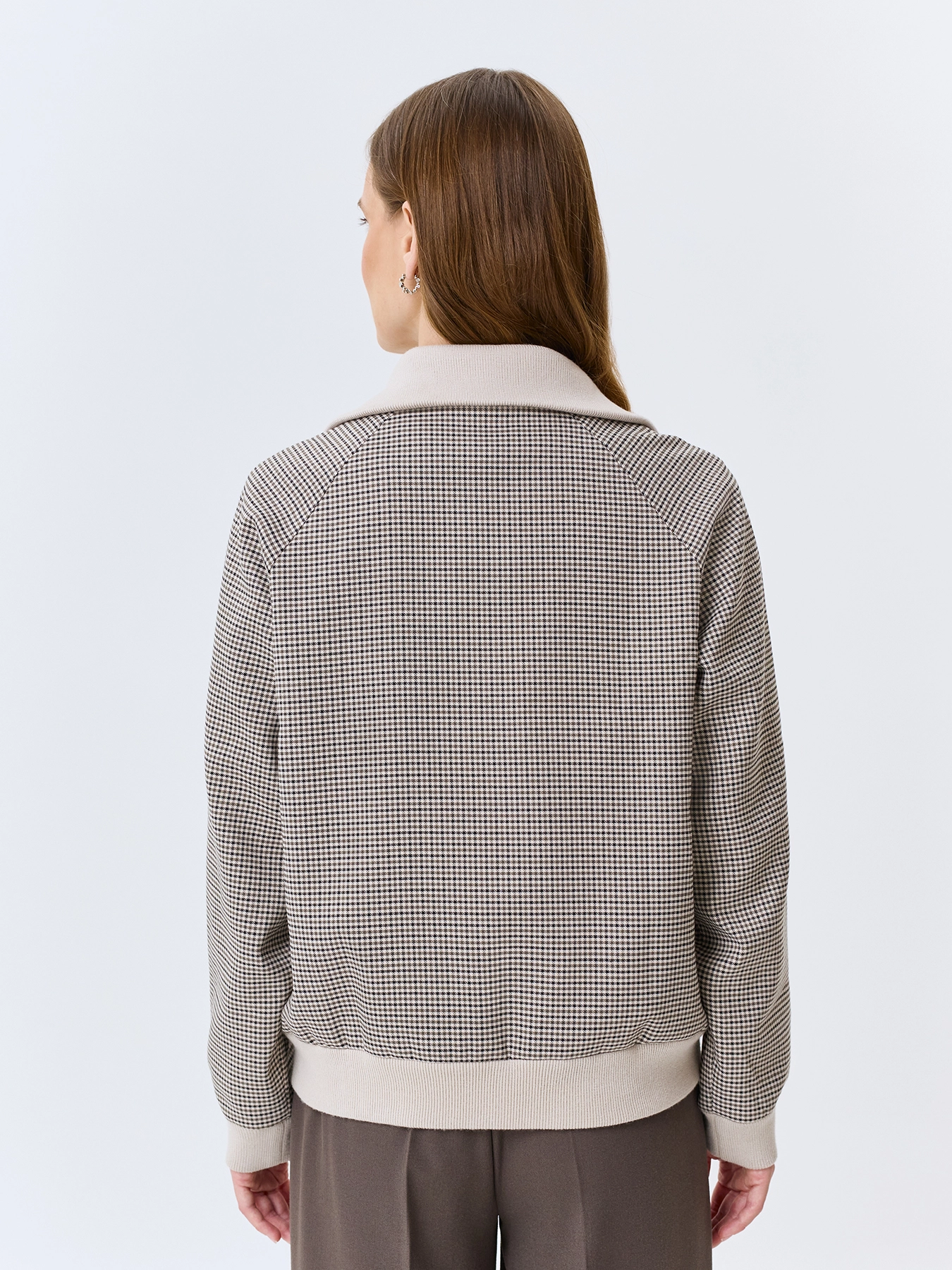 Жакет-бомбер в мелкую клетку из смесовой вискозы. Свободный силуэт. Трикотажный воротник высокая стойка. Застежка на молнию. Трикотажные манжеты по низу рукавов и изделия. Подкладка из смесовой вискозы.