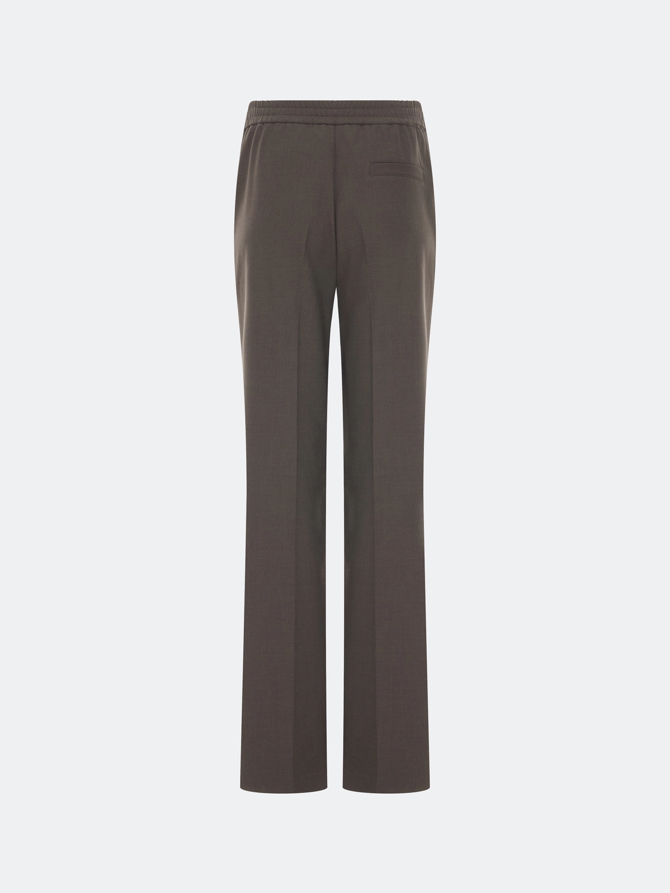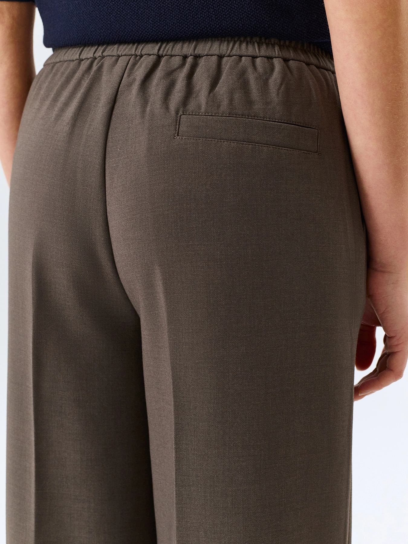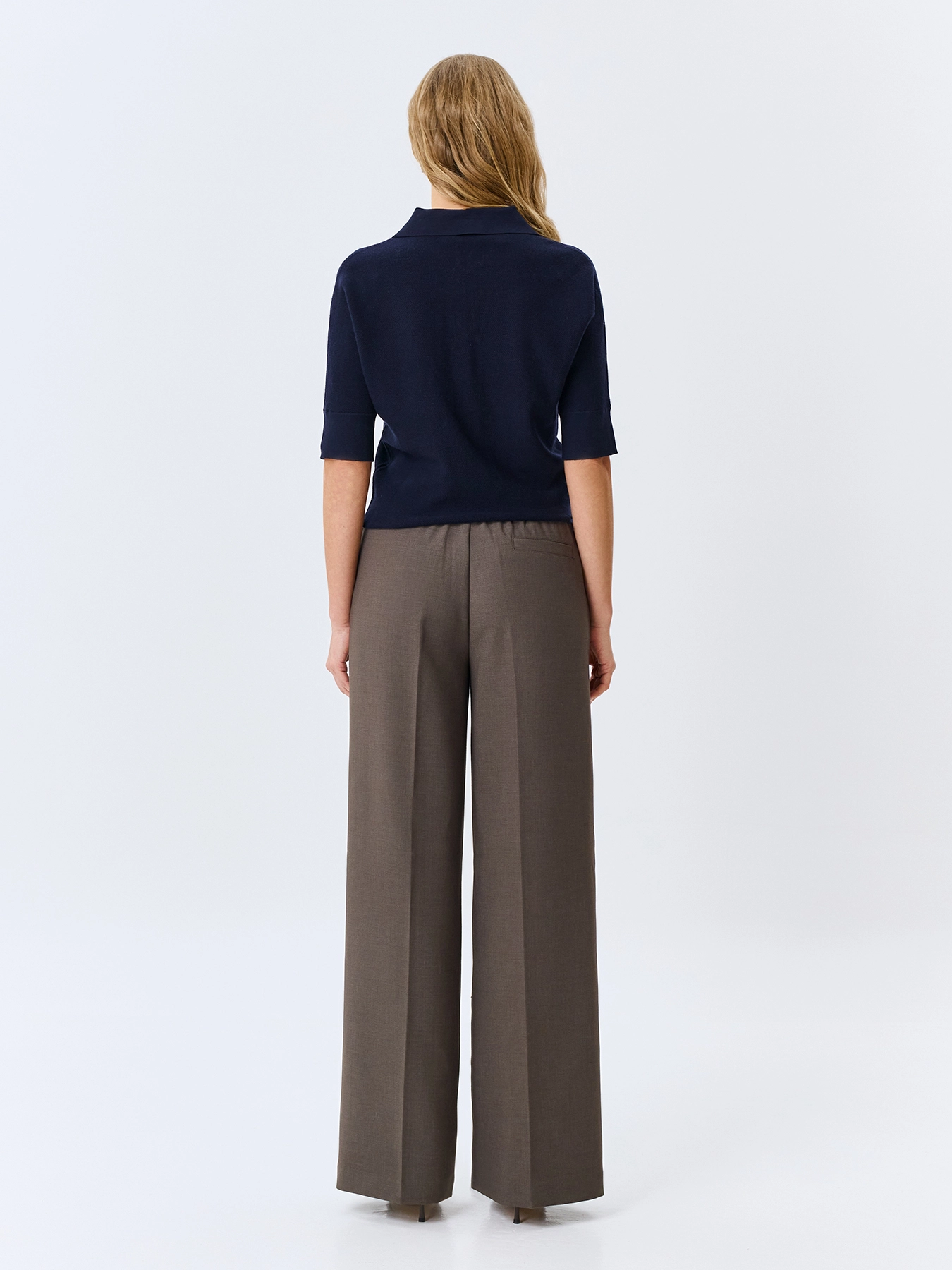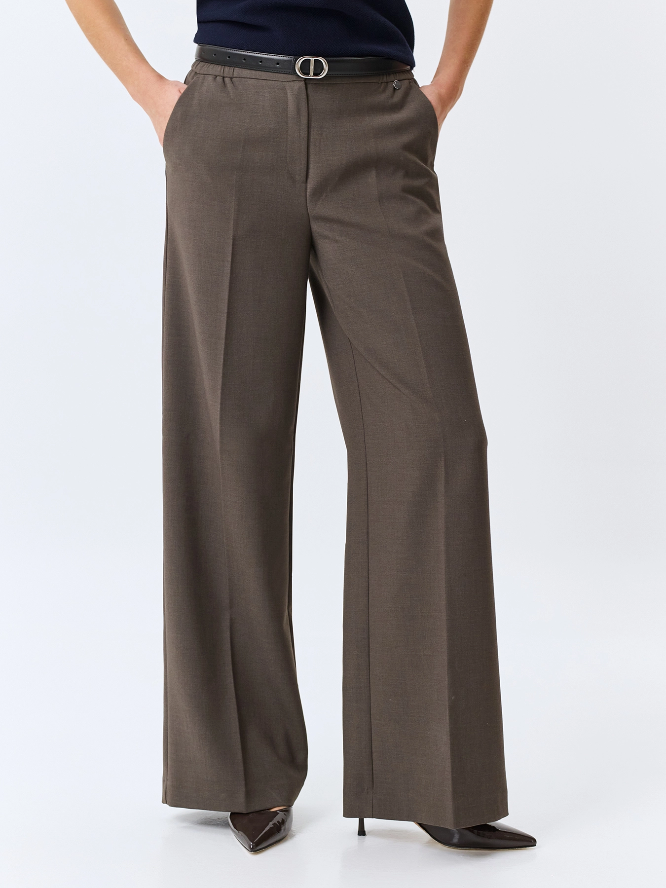 Классические брюки из смесовой вискозы с мягкими стрелками. Прямой силуэт. Застежка на молнию и пуговицу. Резинка по линии талии на спинке. Боковые карманы в швах.