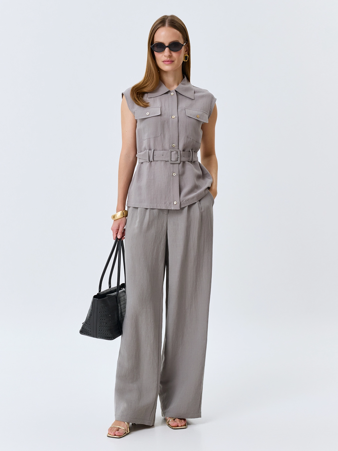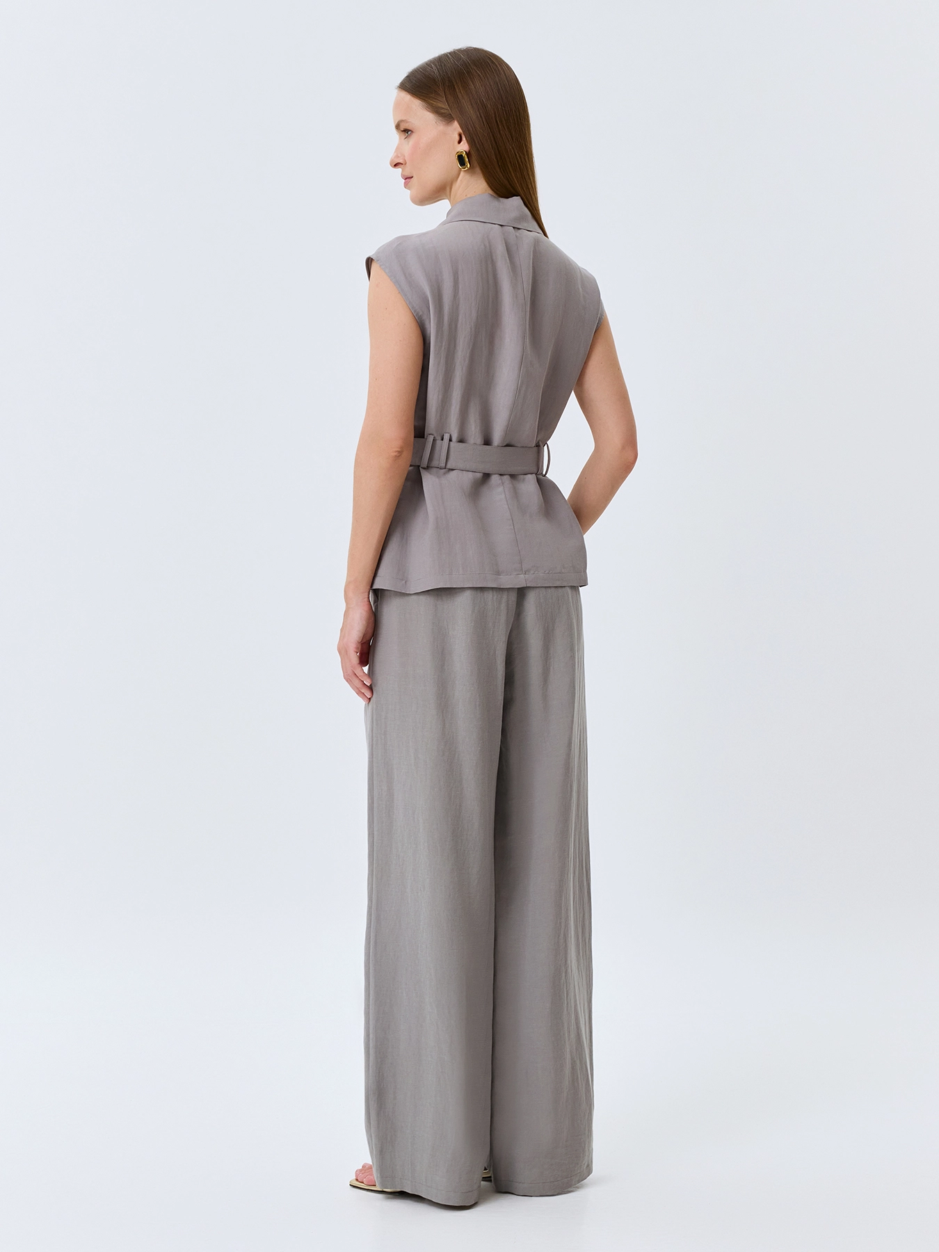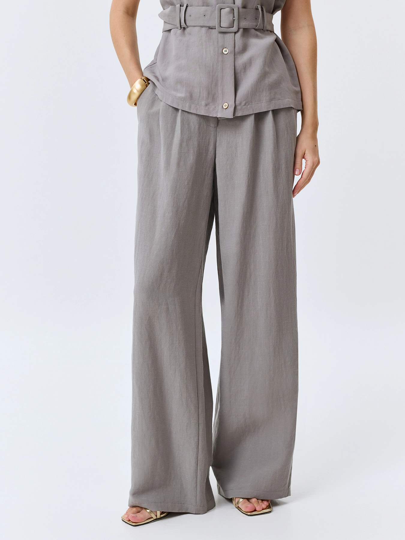 Брюки с мягкими складками из тенселя. Свободный силуэт. Застежка на молнию и пуговицу. Резинка по линии талии по спинке. Боковые карманы в швах. В составе лен. Комплект с 4267366.