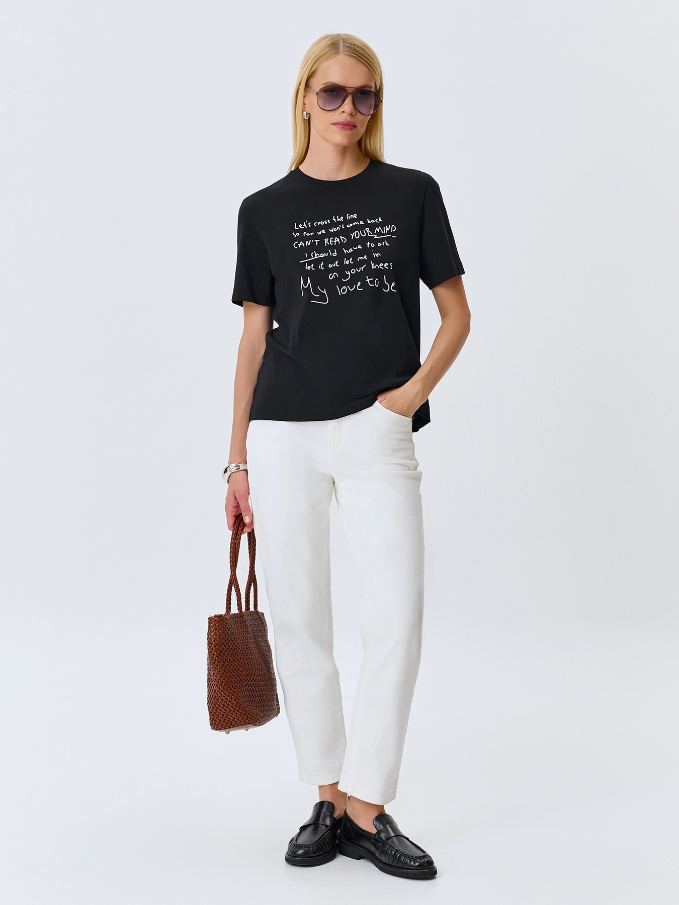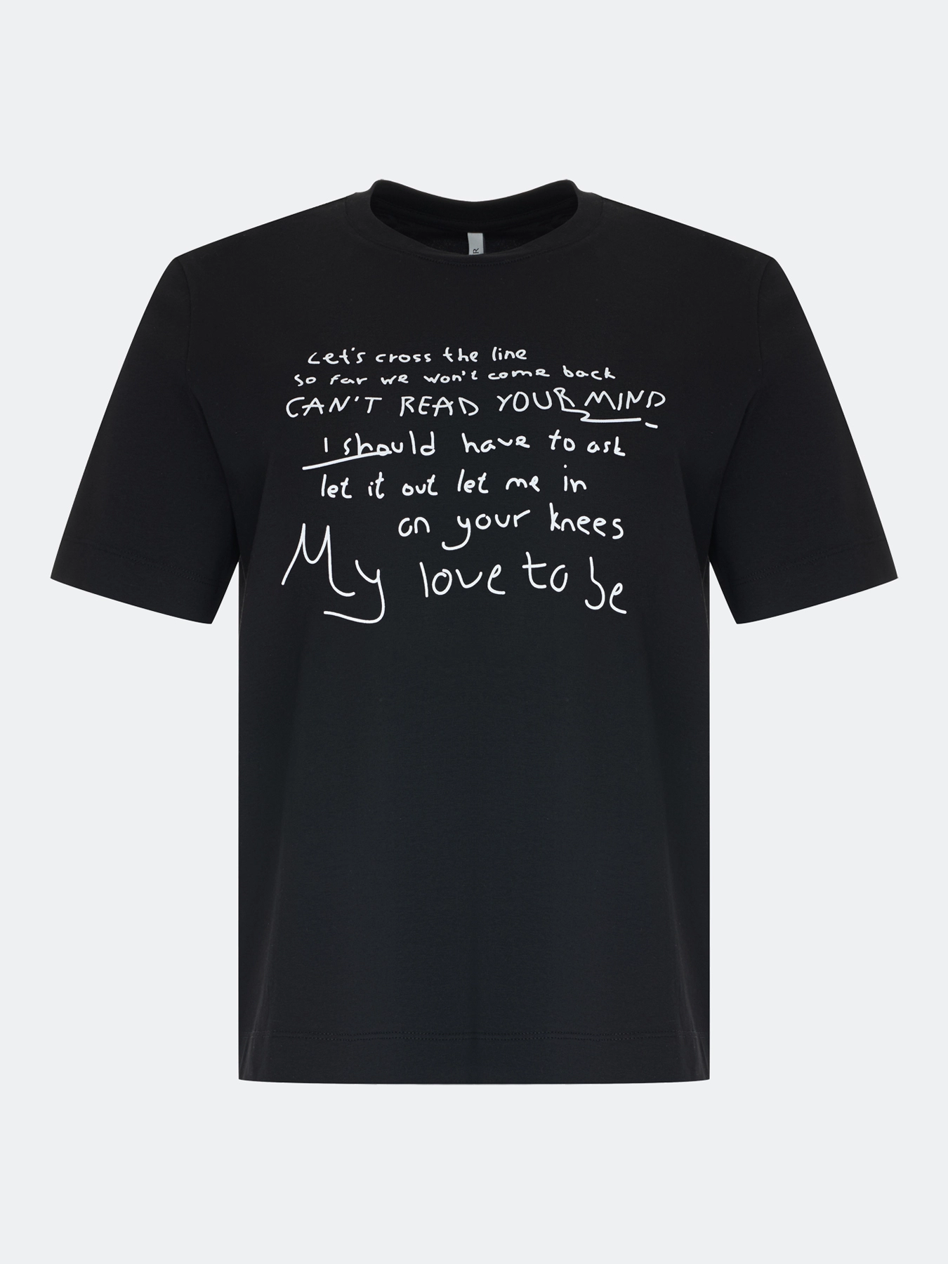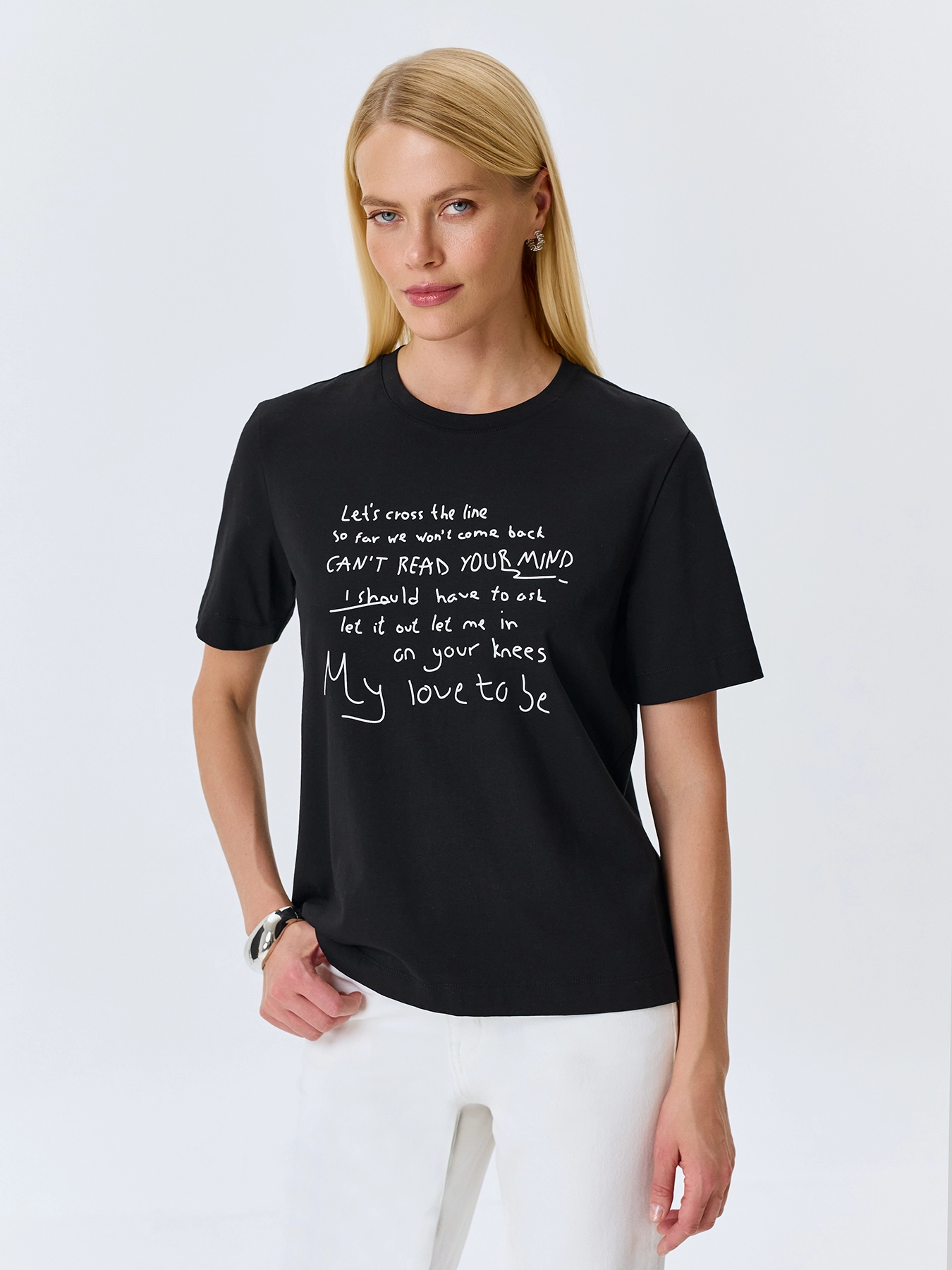 Футболка с контрастным шрифтовым принтом. Прямой силуэт. Круглый вырез. Короткие втачные рукава. В составе хлопок.