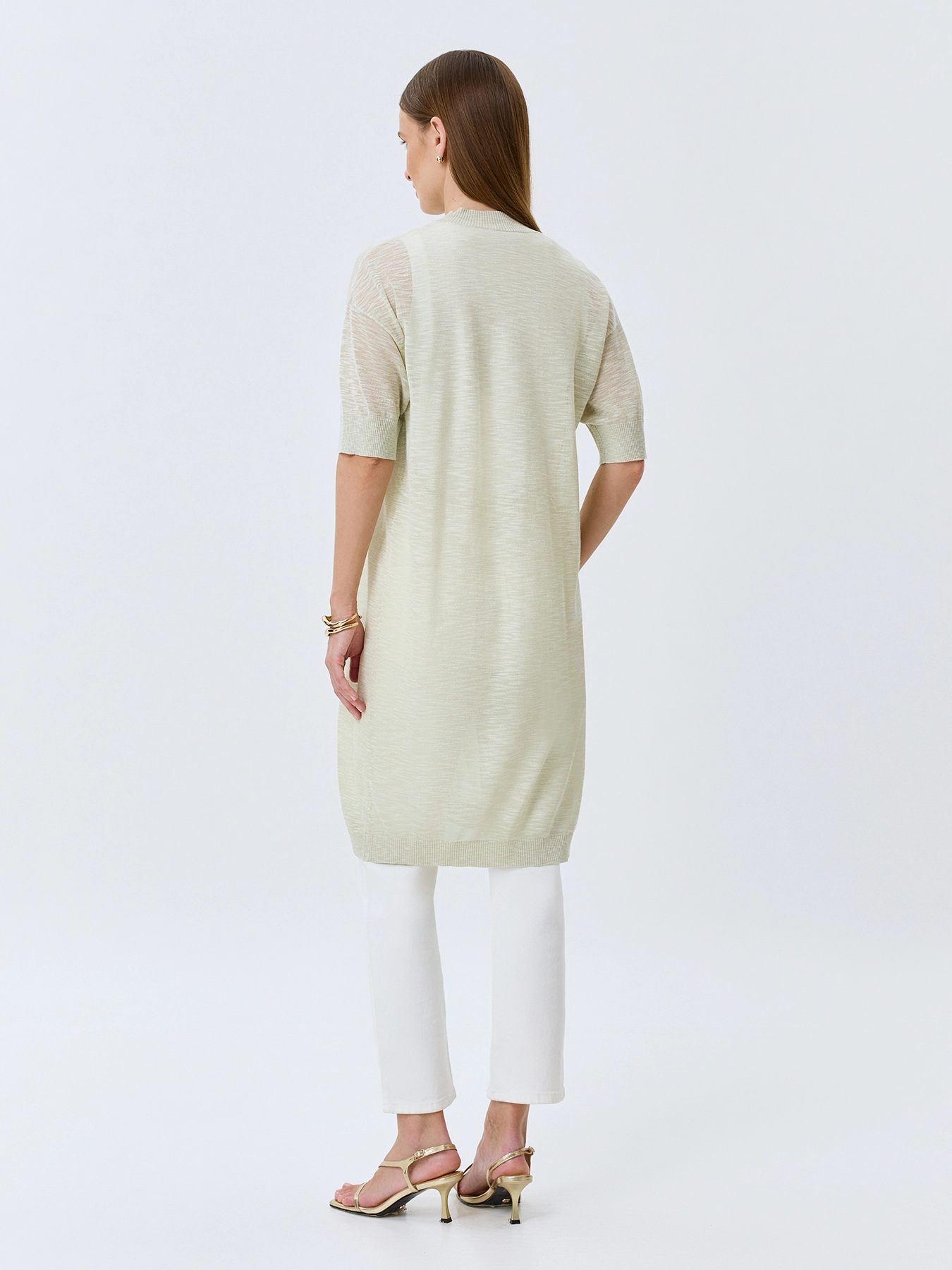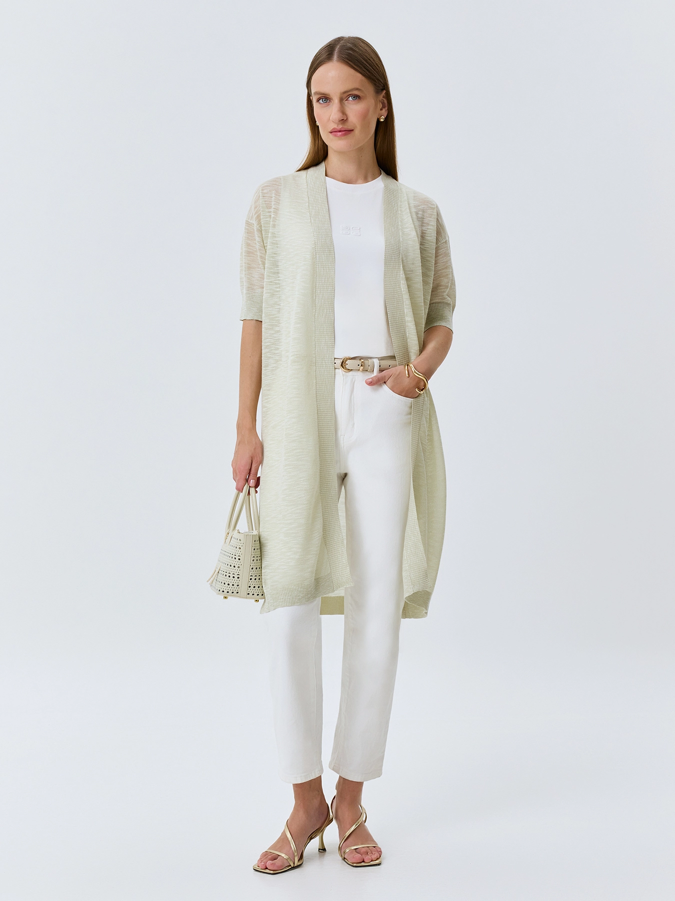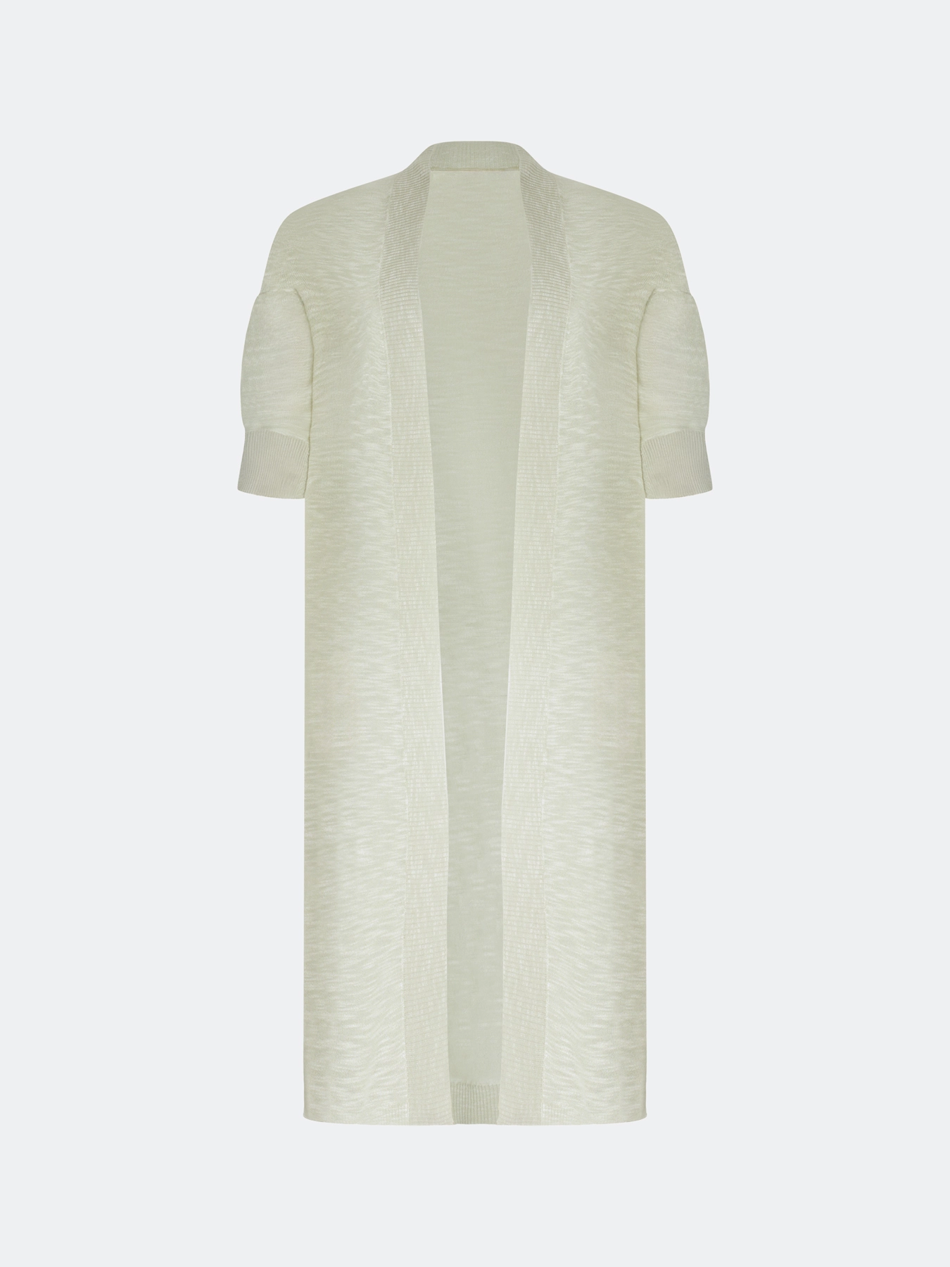 Вязаный ажурный кардиган из смесовой вискозы. Свободный силуэт. V-образный вырез. Спущенная линия плеч и укороченные рукава с манжетами по низу.
