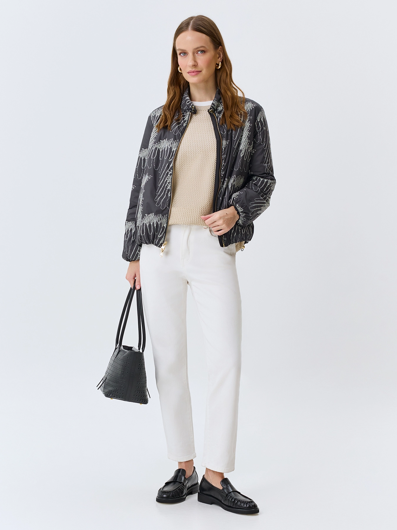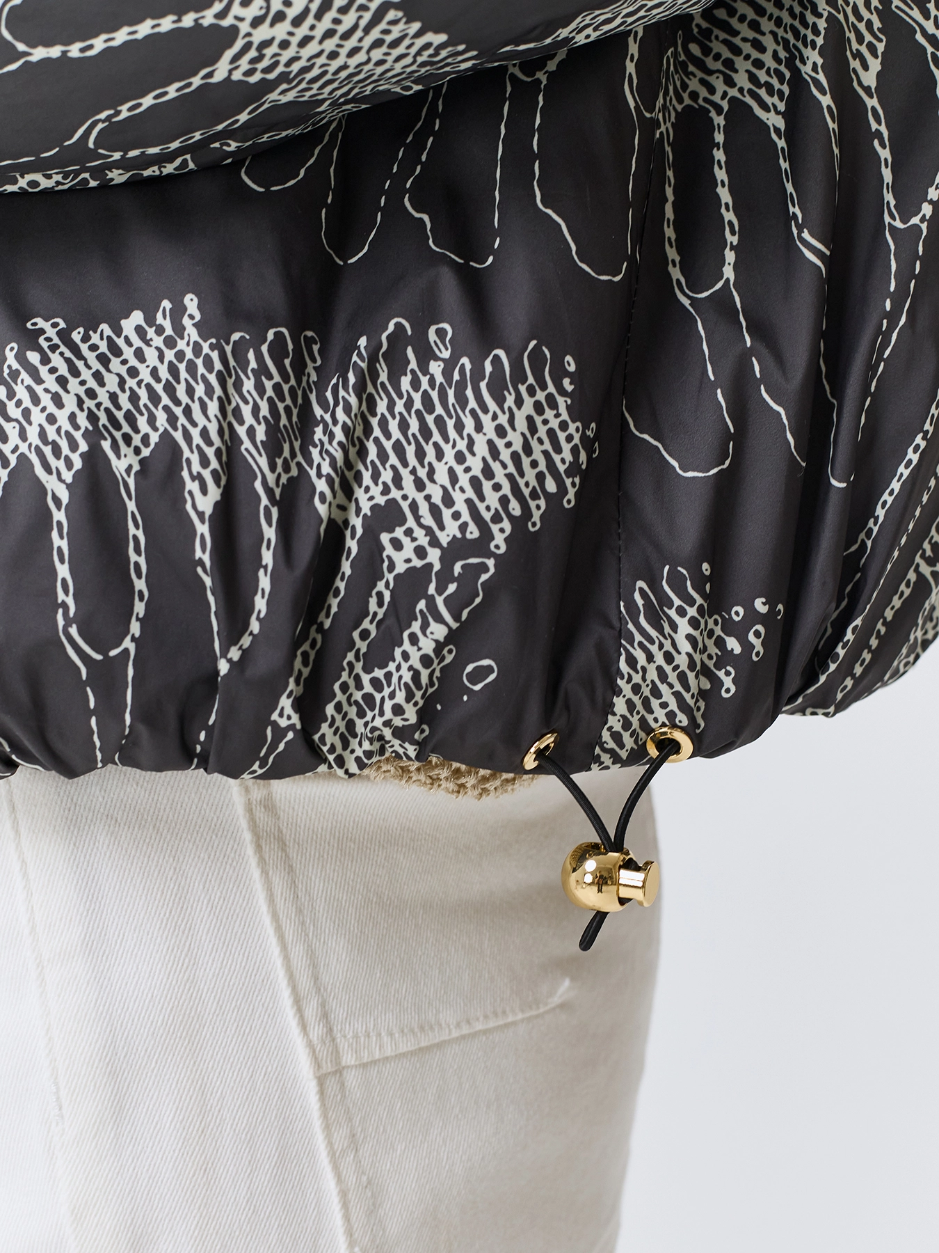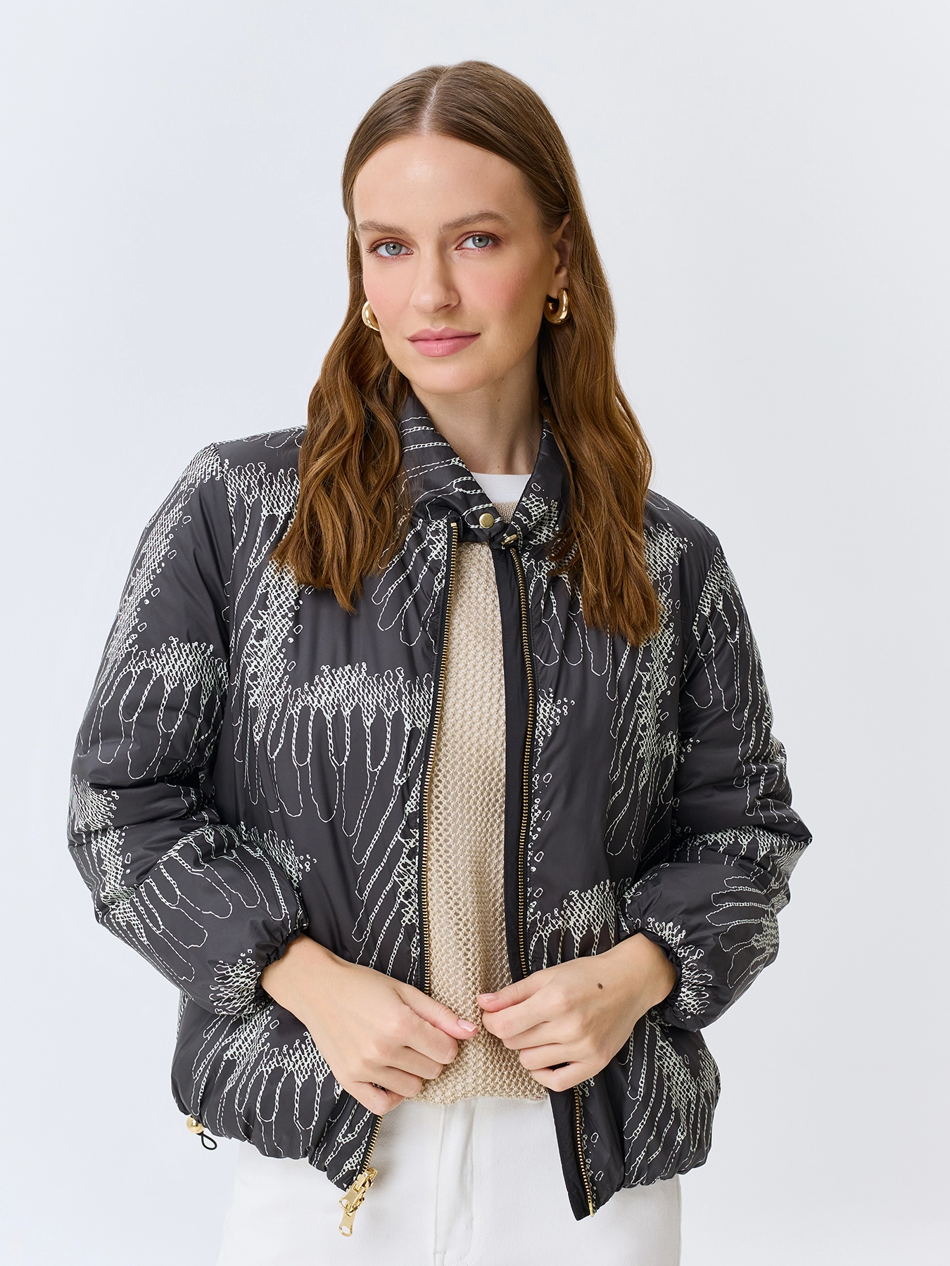 Двусторонняя куртка с легким утеплителем с принтованной внешней стороной и однотонной внутренней. Воротник стойка. Застежка на металлическую молнию. Длинные втачные рукава с резинкой по низу. Боковые карманы на молнии. Утяжник по низу.