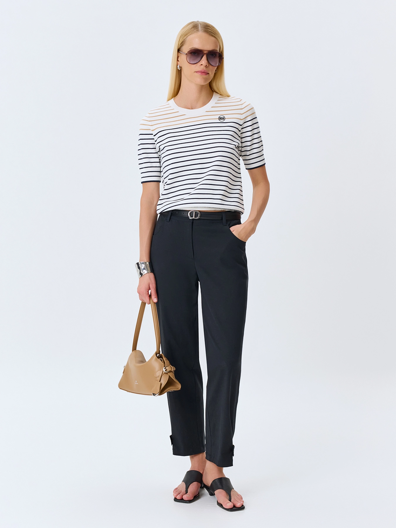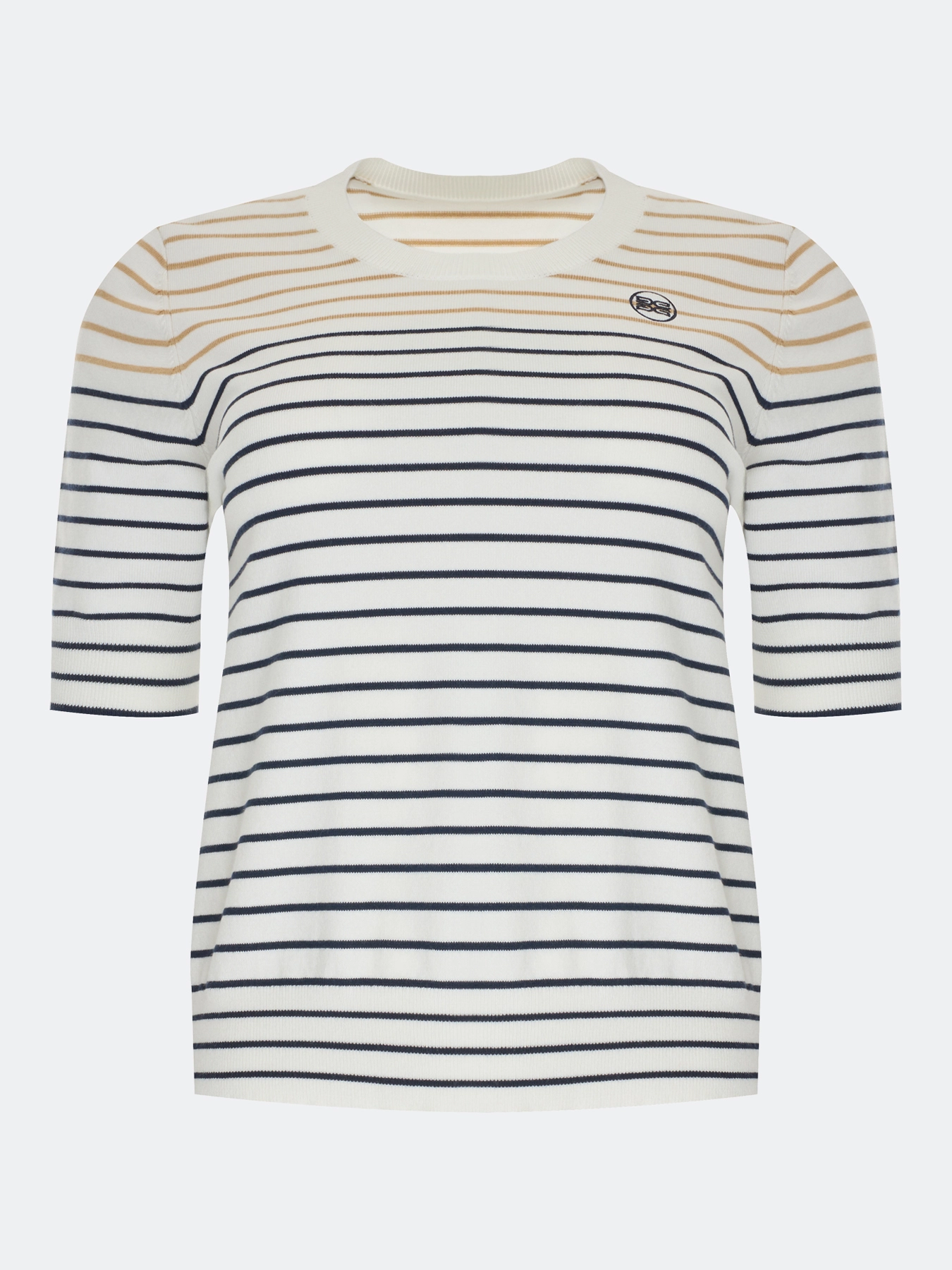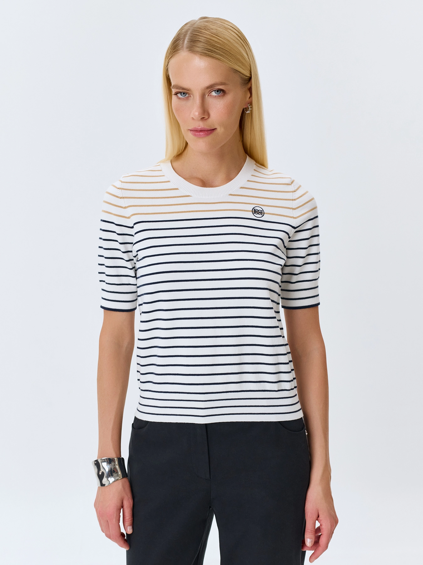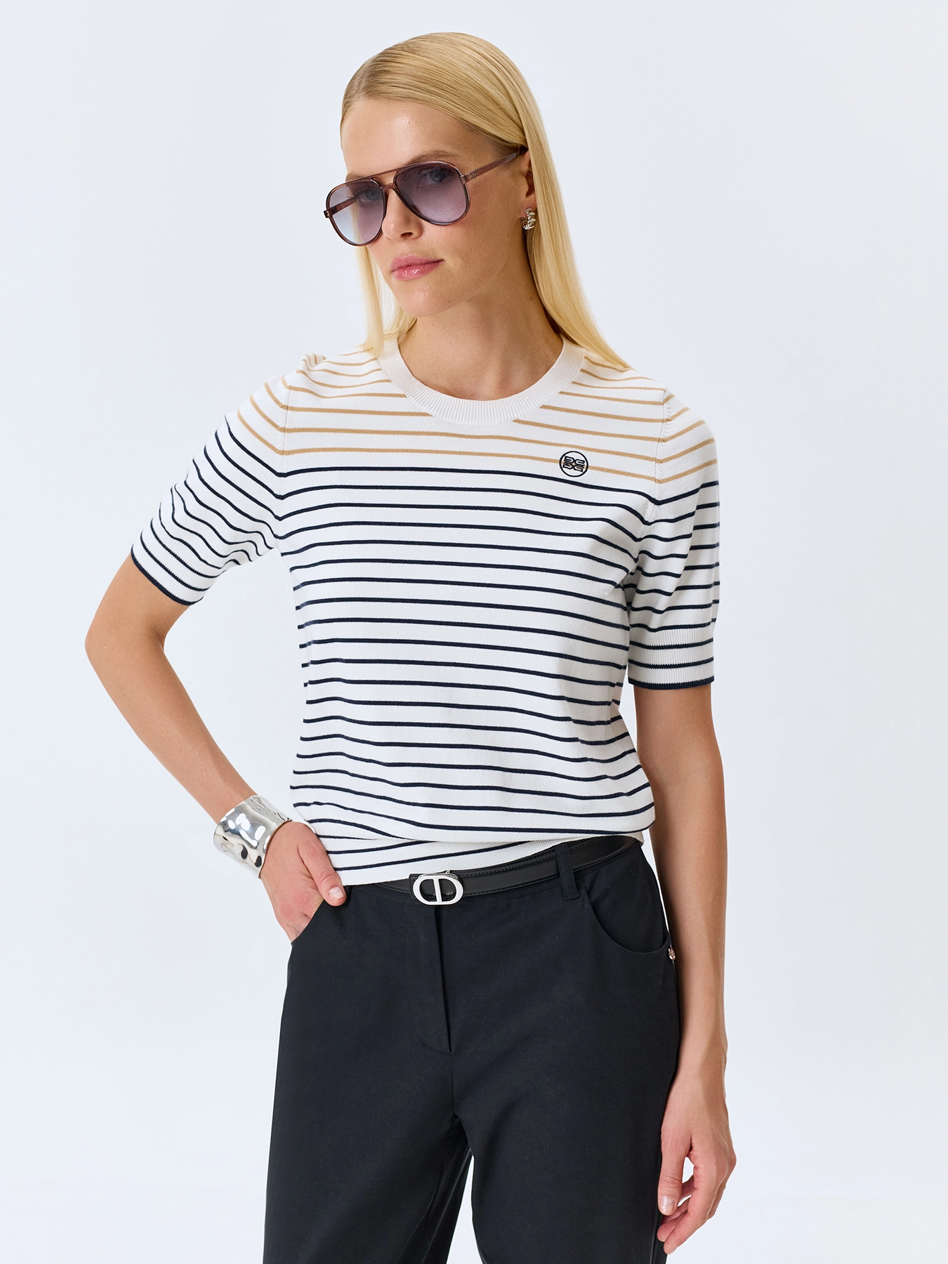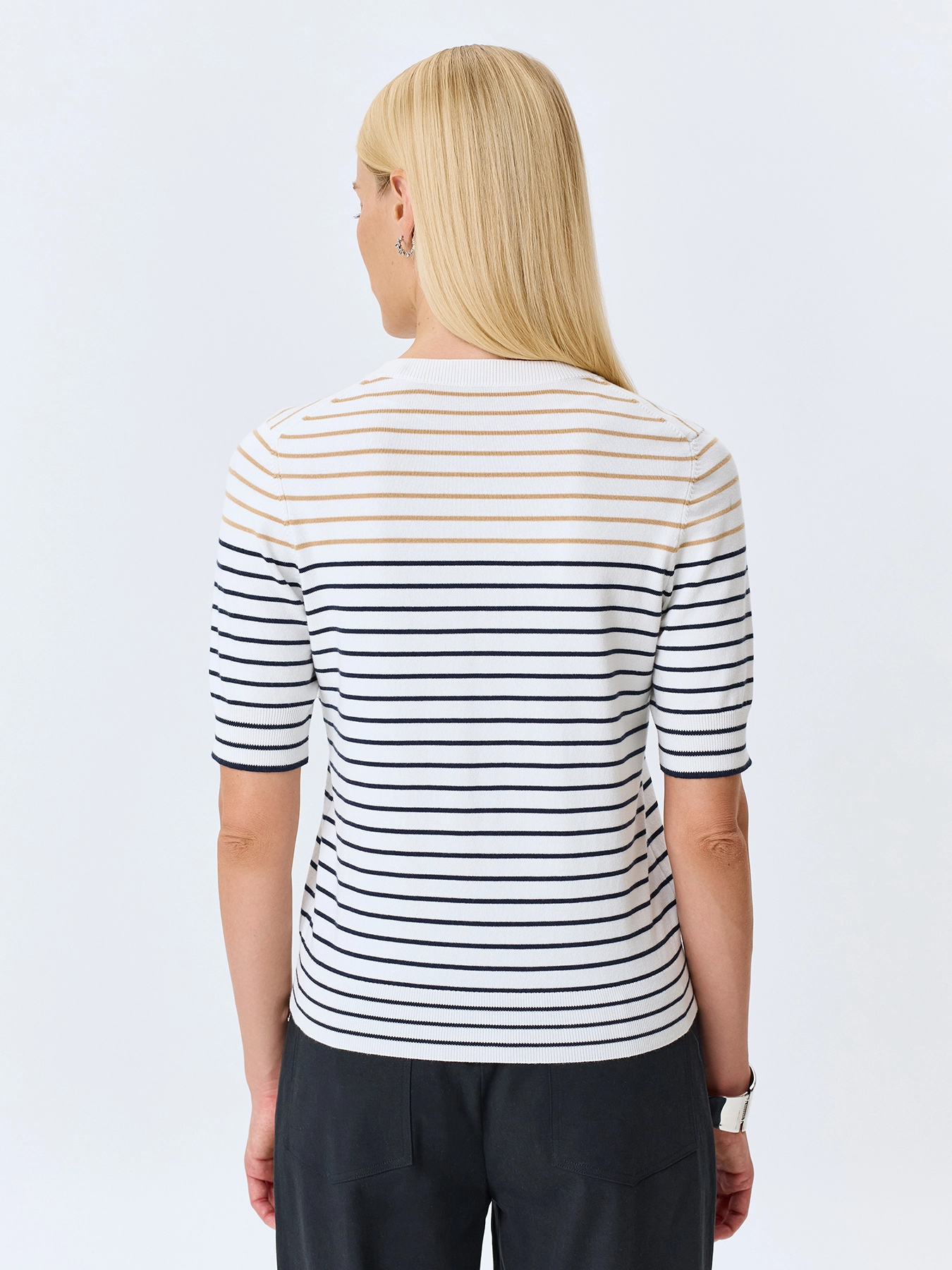 Вязаный джемпер из мягкого модала и хлопка в контрастную полоску. Прямой силуэт. Круглый вырез. Укороченные рукава и низ изделия оформлены рибом. Дополнен деликатной вышивкой.