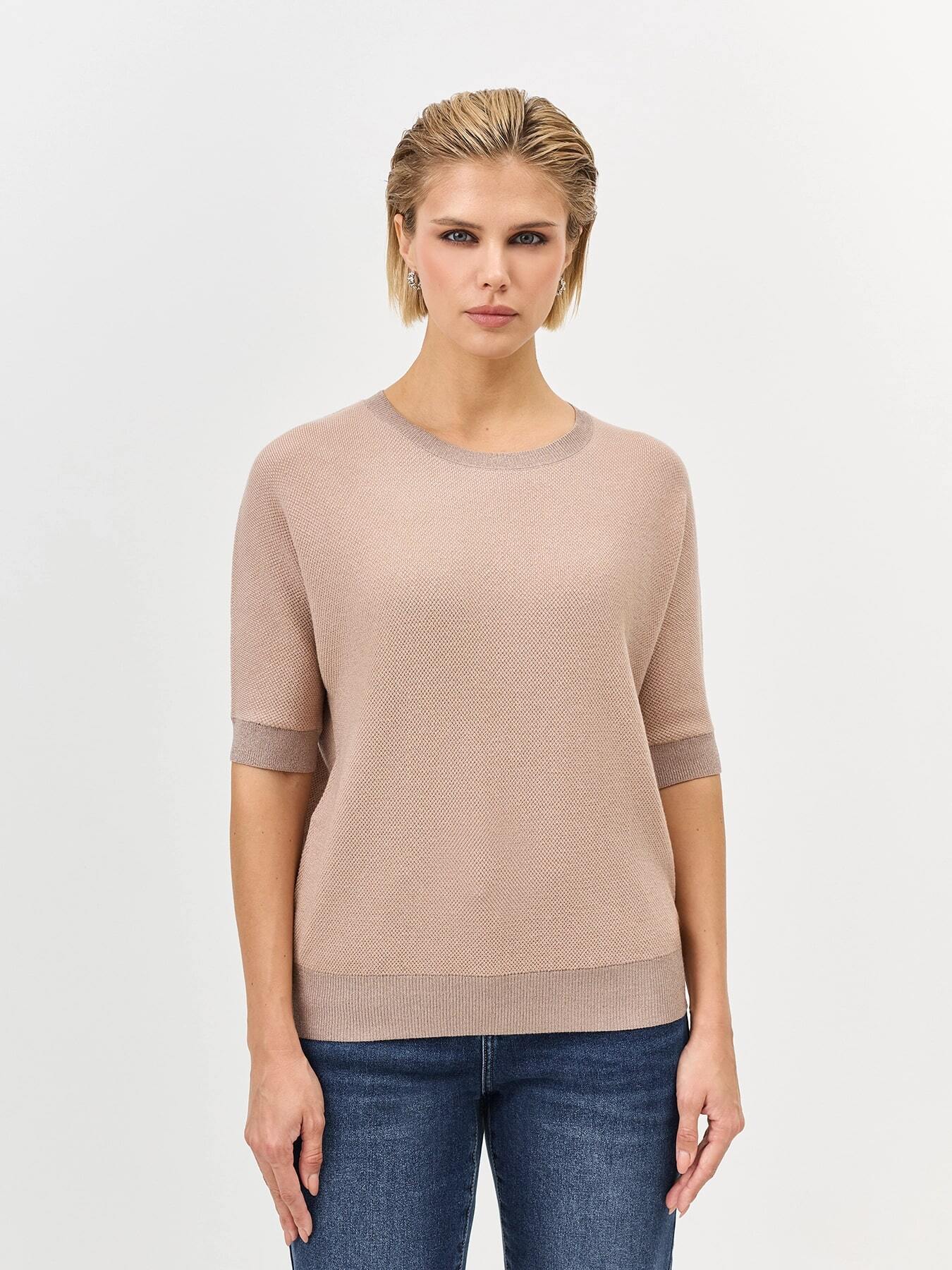 Свободный силуэт джемпера создает стильный и современный образ, а укороченные цельнокроенные рукава добавляют ему актуальности. Круглый вырез подчеркивает изящество шеи, а обработка горловины и манжеты с легким вкраплением люрекса придает джемперу особый шик. Деликатная аппликация на спинке в виде логотипа бренда добавляет модели индивидуальности и подчеркивает утонченный вкус. Этот базовый, но нарядный джемпер легко сочетается с другими элементами гардероба, позволяя создавать как повседневные, так и вечерние образы.