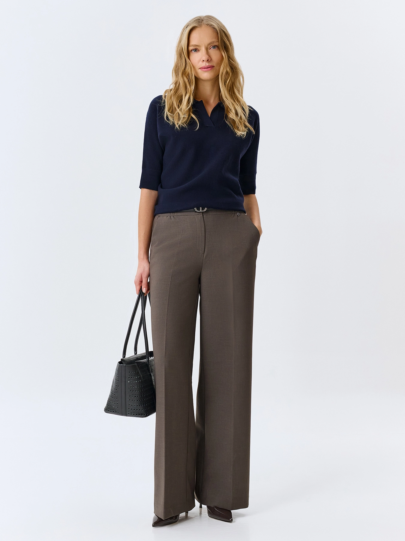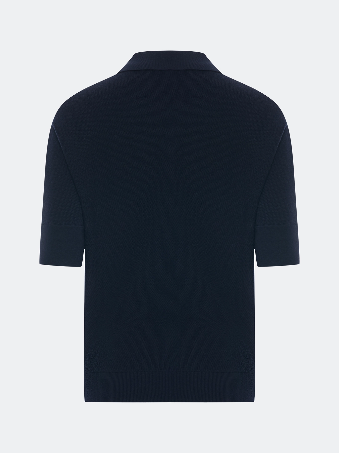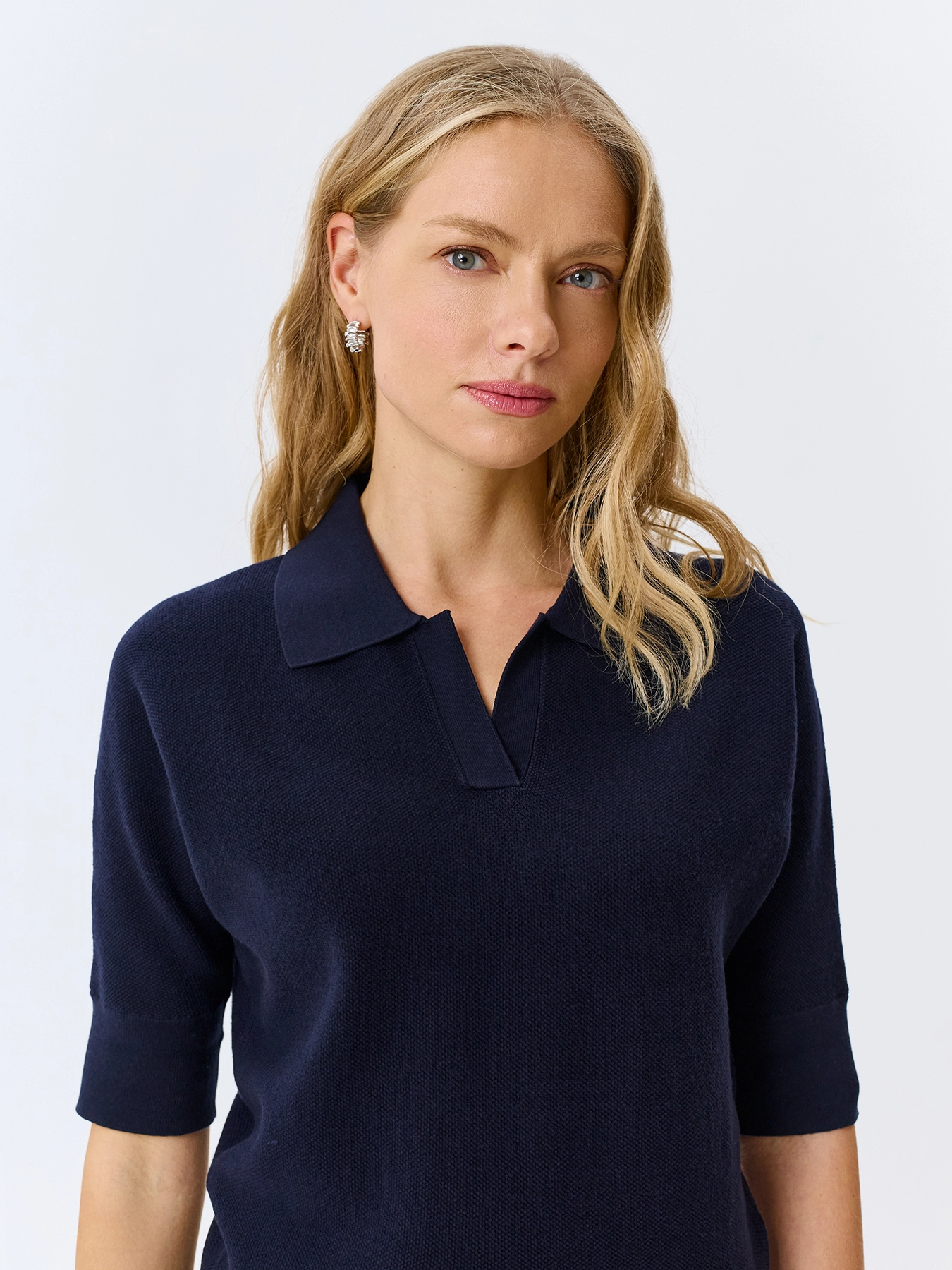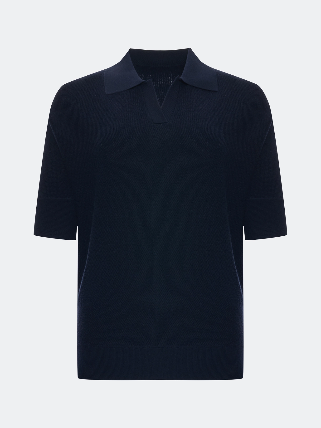 Джемпер поло с V-образным вырезом из смесового тенселя. Прямой силуэт. Отложной воротник с не глубоким V-образным вырезом. Укороченные цельнокроенные рукава. Риб по горловине, низу изделия и рукавов.