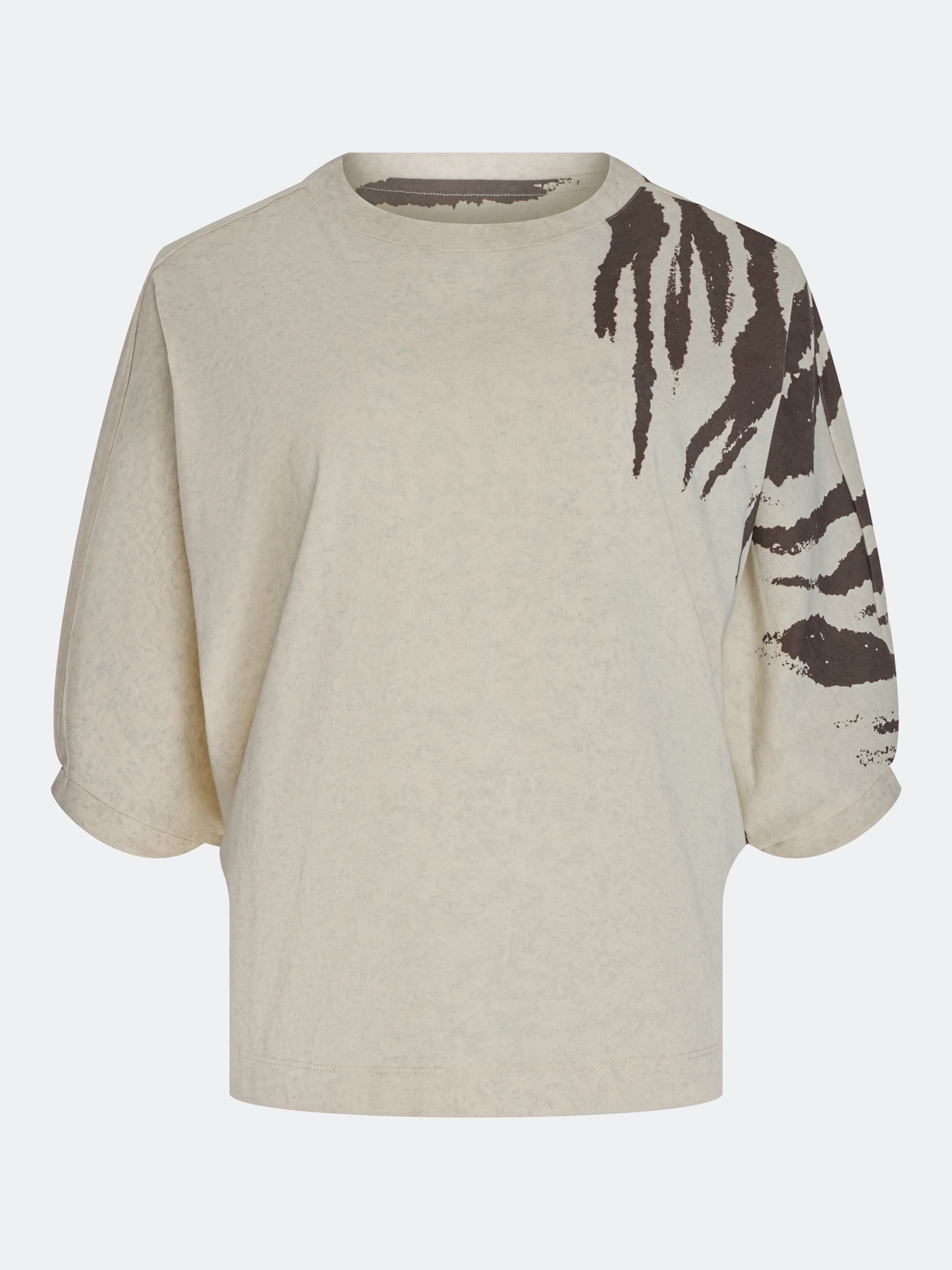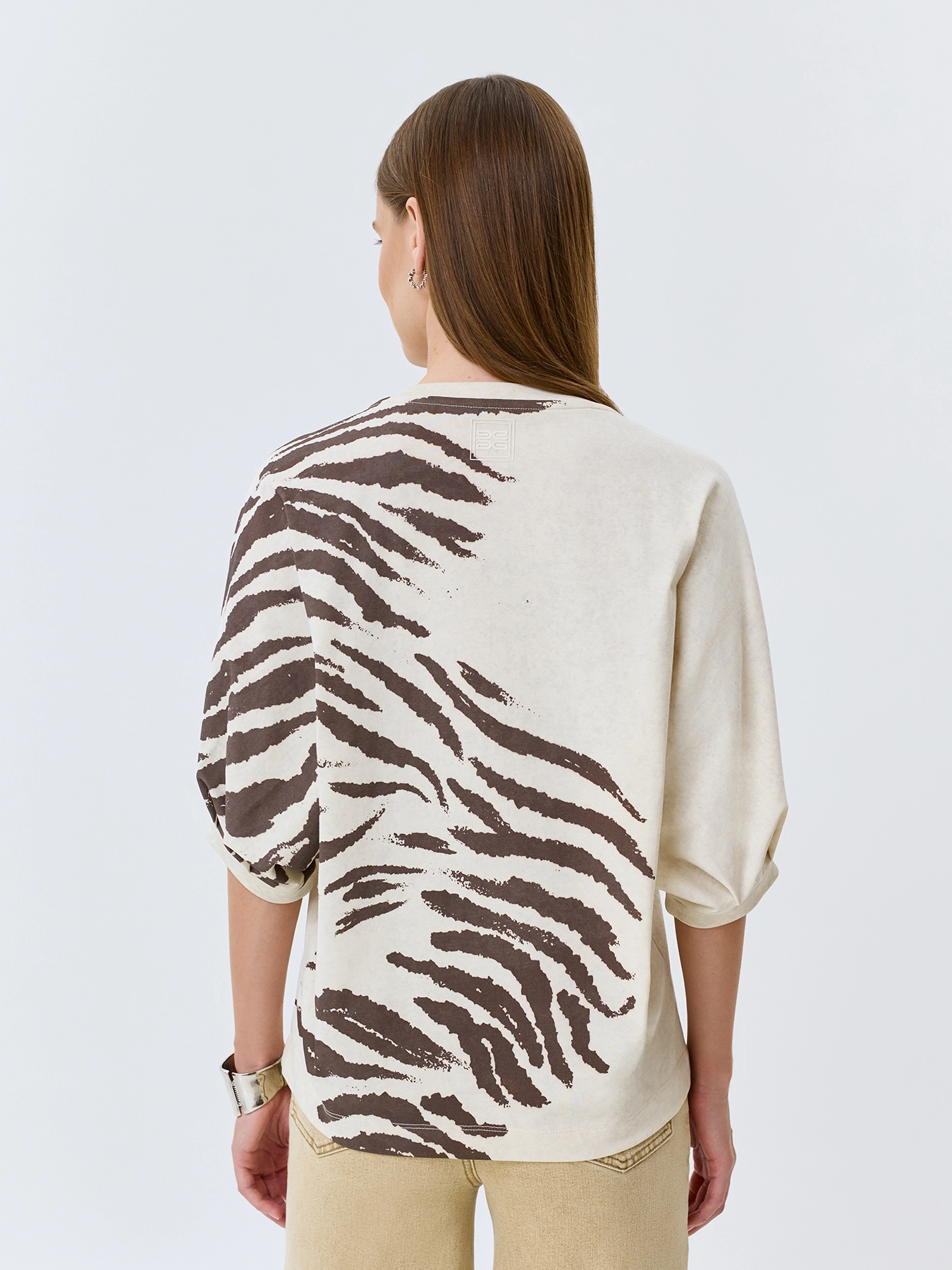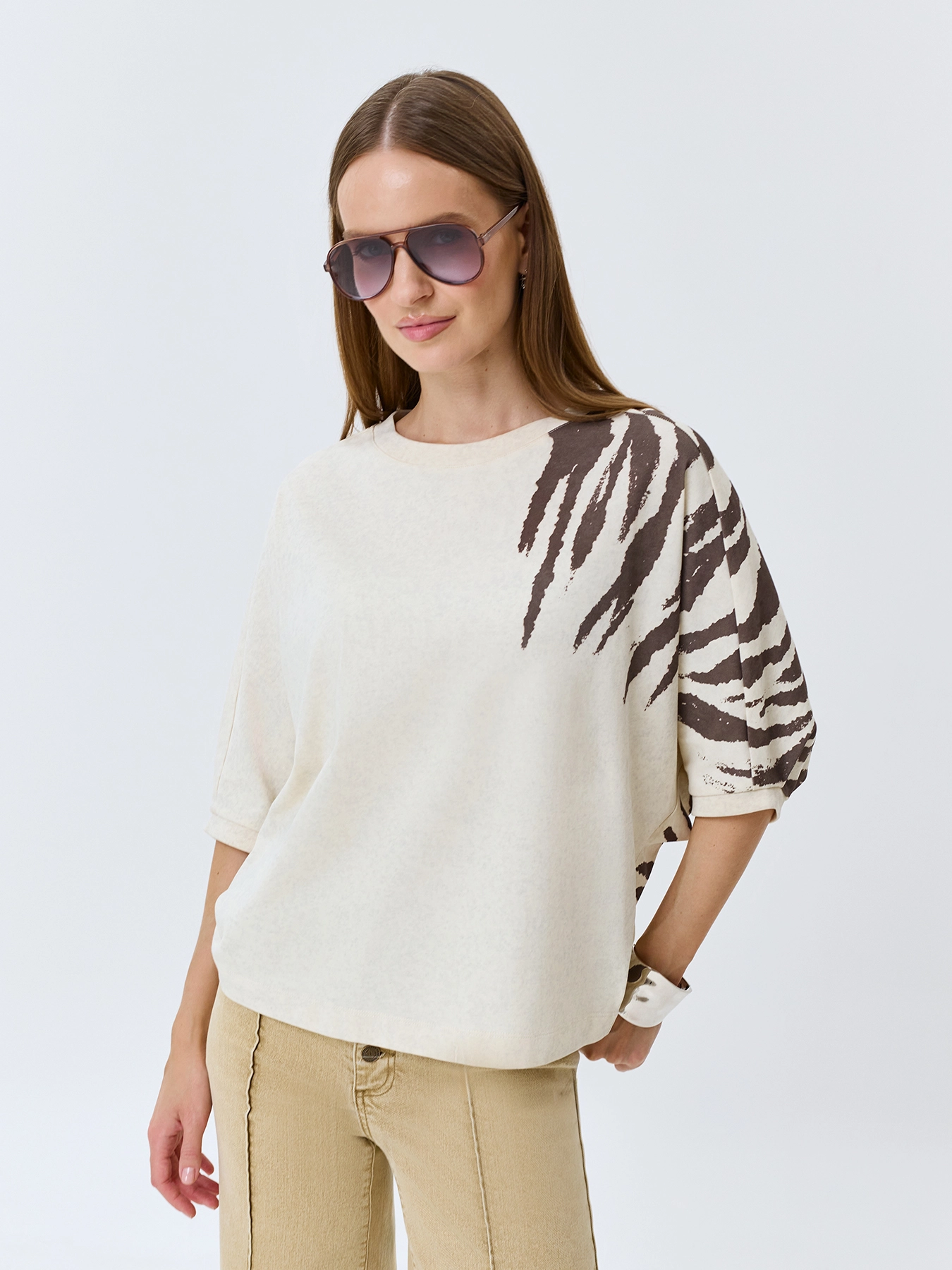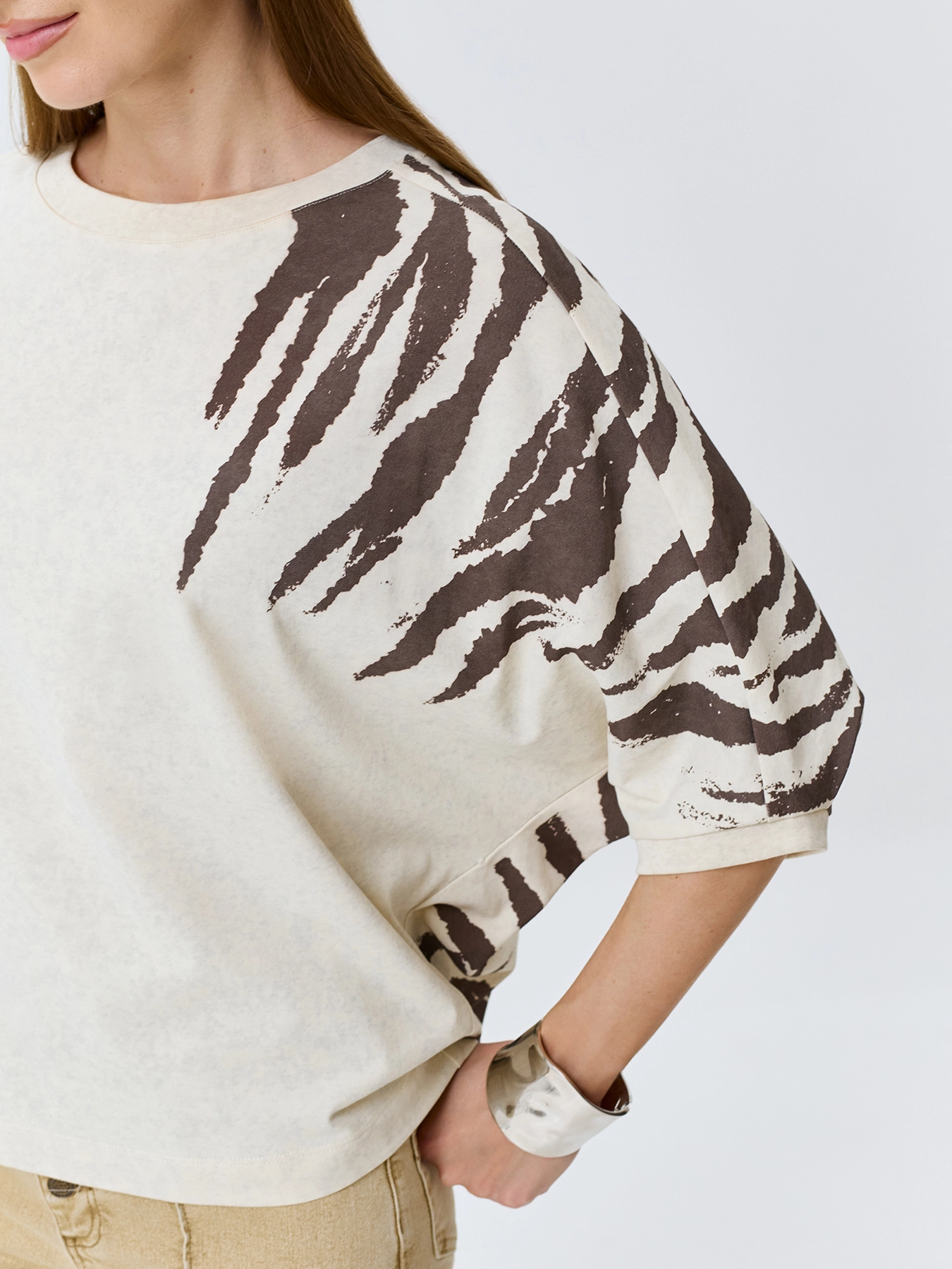 Хлопковый джемпер с асимметричным анималистичным принтом. Свободный силуэт. Круглый вырез. Укороченные цельнокроенные рукава с узкими манжетами по низу.