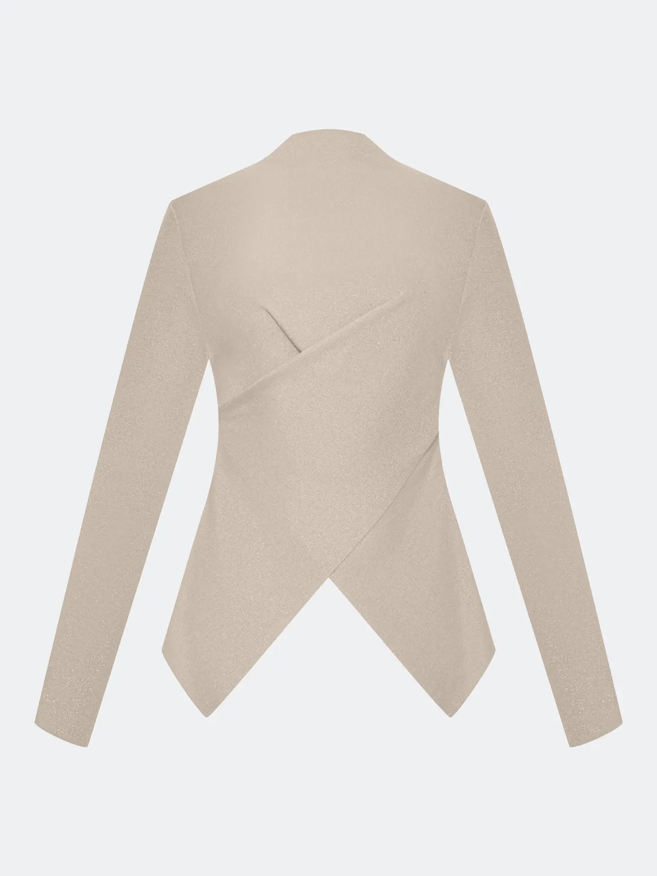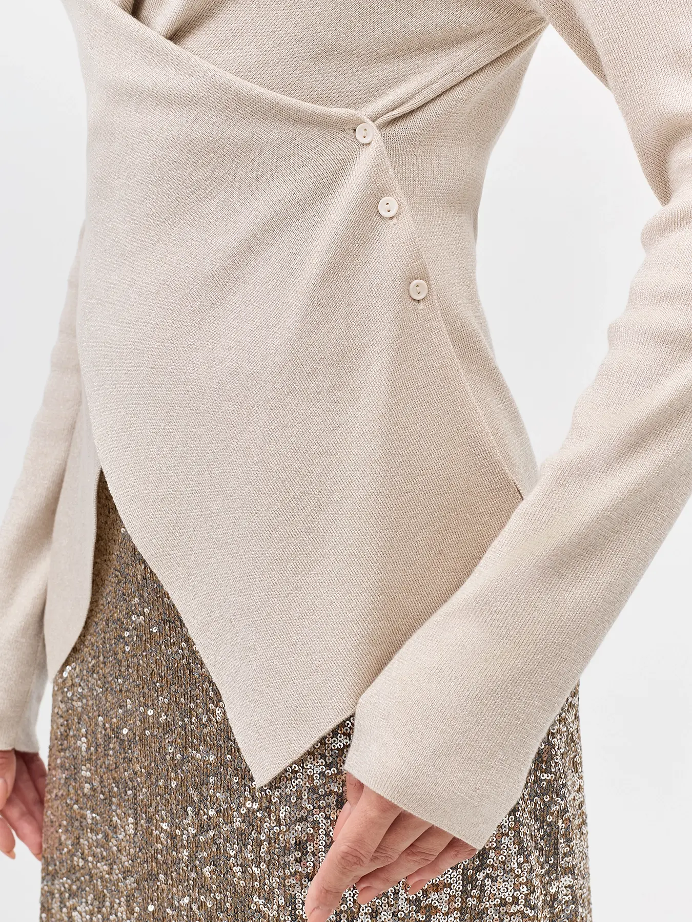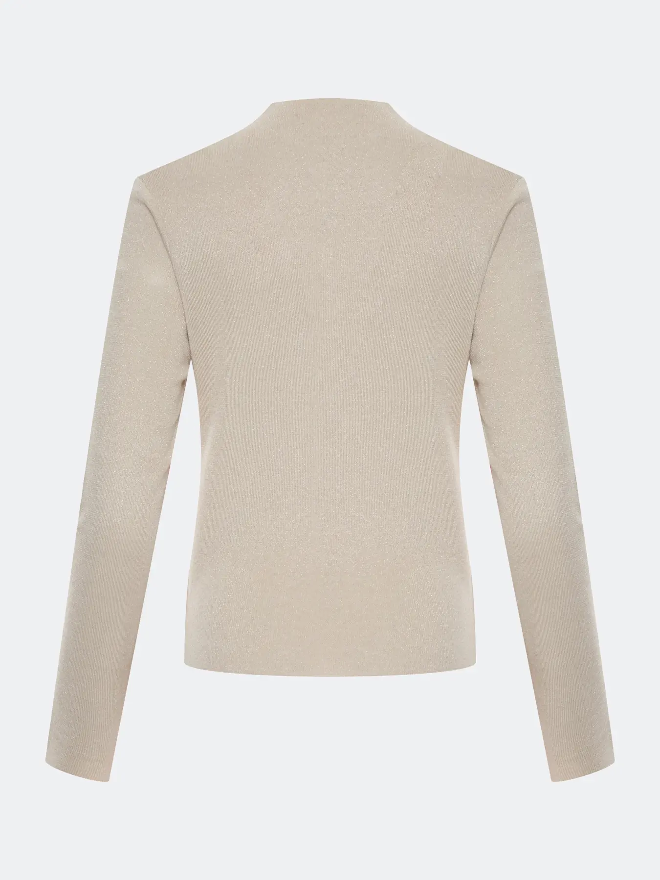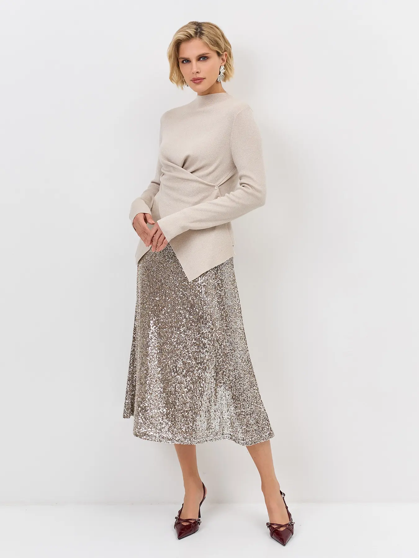 Джемпер с элегантной драпировкой и шелком в составе. Приталенный силуэт. Акцентный запах с драпировкой на пуговицах в цвет. Воротник небольшая стойка. Дополнен деликатным мерцанием. В составе тенсель и шёлк.