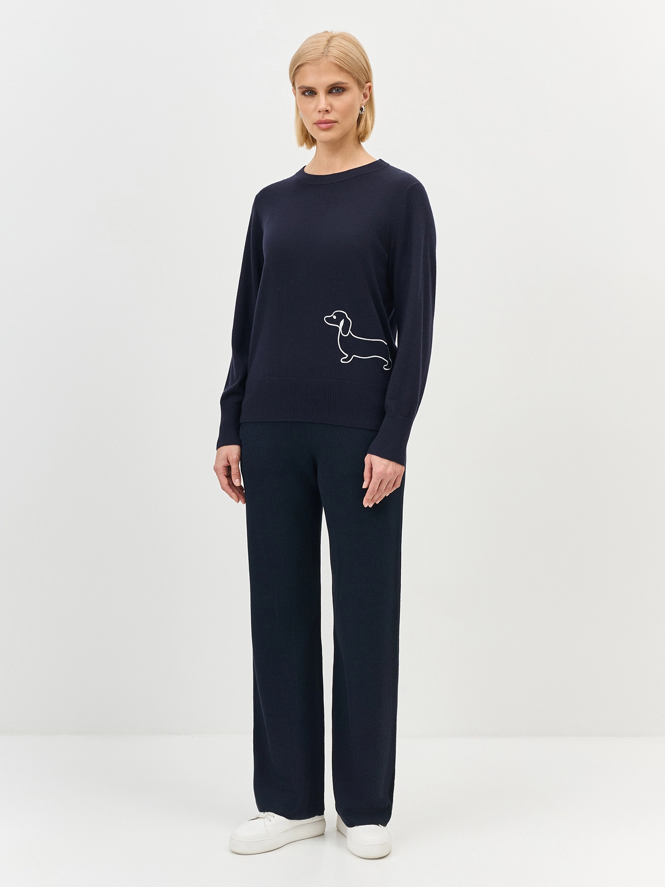 Джемпер с контрастной игривой вышивкой. Прямой силуэт. Круглый вырез. Деликатные боковые разрезы на пуговицах. Широкие манжеты по низу рукавов и изделия. Яркая тесьма на спинке. В составе шерсть и кашемир.