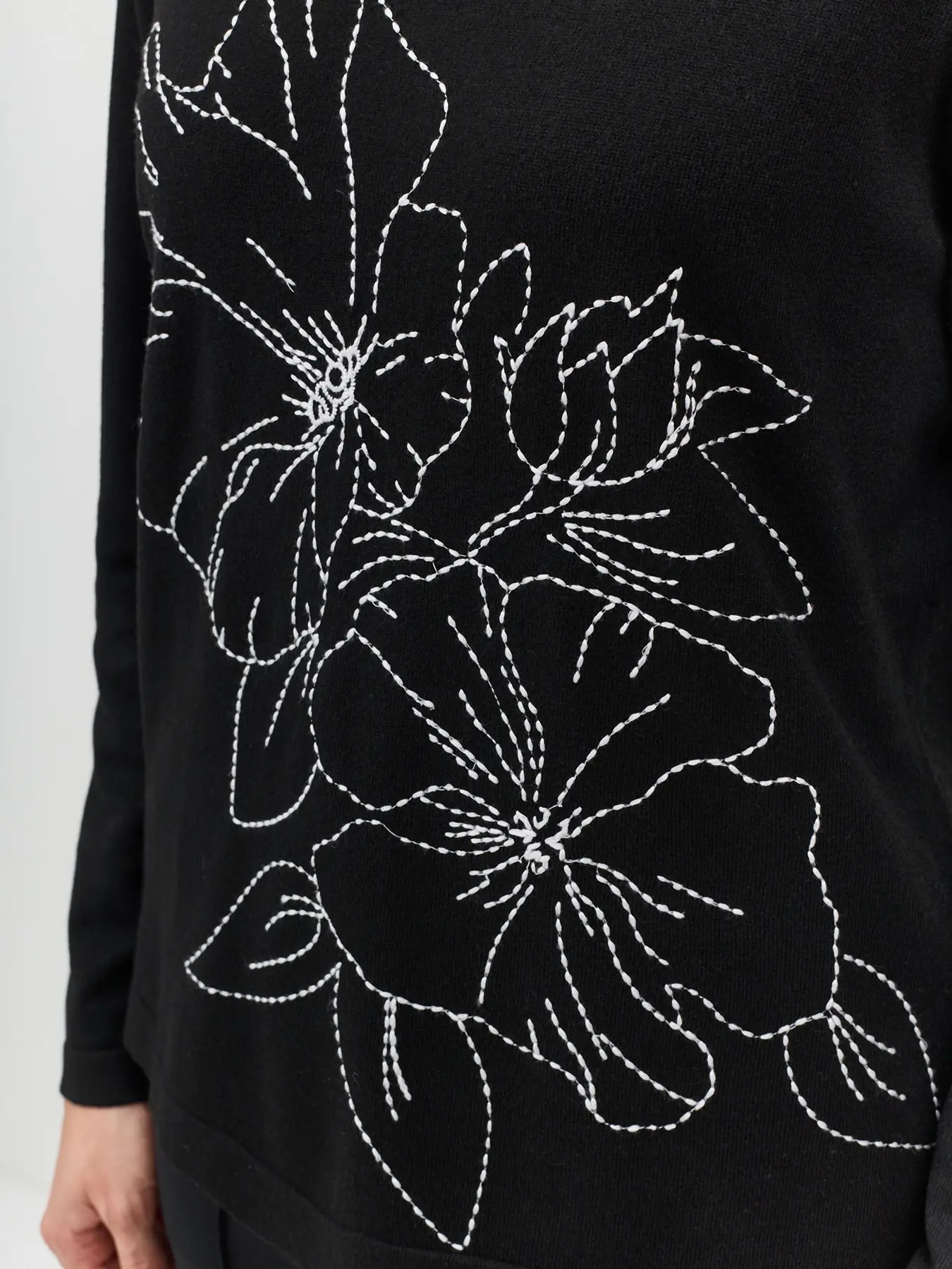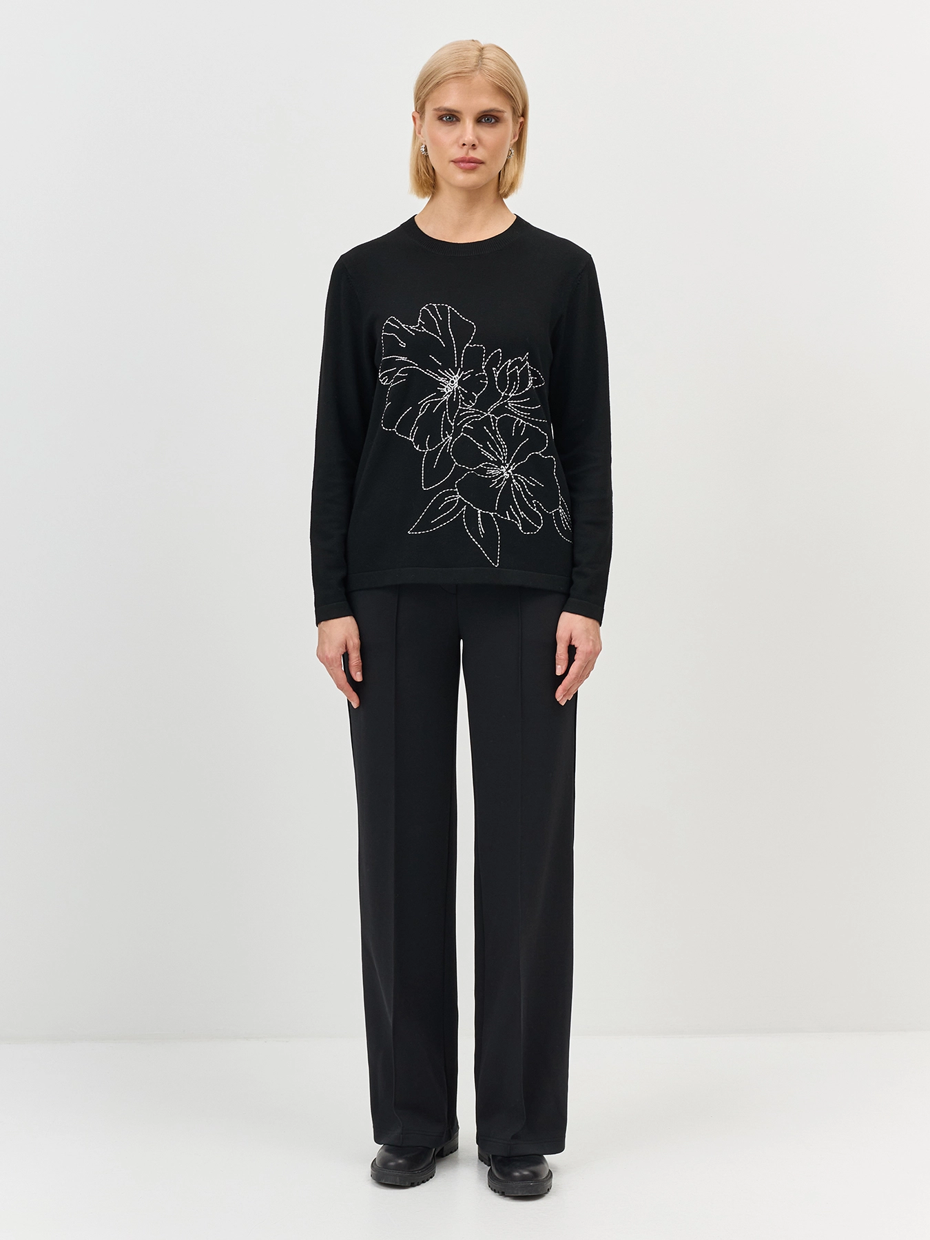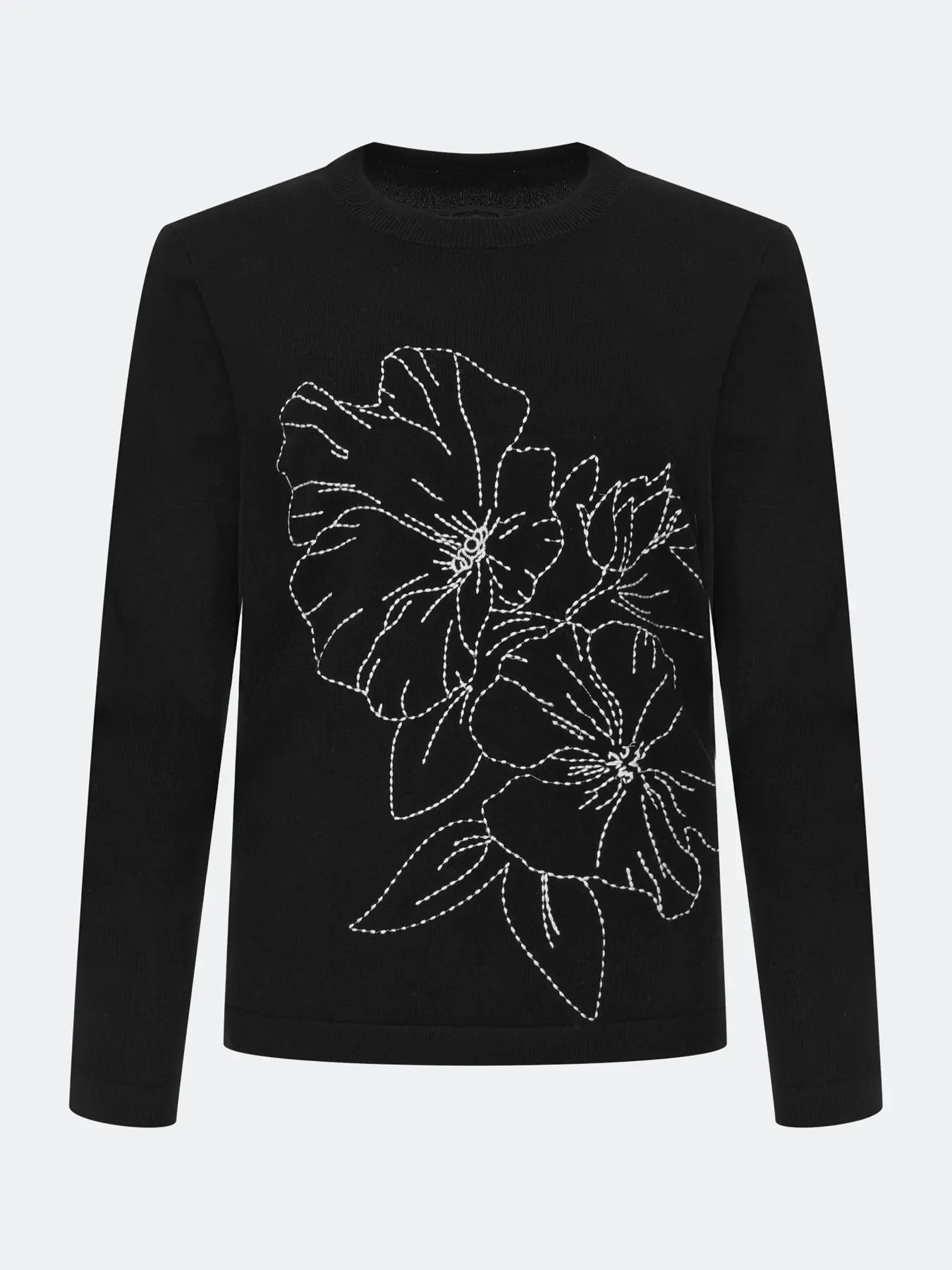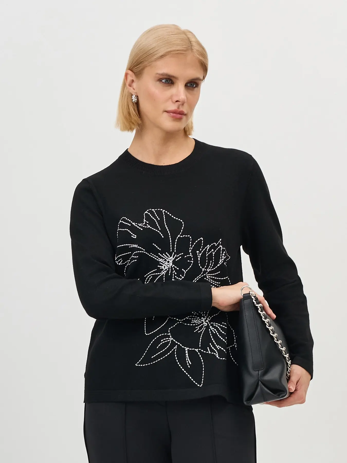 Джемпер с контрастной цветочной вышивкой имитирующей ручной стежок. Прямой силуэт. Круглый вырез. Втачные длинные рукава. В составе вискоза и шерсть.