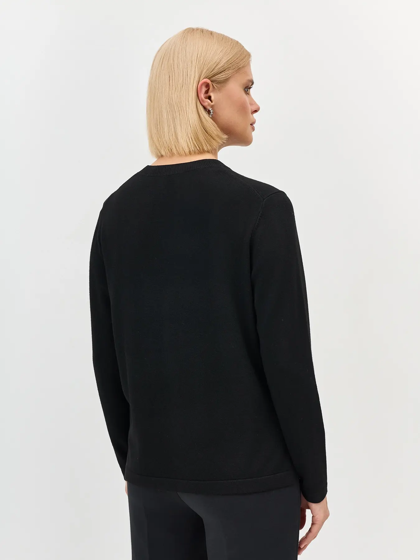 Черный джемпер от немецкого бренда BULMER – стильное решение для вашего гардероба! Контрастная вышивка добавляет изюминку образу, делая его уникальным. Прямой силуэт подчеркивает фигуру, а длинный рукав обеспечивает комфорт даже в прохладную погоду. Подходит для осени, зимы и ранней весны. Весомые преимущества: качество изготовления Германии, универсальные размеры (от 36EU до 54RU), легкость материала и стильный дизайн. Новинка сезона – выбирайте лучшее уже сейчас!
