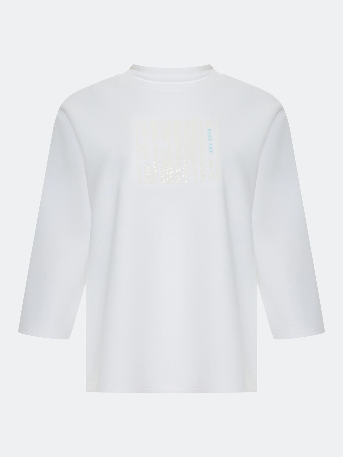 Трикотажный Oversize джемпер с укороченными рукавами 3/4. Свободный силуэт. Линия плеч немного спущена. Круглый вырез. Дополнен мерцающей вышивкой. В составе хлопок и модал.