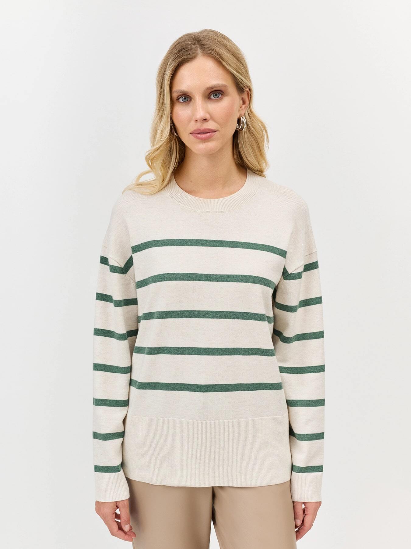Джемпер из смесовой вискозы в тонкую контрастную полоску. Свободный силуэт. Круглый вырез. Рукава со спущенной линией плеча. В составе шерсть.