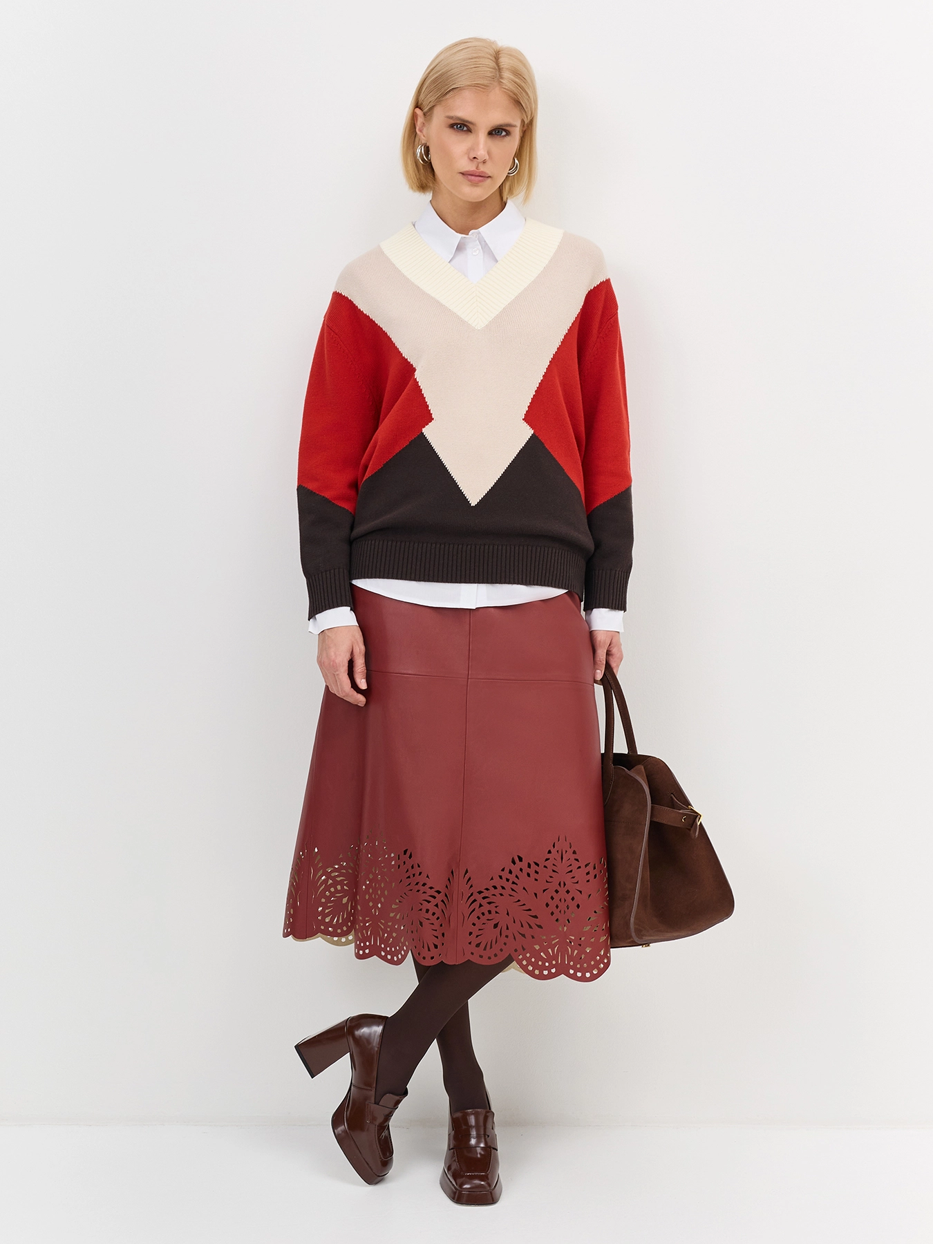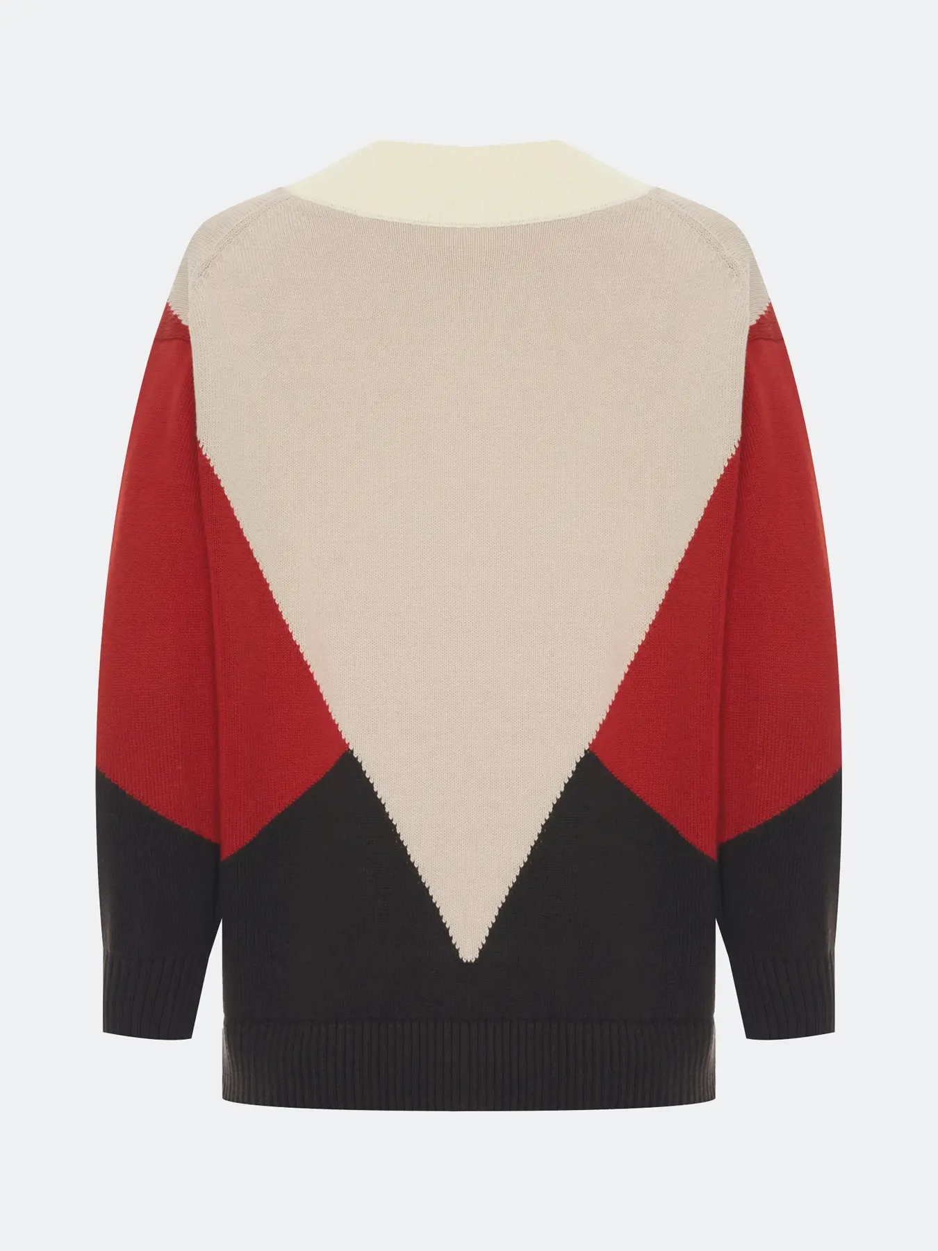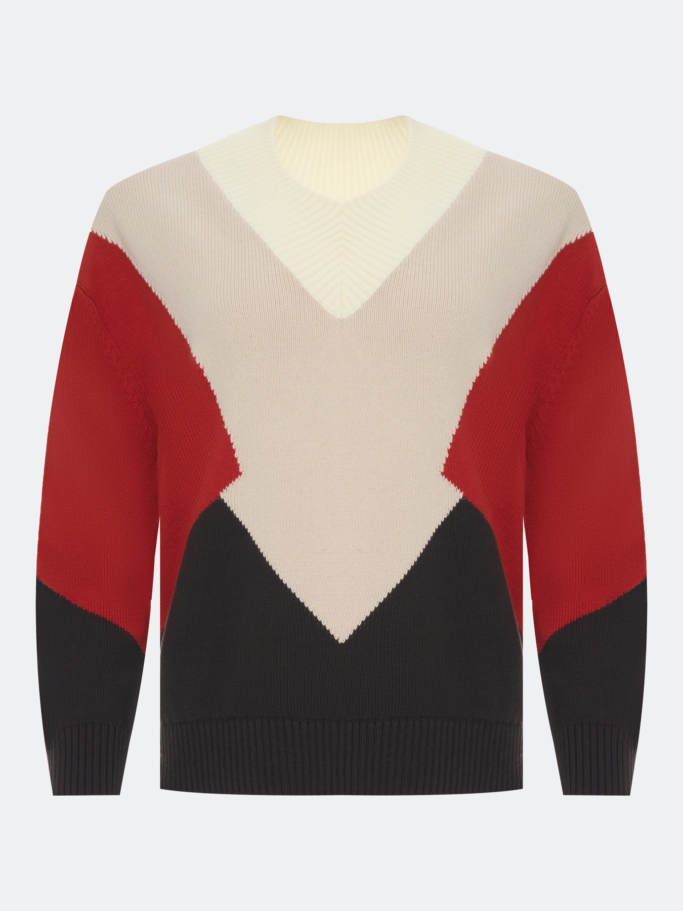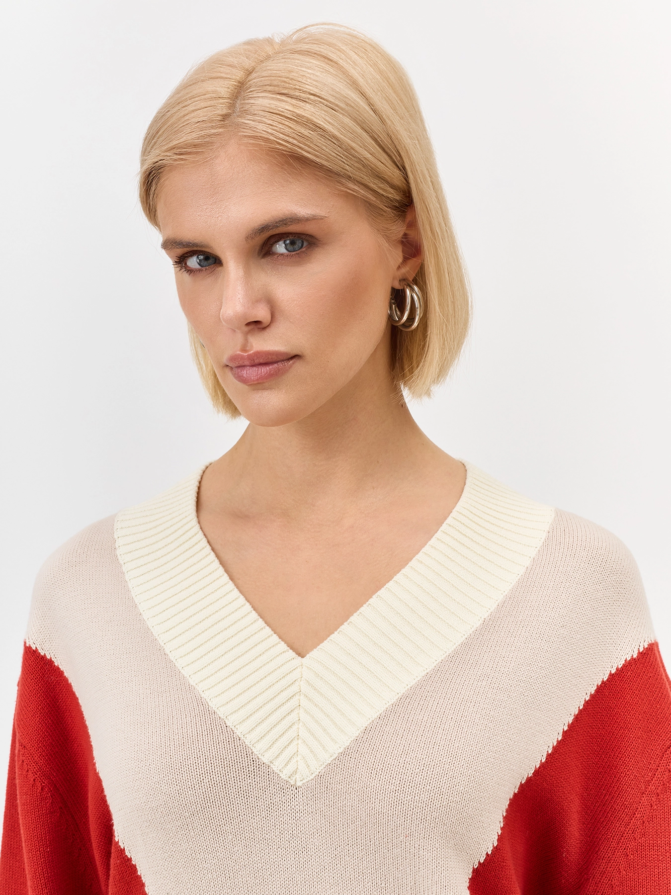 Яркий джемпер в стиле color block  свободного силуэта. V-образный вырез с акцентным рибом. Спущенная линия плеч. В составе 100% хлопок.