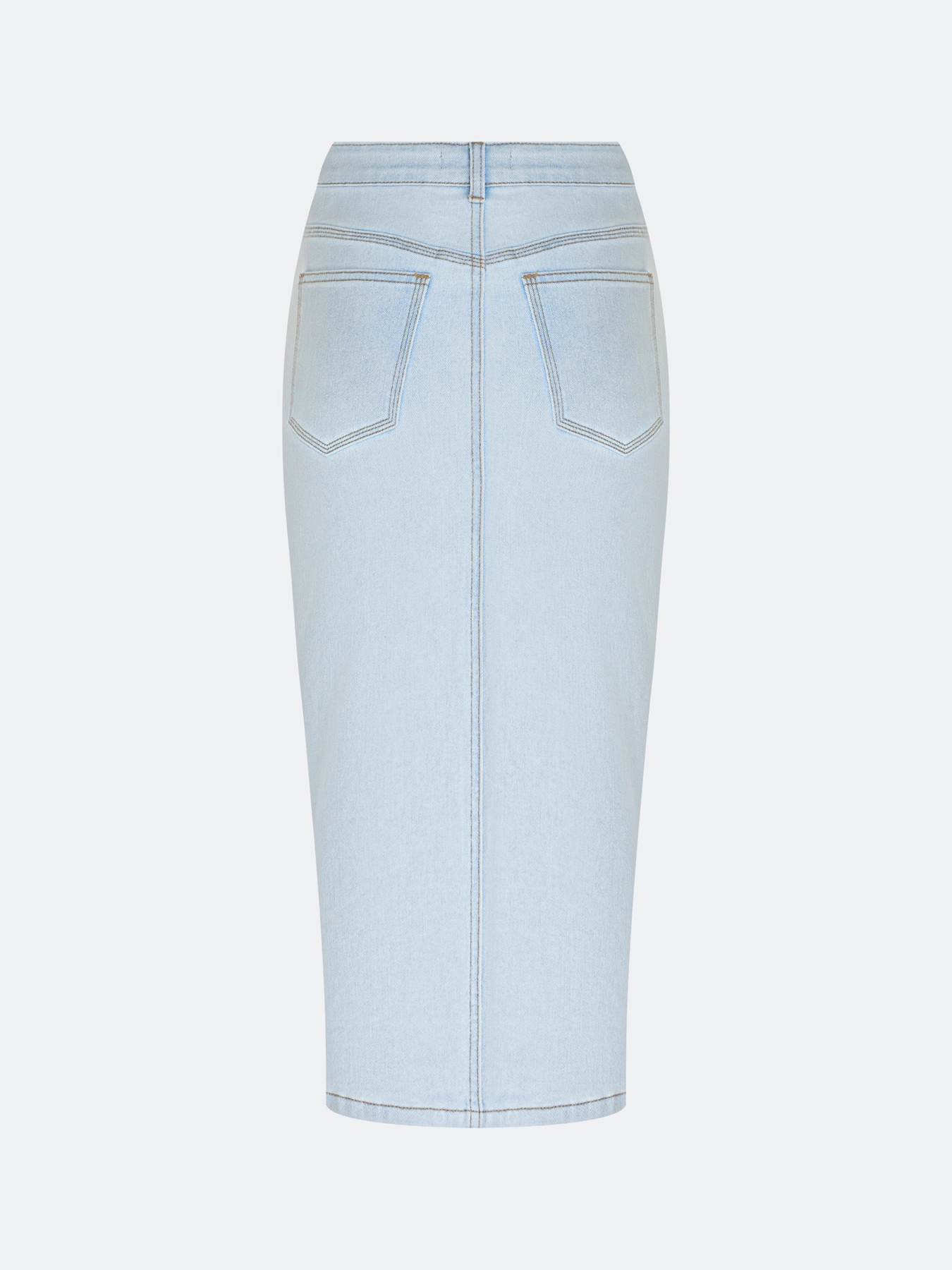 Джинсовая юбка-миди с деликатными лампасами в цвет. Прямой силуэт. Застежка на молнию и металлическую пуговицу. Пять карманов. Дополнена акцентным разрезом спереди. В составе спандекс.