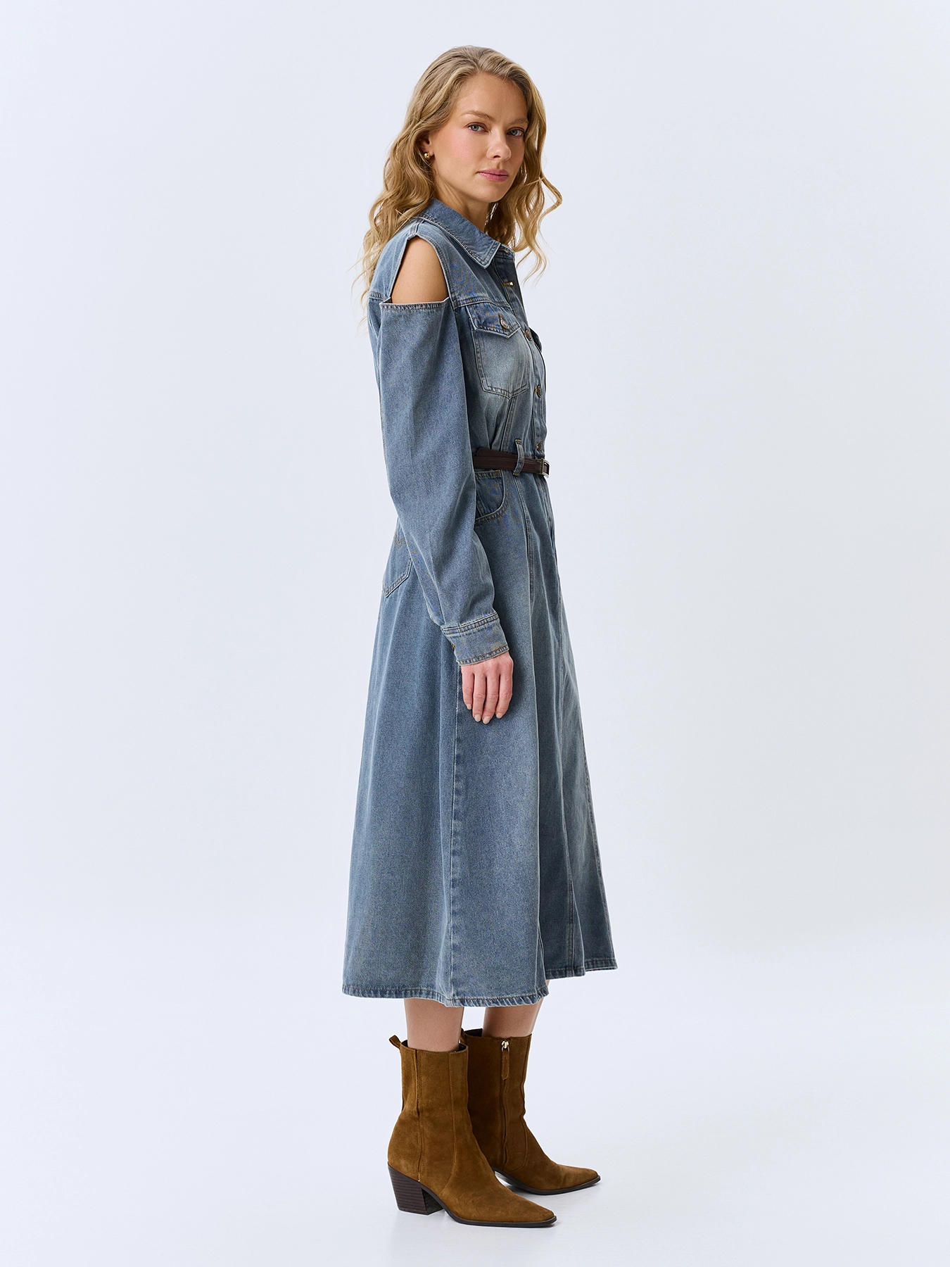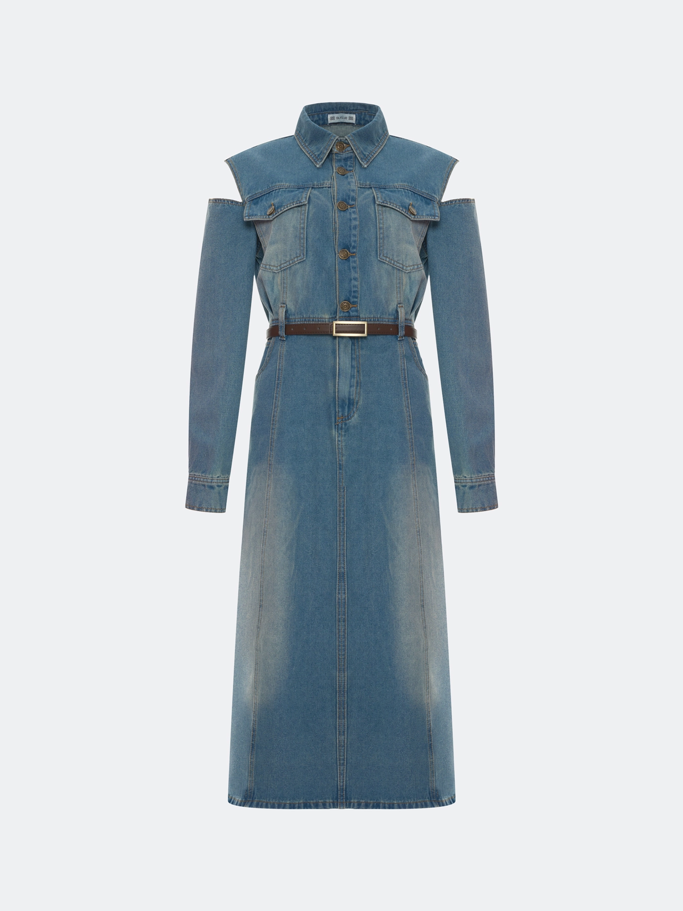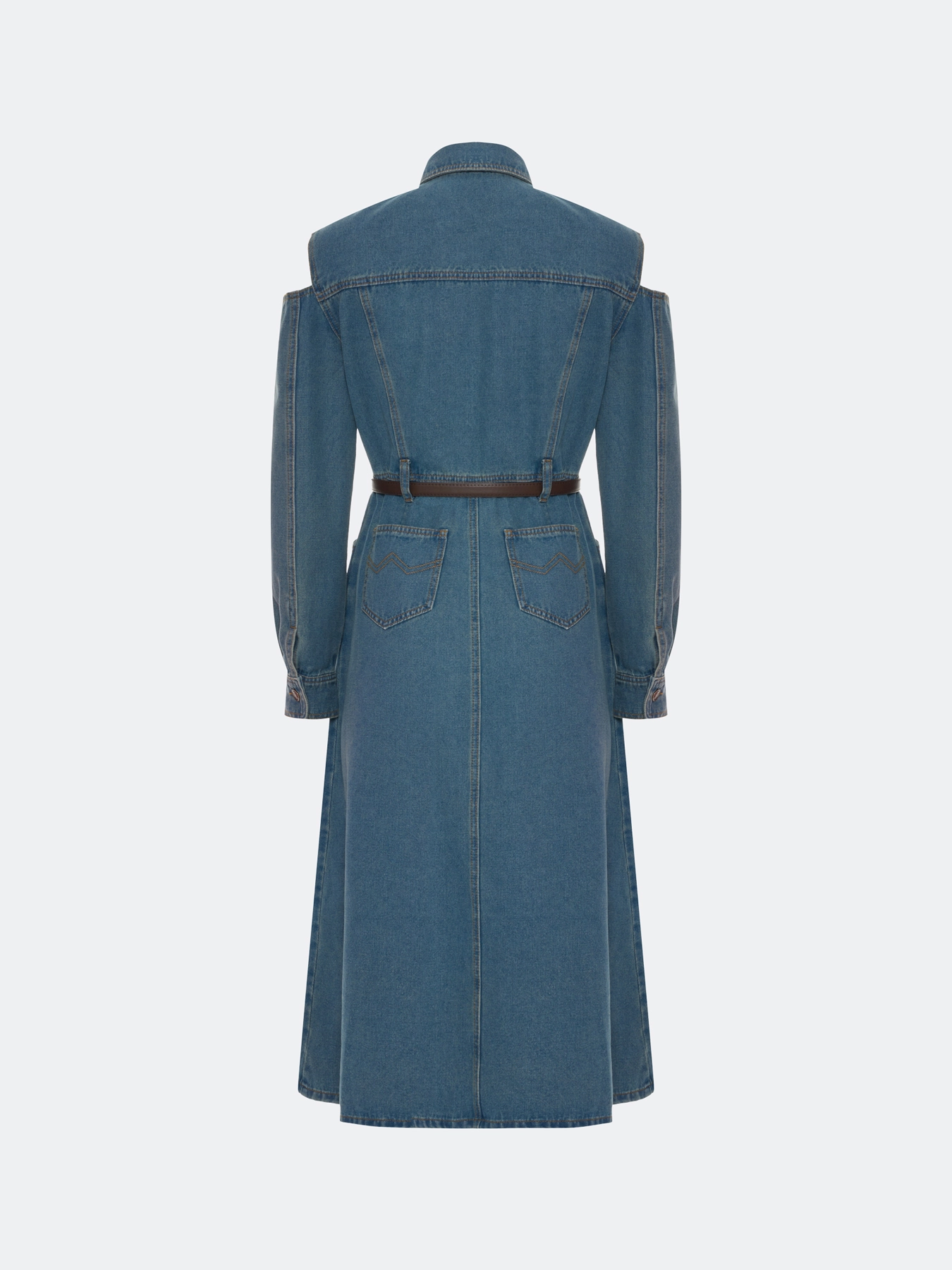 Джинсовое платье-миди из хлопка с акцентной варкой. Полуприлегающий силуэт дополнен шлевками и ремнем из эко кожи. Отложной воротник. Застежка на металлические пуговицы. Накладные нагрудные карманы с клапанами на пуговицах. Длинные рукава с манжетами по низу на пуговицах. Юбка А-силуэта. Акцентные разрезы по линии плеч.