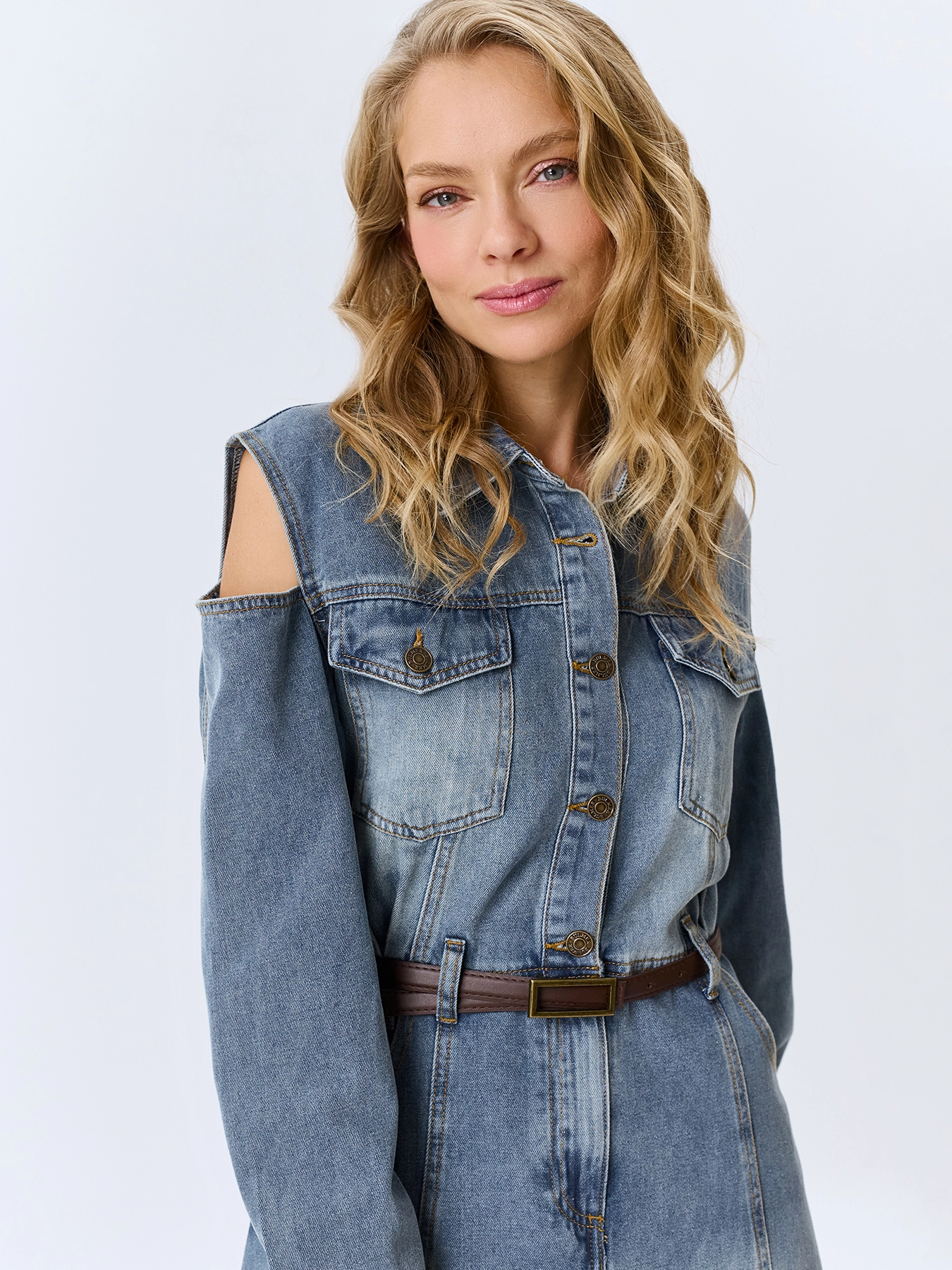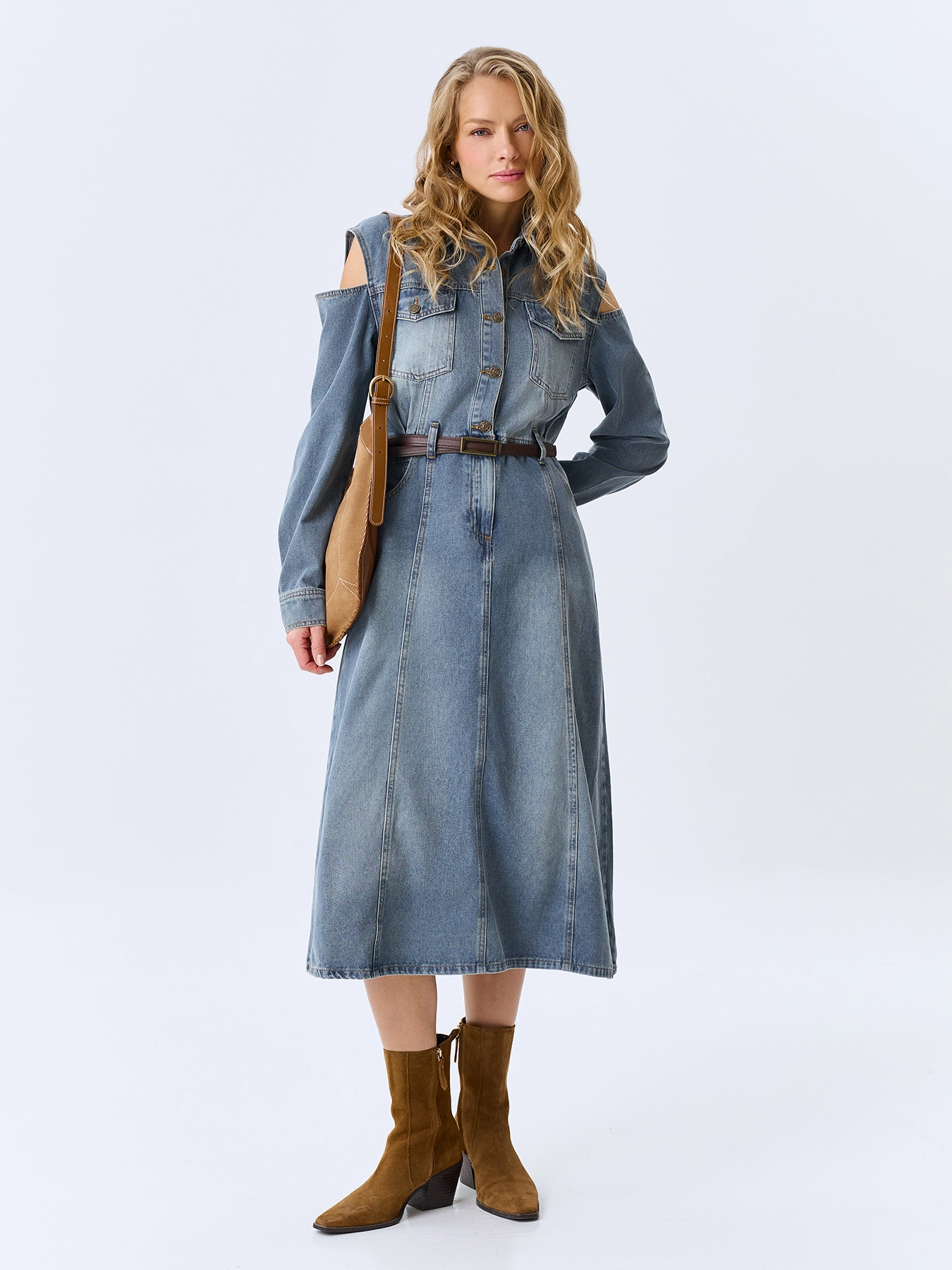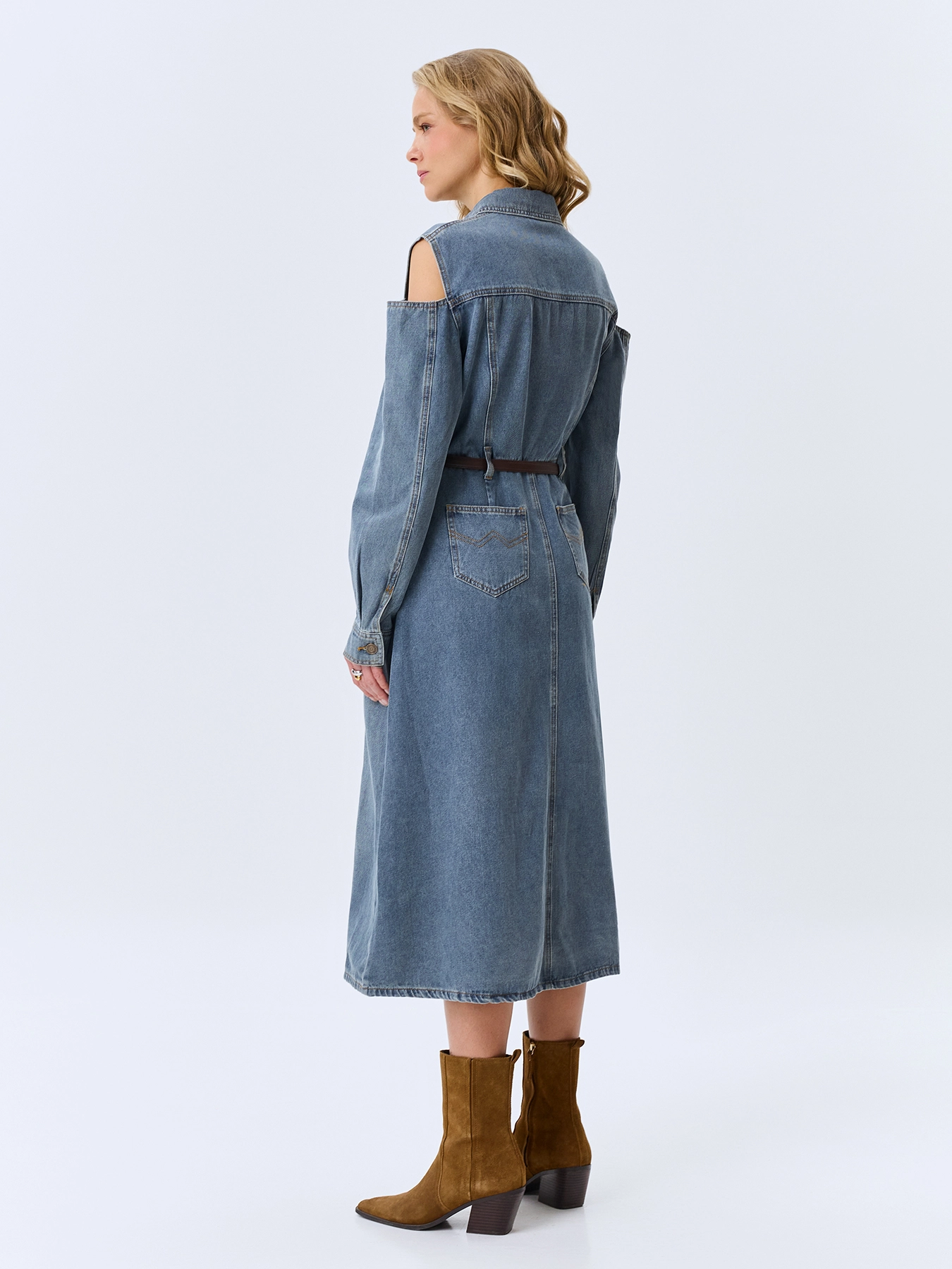 Джинсовое платье-миди из хлопка с акцентной варкой. Полуприлегающий силуэт дополнен шлевками и ремнем из эко кожи. Отложной воротник. Застежка на металлические пуговицы. Накладные нагрудные карманы с клапанами на пуговицах. Длинные рукава с манжетами по низу на пуговицах. Юбка А-силуэта. Акцентные разрезы по линии плеч.