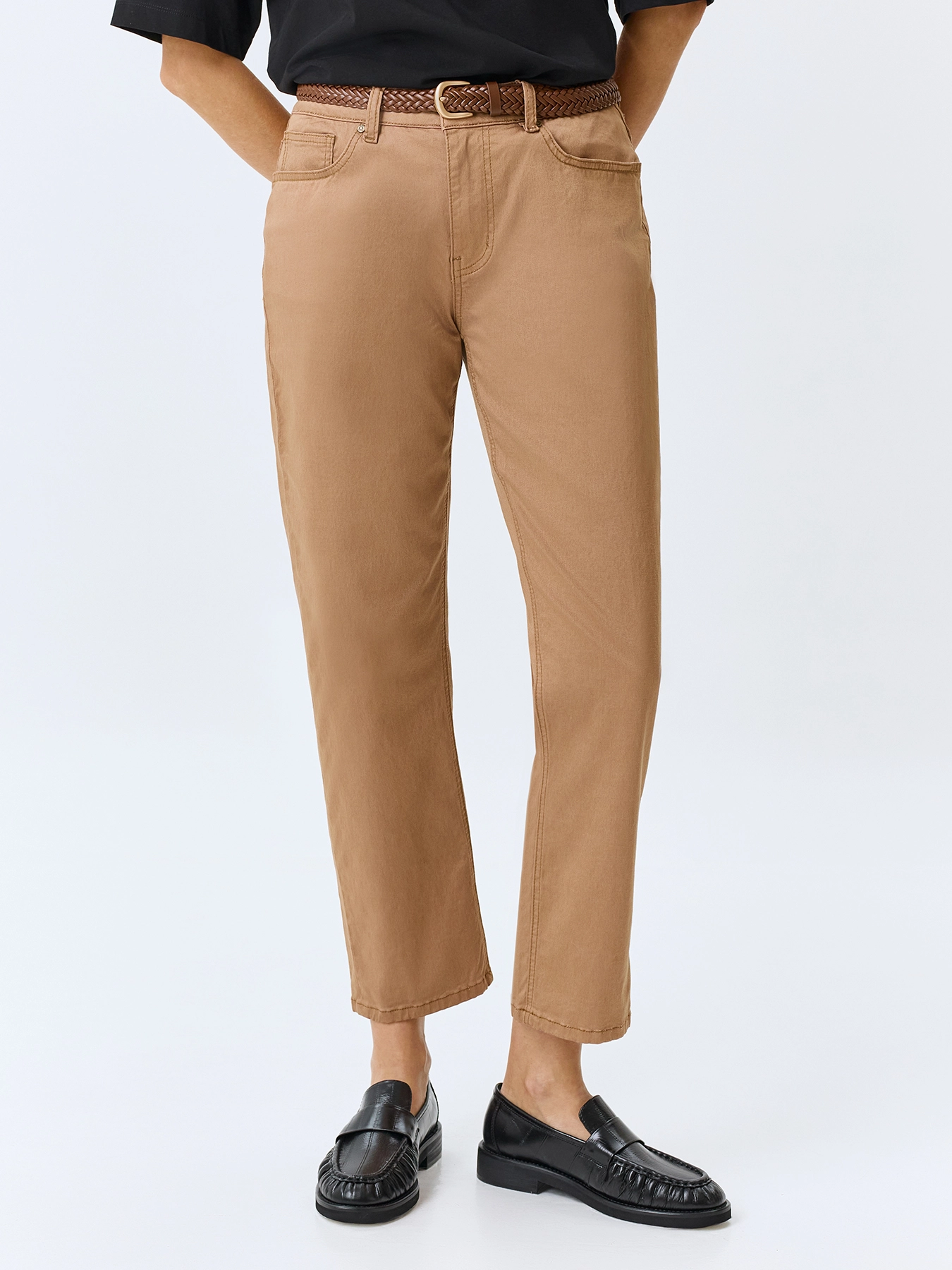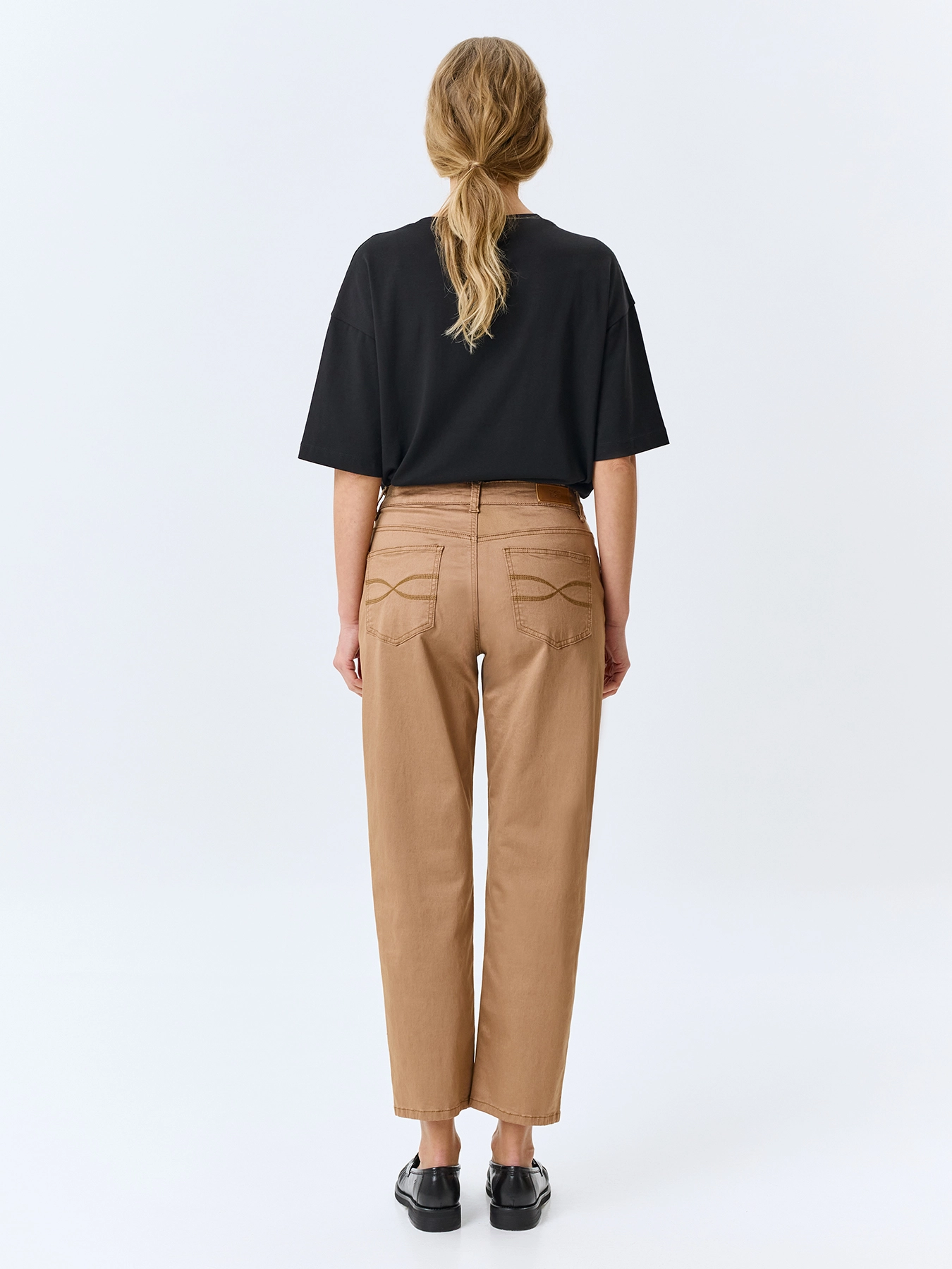 Джинсы чиносы средней посадки из смесовой эластичной вискозы. Прямой силуэт немного заужен к низу. Классическая застежка на молнию и металлическую пуговицу. Пять карманов. Дополнены вышивкой на задних карманах. В составе спандекс.