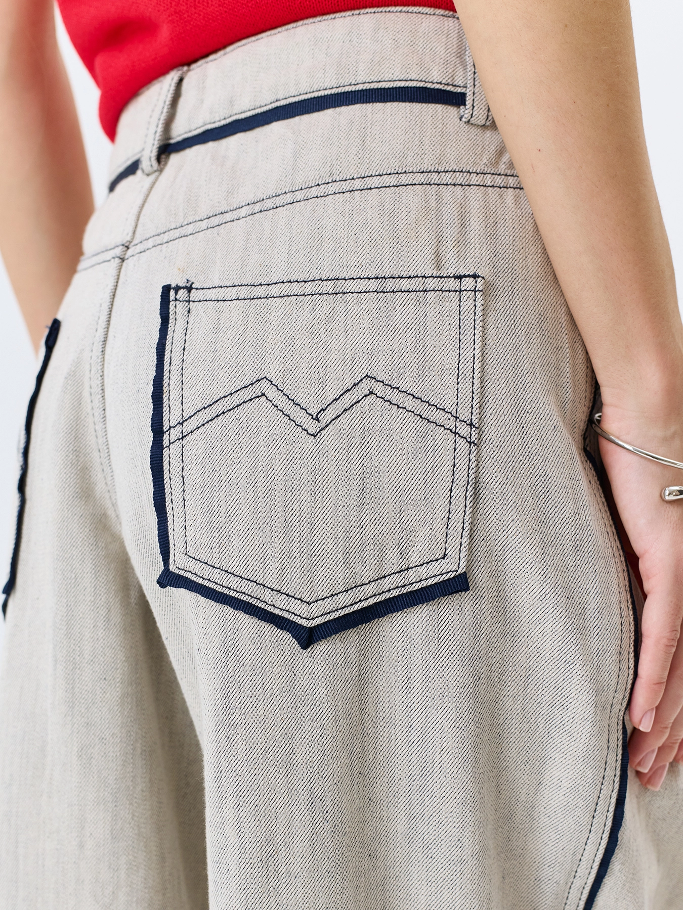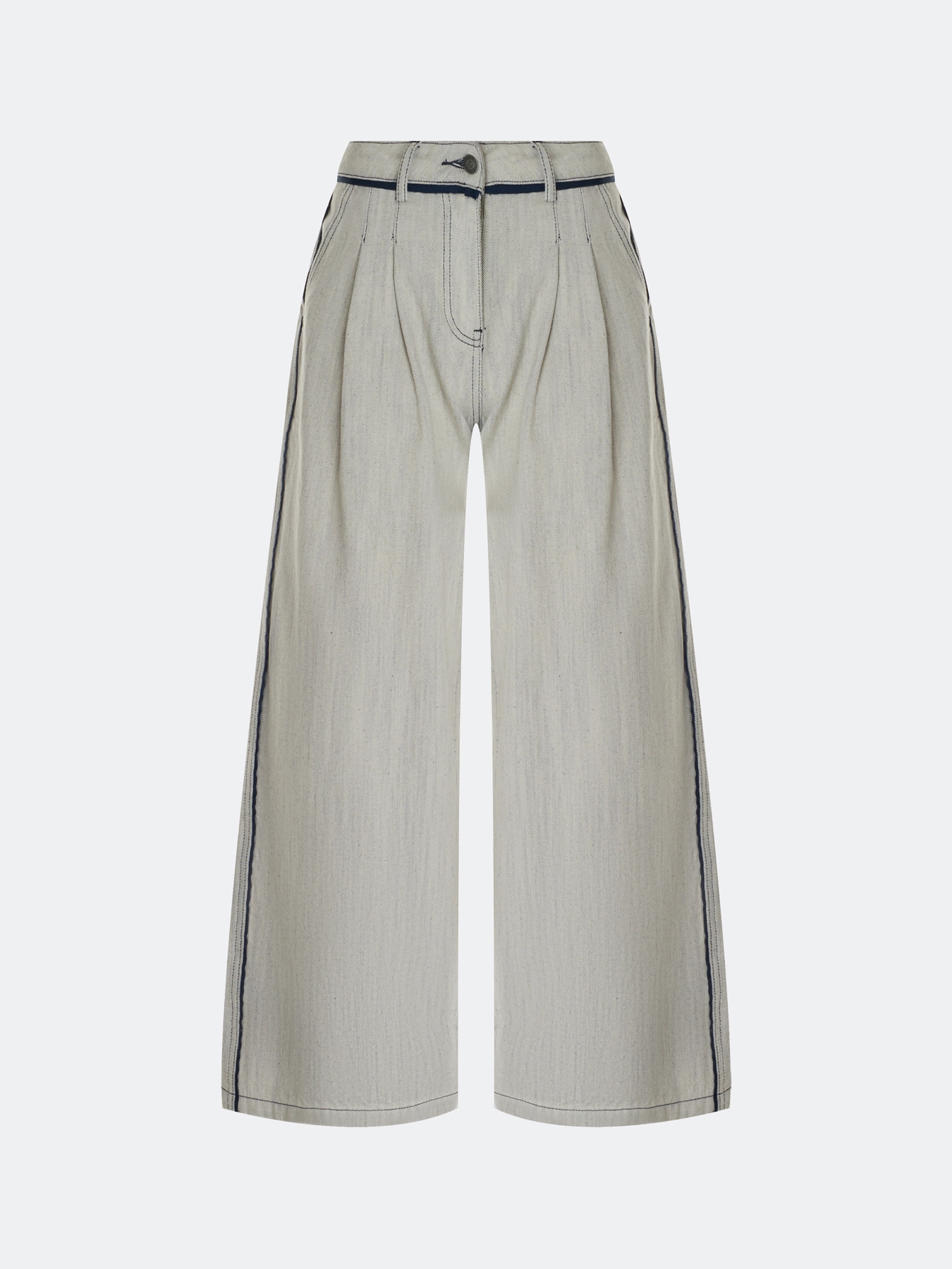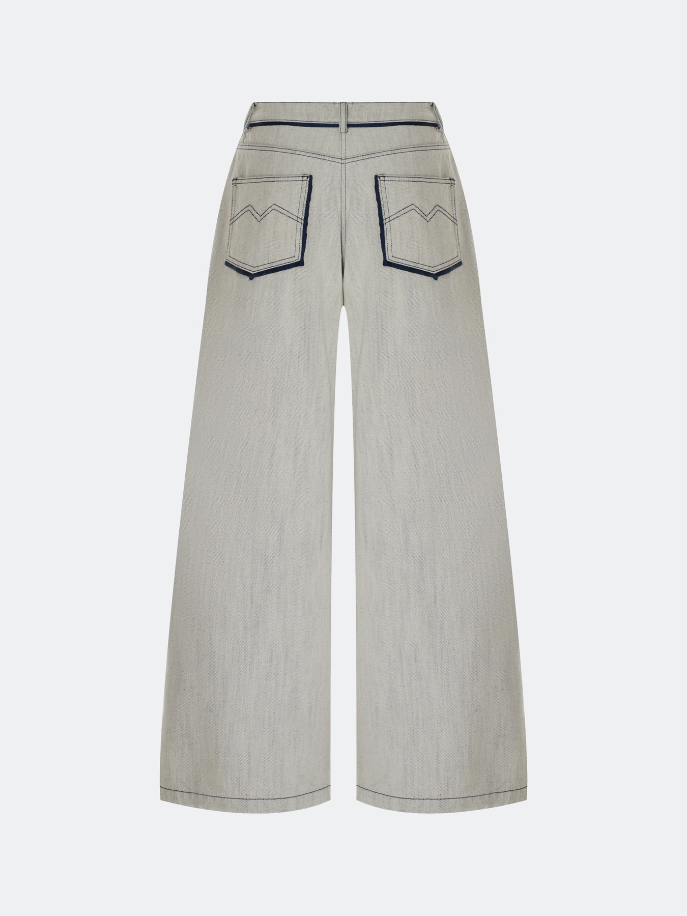 Меланжевые джинсы средней посадки. Свободный силуэт. Застежка на молнию и металлическую пуговицу. Четыре кармана. Боковые карманы в швах. Дополнены двойными складками. Контрастные лампасы и кант по задним карманам и поясу. В составе 100% хлопок.