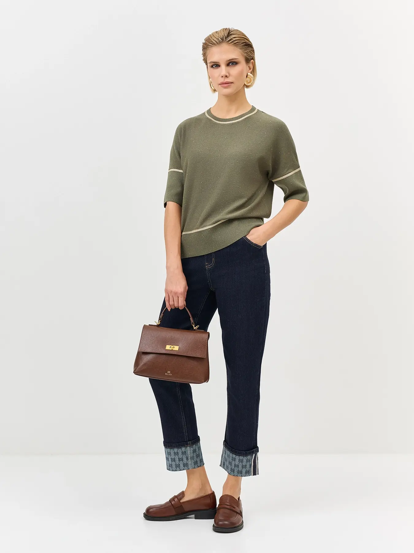 Джинсы с принтованными отворотами. Прямой силуэт немного заужен к низу. Застежка молния и металлические пуговицы. Резинка по линии талии сзади. Пять карманов. В составе эластан.
