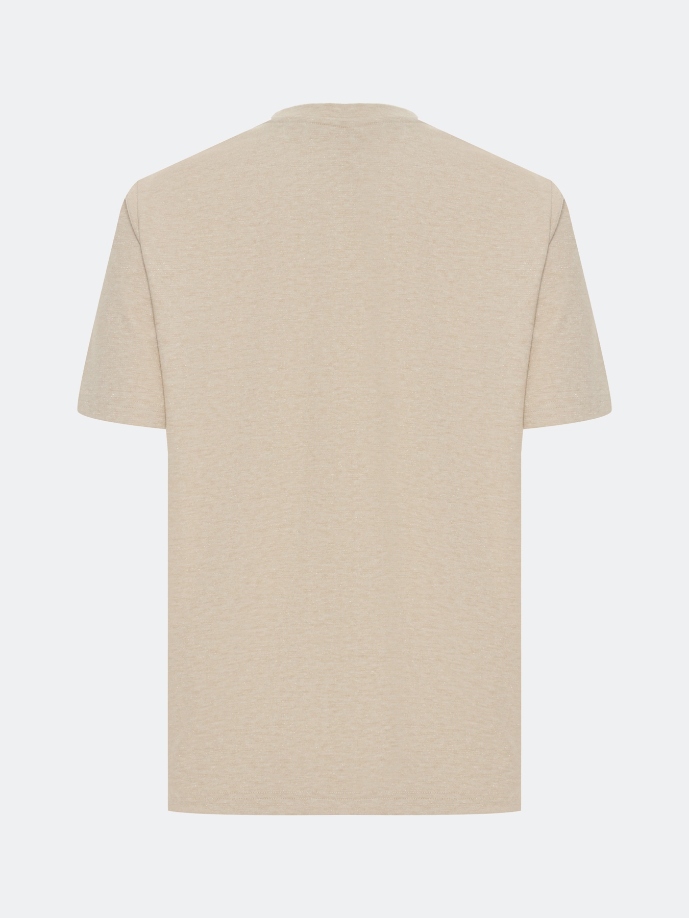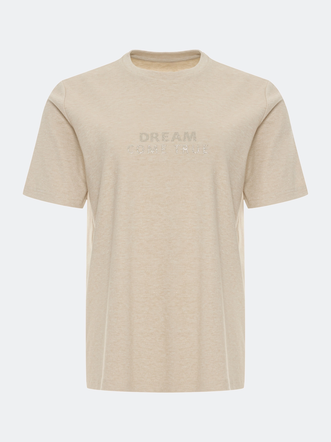 Меланжевая футболка из смесовой вискозы. Прямой силуэт. Круглый вырез. Короткие втачные рукава. Дополнена деликатным мерцающим принтом.