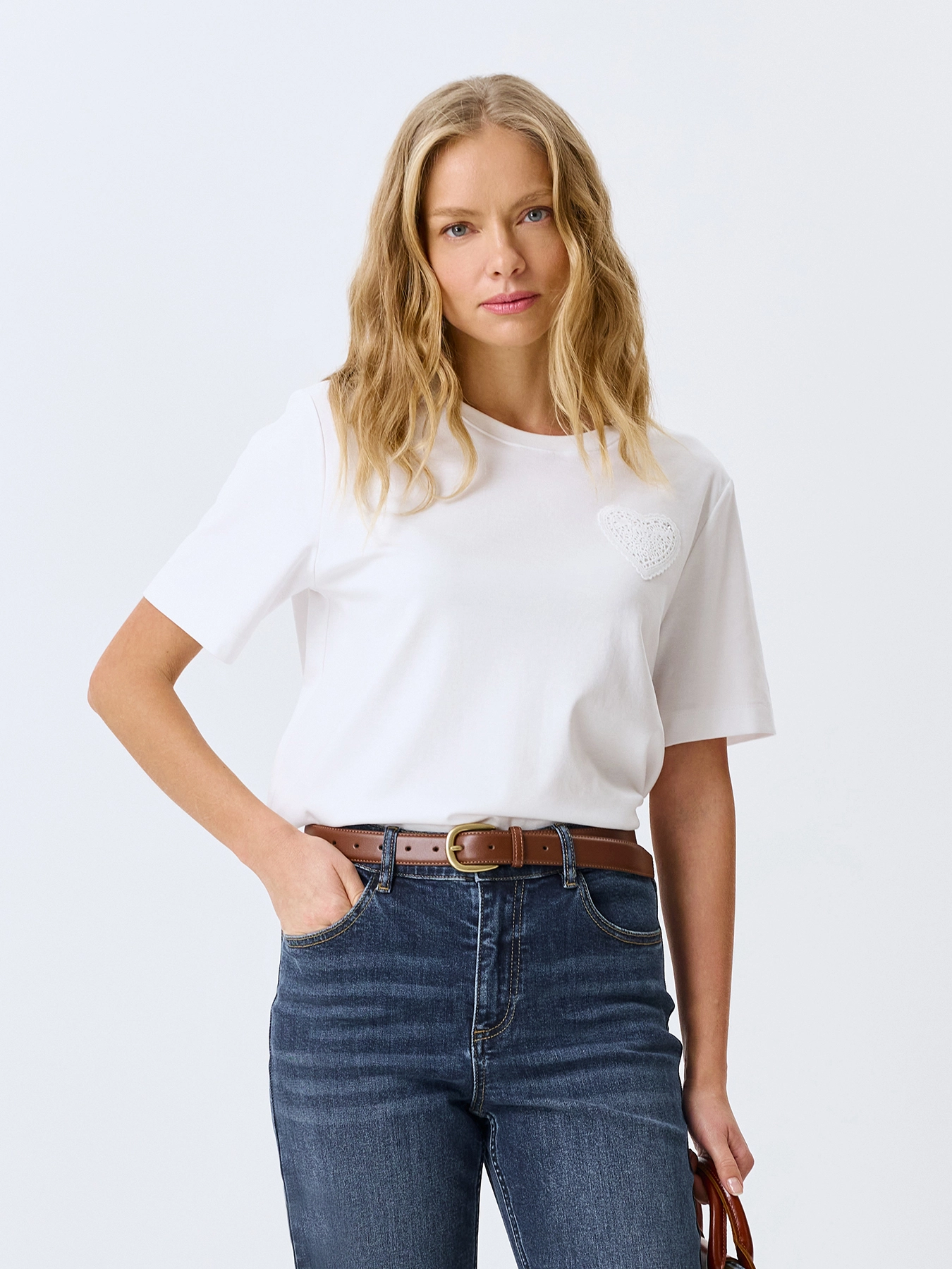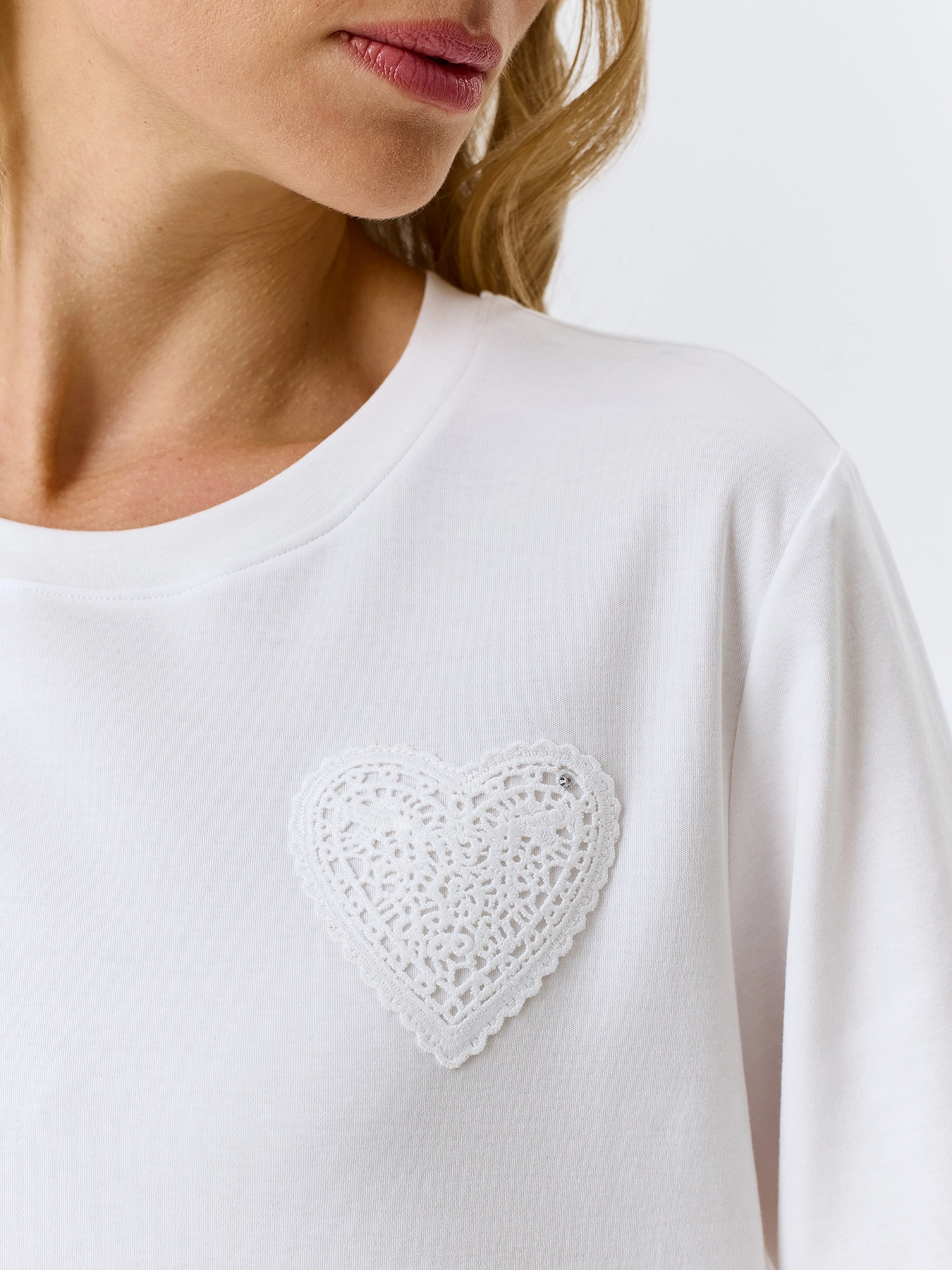Футболка с ажурной аппликацией "сердце". Прямой силуэт. Круглый вырез. Спущенная линия плеч и укороченные втачные рукава.