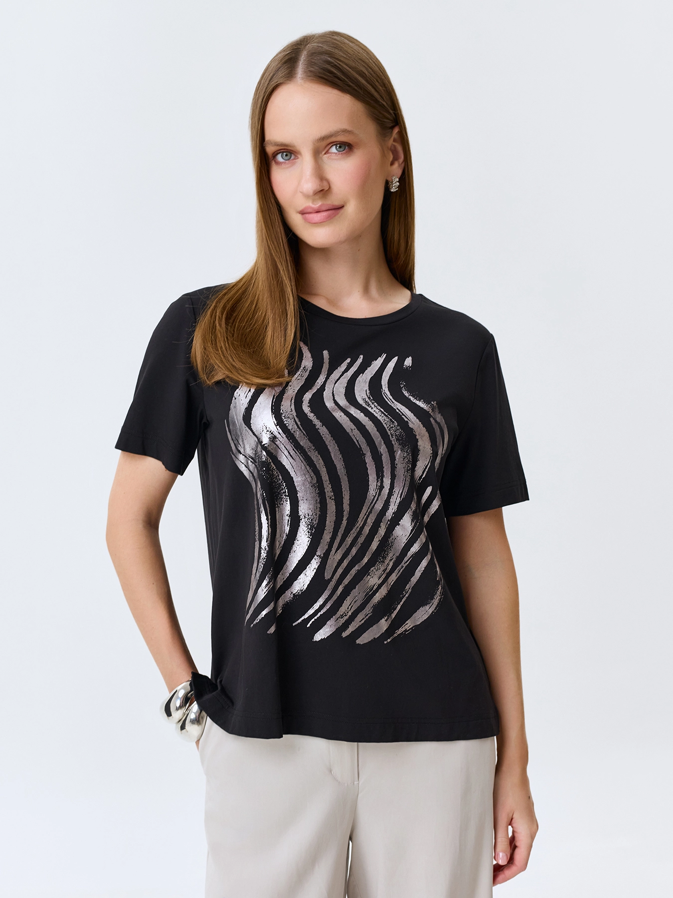 Футболка с металлизированным анималистичным принтом. Свободный силуэт. Круглый вырез. Короткие втачные рукава. В составе модал и хлопок.