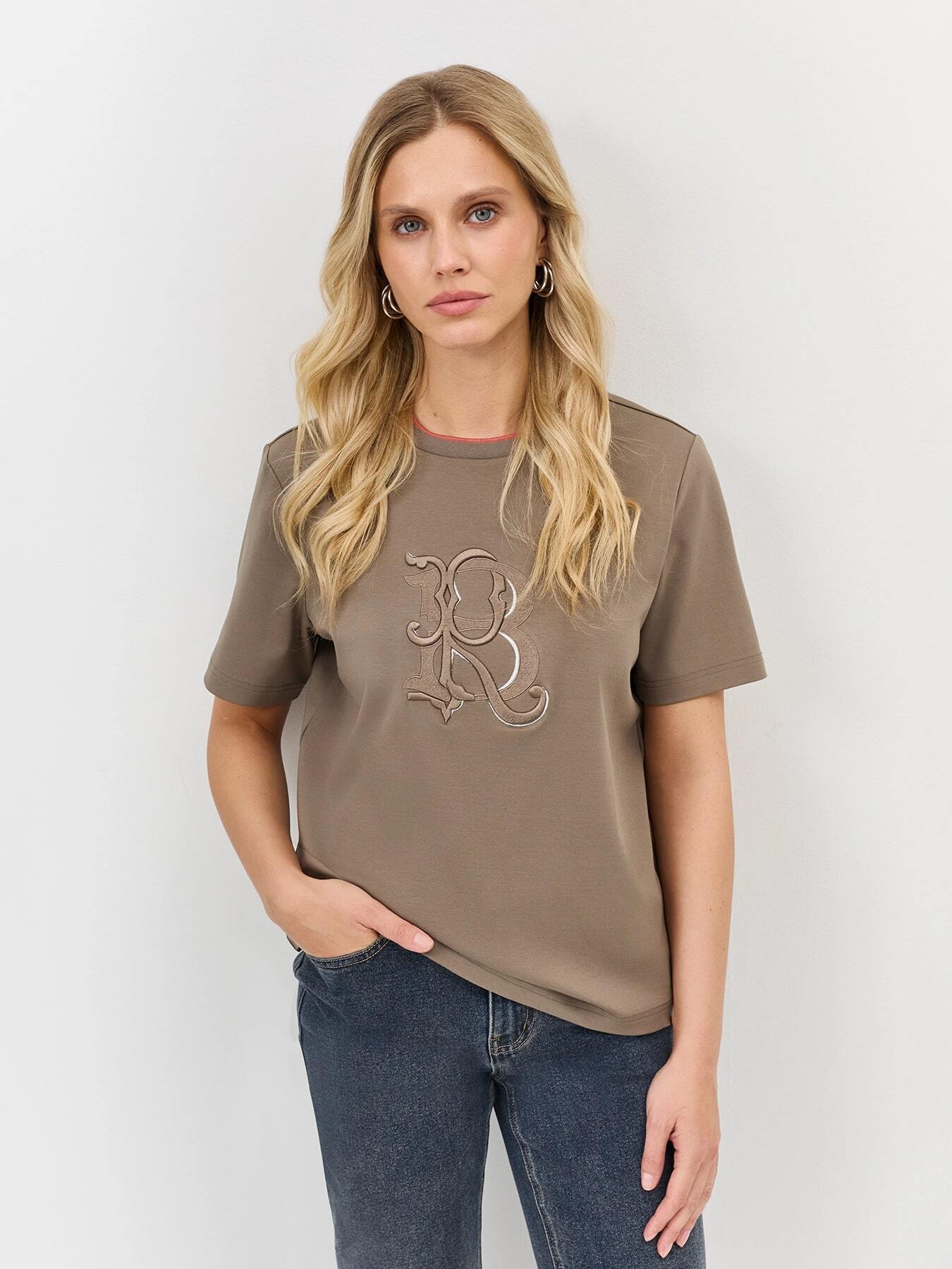 Новая стильная футболка от известного немецкого бренда BULMER! Внимание привлекает элегантная монограмма, придающая образу индивидуальность. Прямой силуэт универсален и подчеркивает фигуру, а спокойные серо-коричневые оттенки легко комбинируются с другими элементами гардероба. Отличное качество материалов обеспечивает комфорт при носке – идеальна как базовый элемент модного лука для любой женщины!