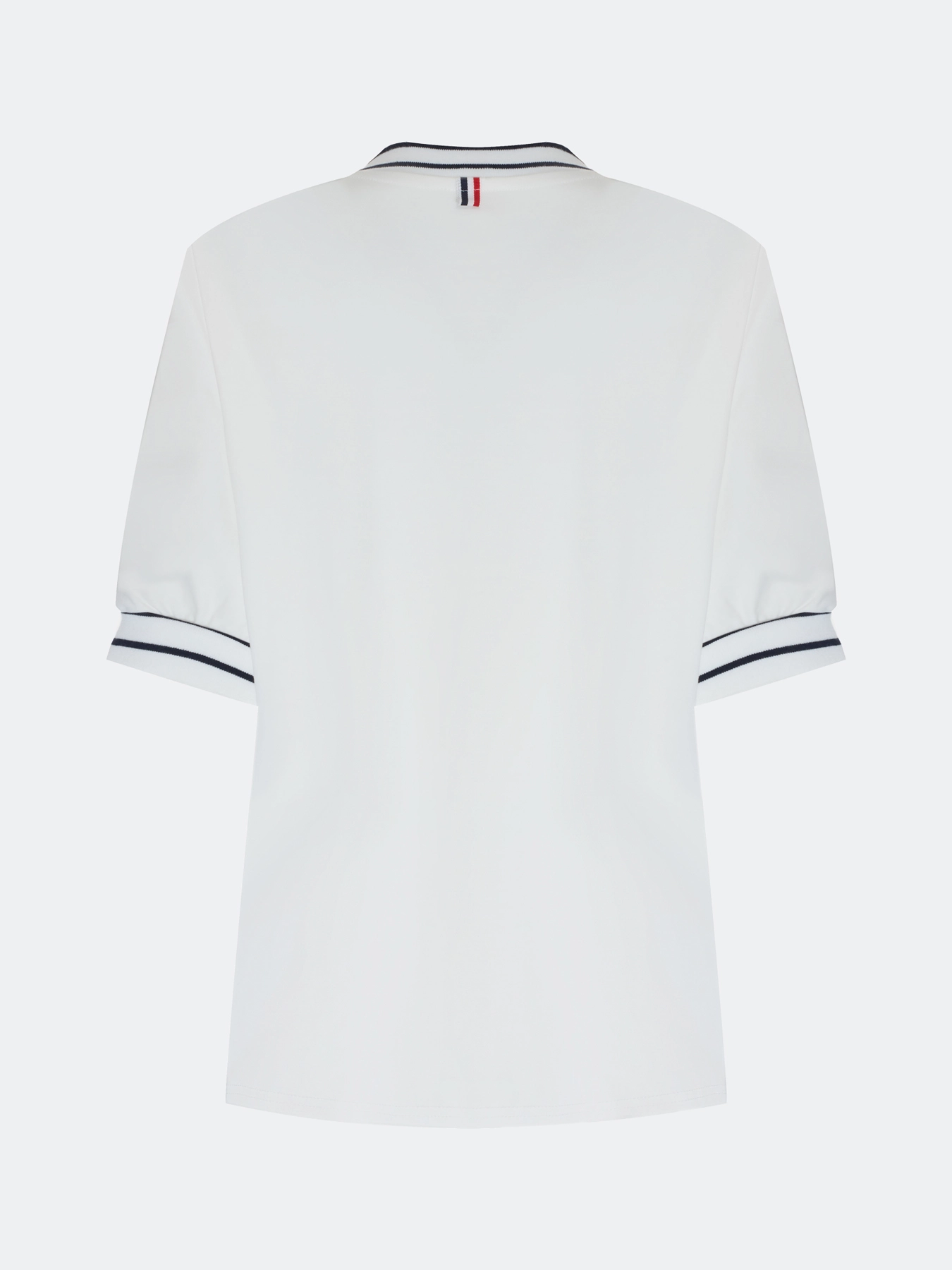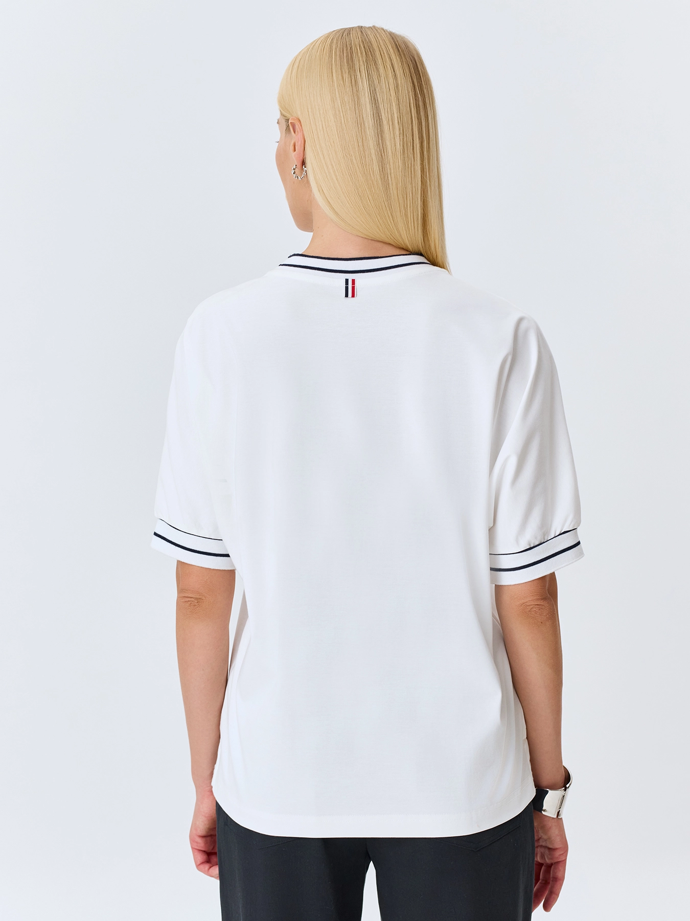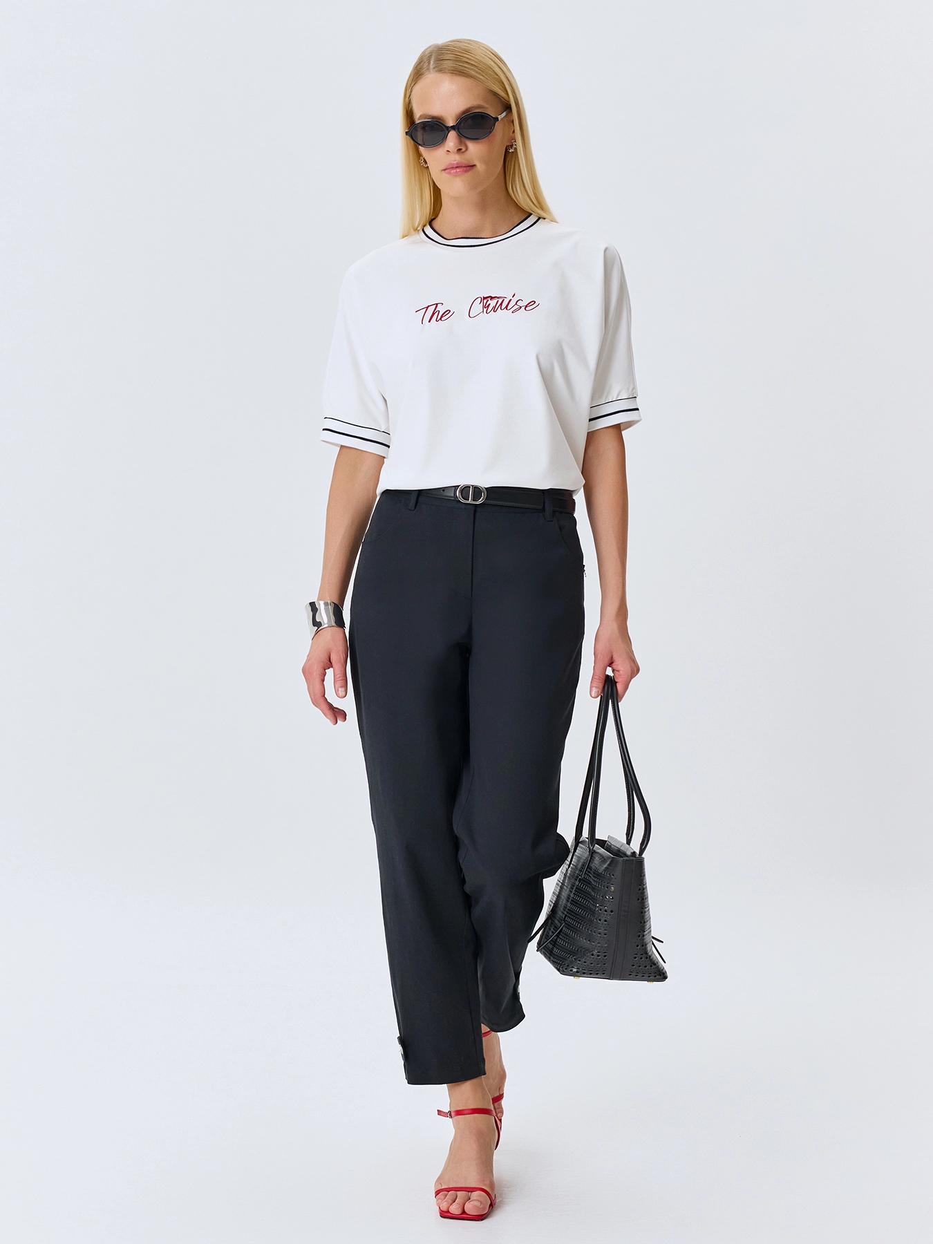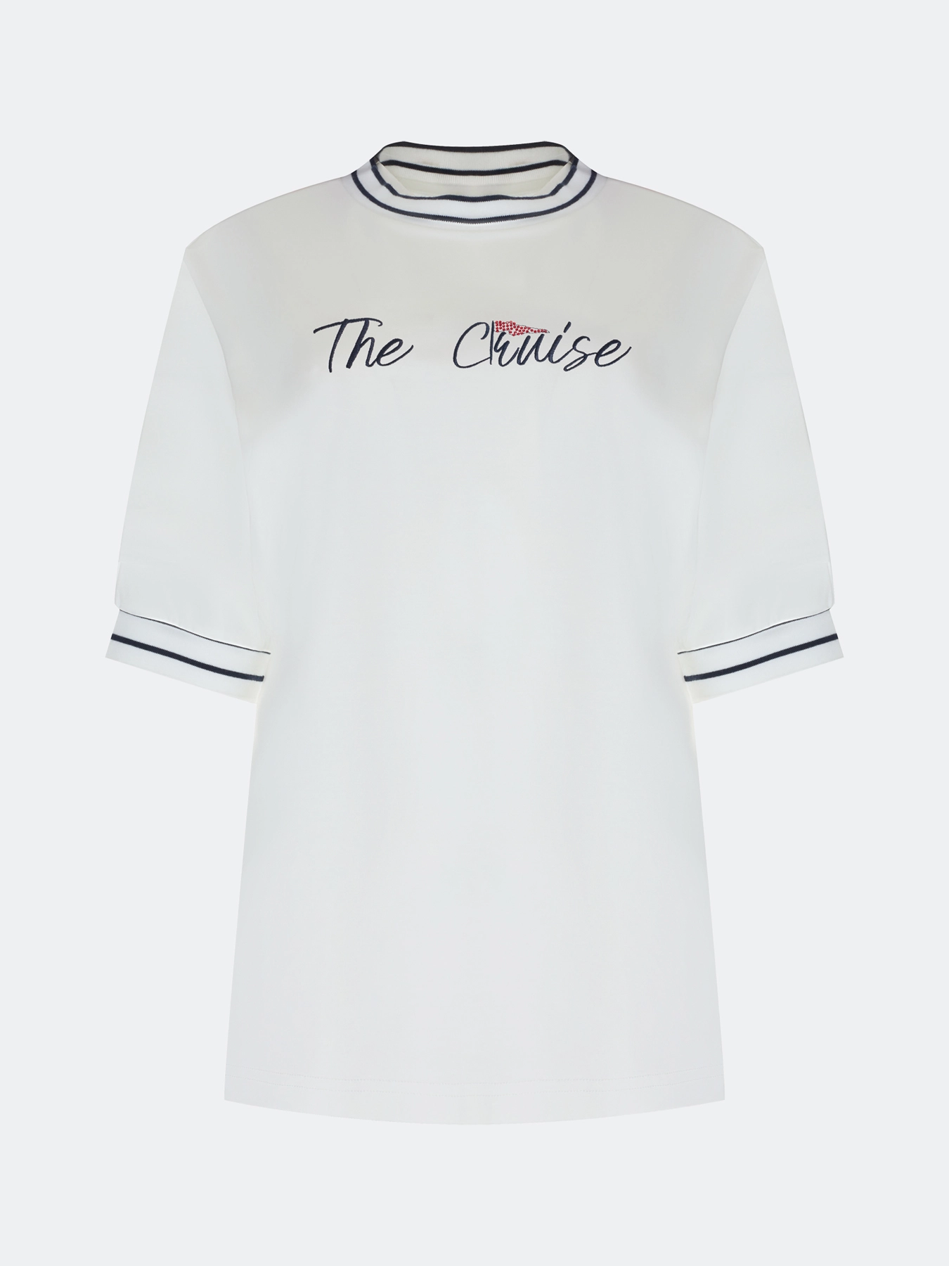 Хлопковая футболка с принтом "Cruise". Прямой силуэт. Круглый вырез. Короткие цельнокроенные рукава. Дополнена рибом в полоску по горловине и низу рукавов. Деликатные разрезы в боковых швах.