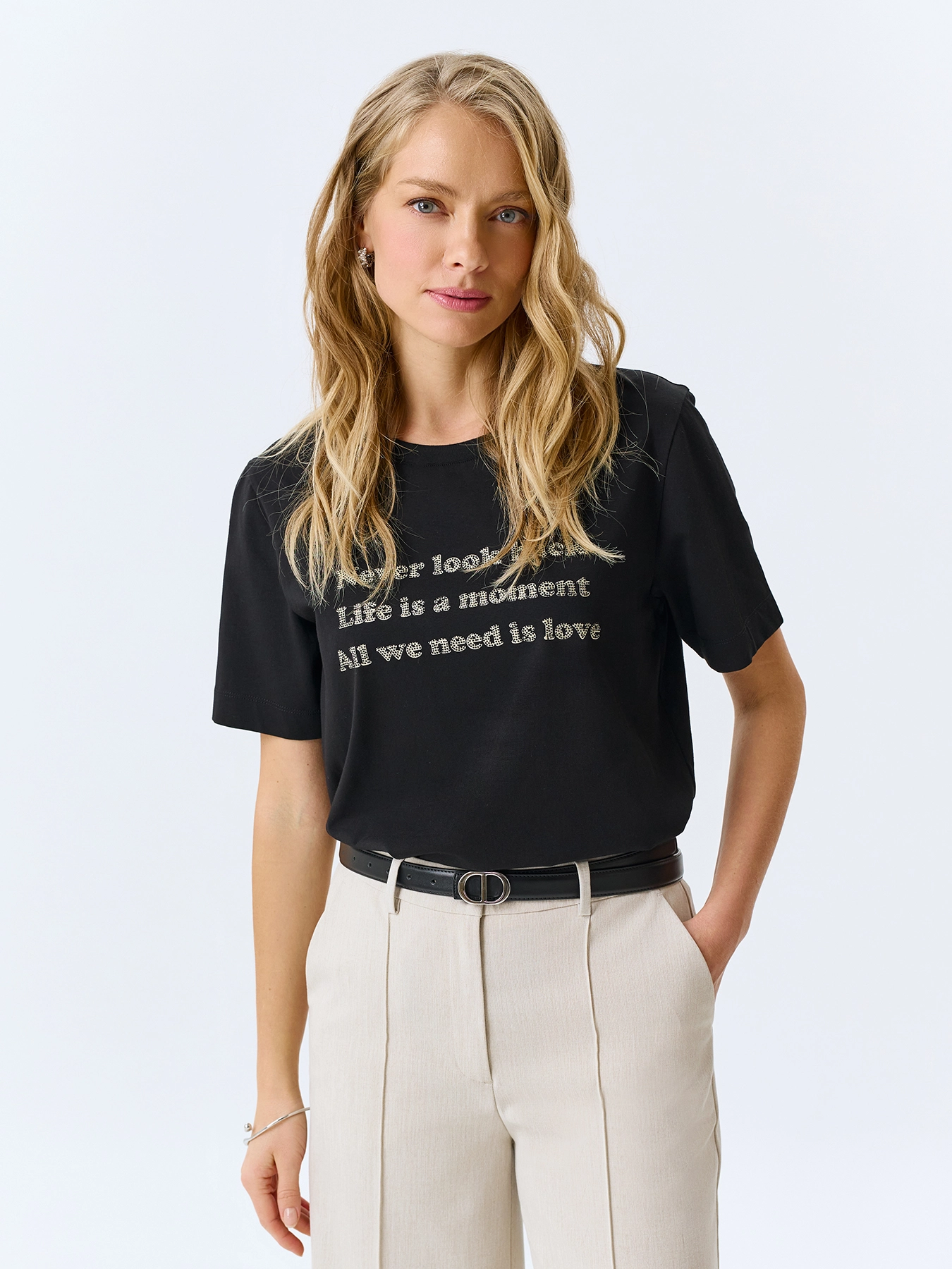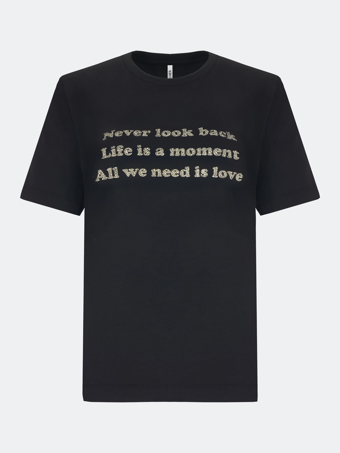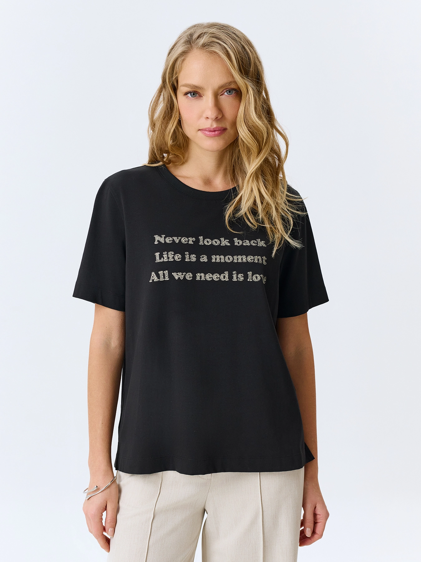 Минималистичная хлопковая футболка с шрифтовым принтом и аппликацией из страз. Прямой силуэт. Круглый вырез. Короткие втачные рукава и деликатные разрезы в боковых швах.