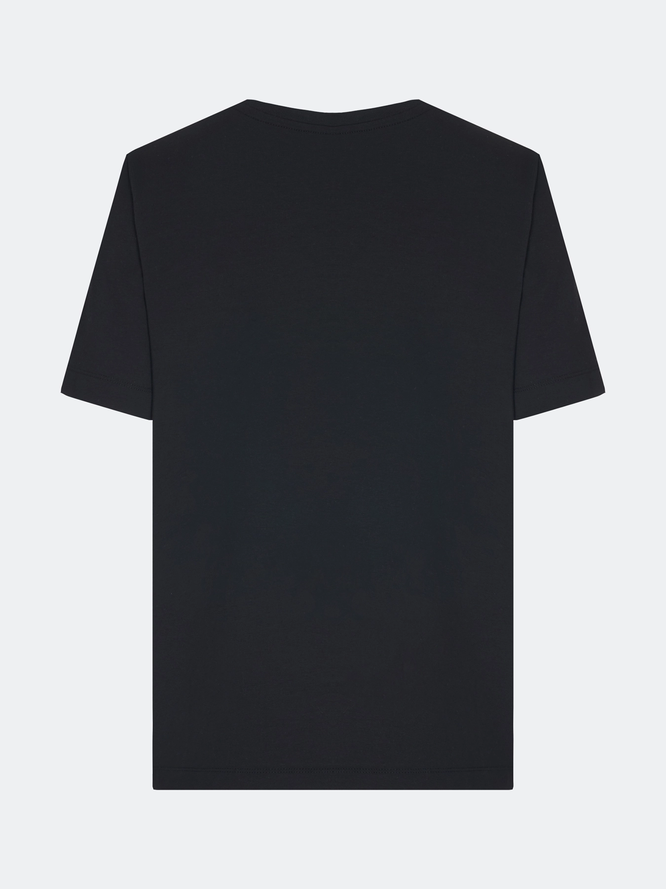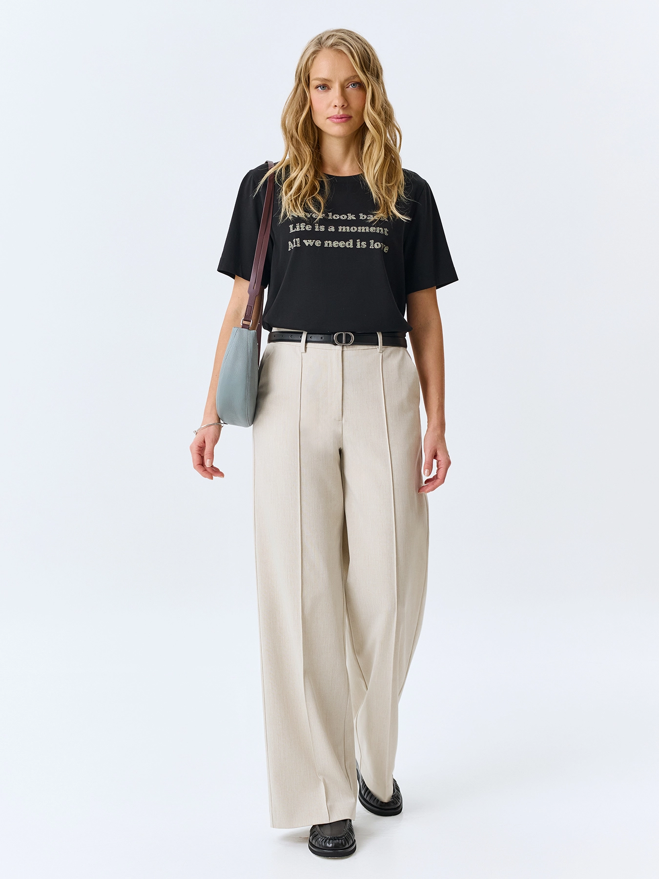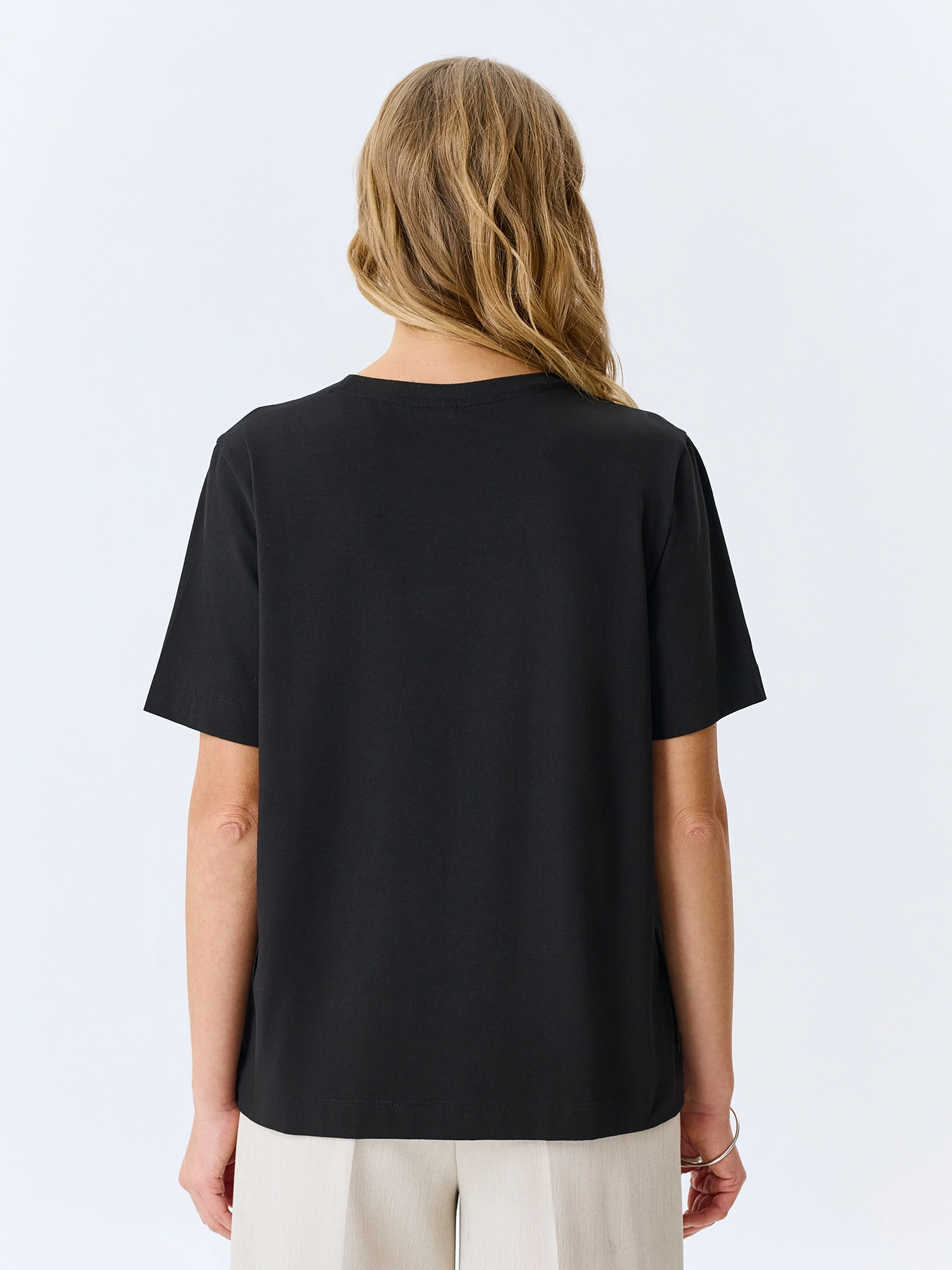 Минималистичная хлопковая футболка с шрифтовым принтом и аппликацией из страз. Прямой силуэт. Круглый вырез. Короткие втачные рукава и деликатные разрезы в боковых швах.