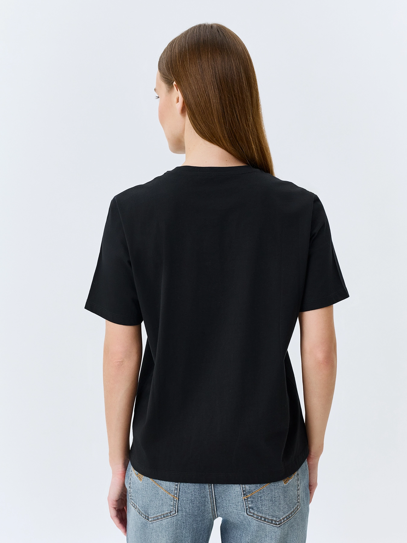 Футболка из 100% хлопка с искрящимися стразами и вышивкой. Прямой силуэт. Круглый вырез. Короткие втачные рукава.