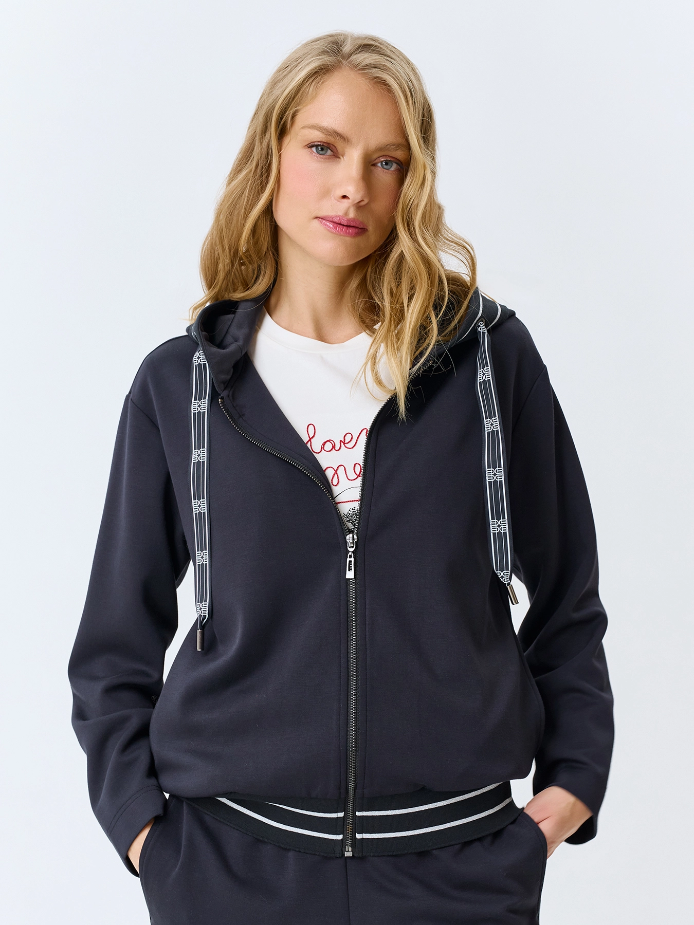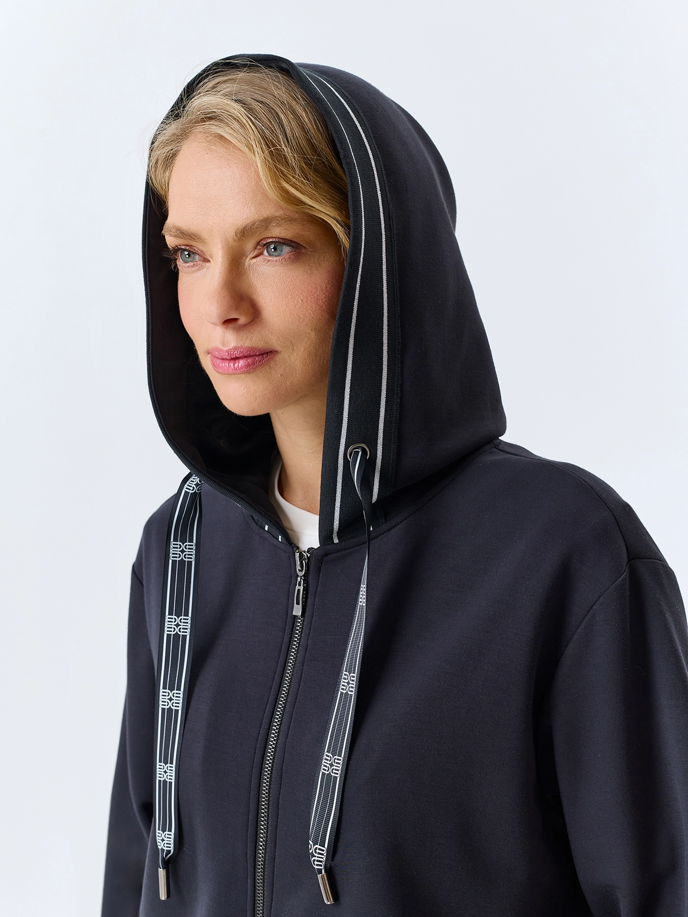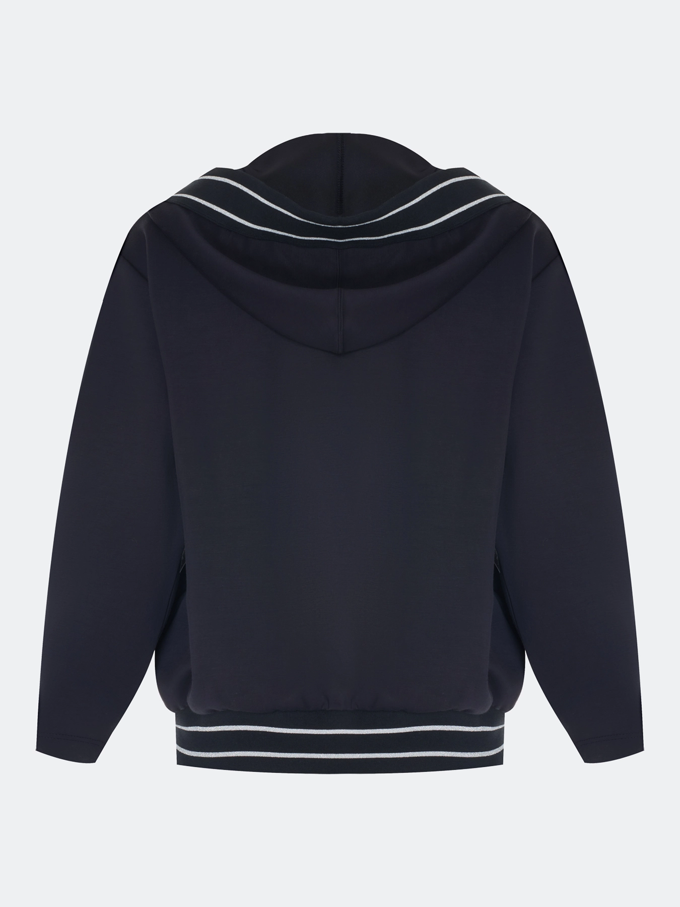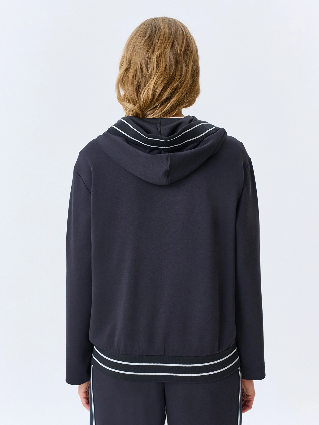 Жакет из смесовой вискозы свободного силуэта. Воротник дополнен капюшоном с кулисой и брендированной тесьмой. Застежка на молнию. Линия плеч немного спущена. Боковые карманы в швах. Контрастный риб по капюшону и низу изделия. Комплект с 4267831.