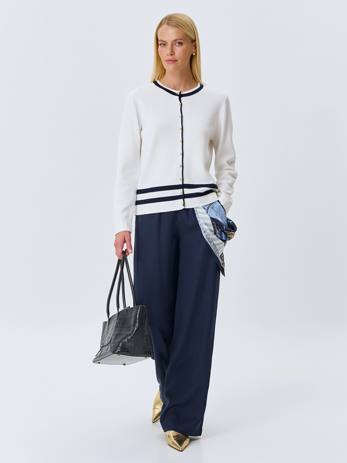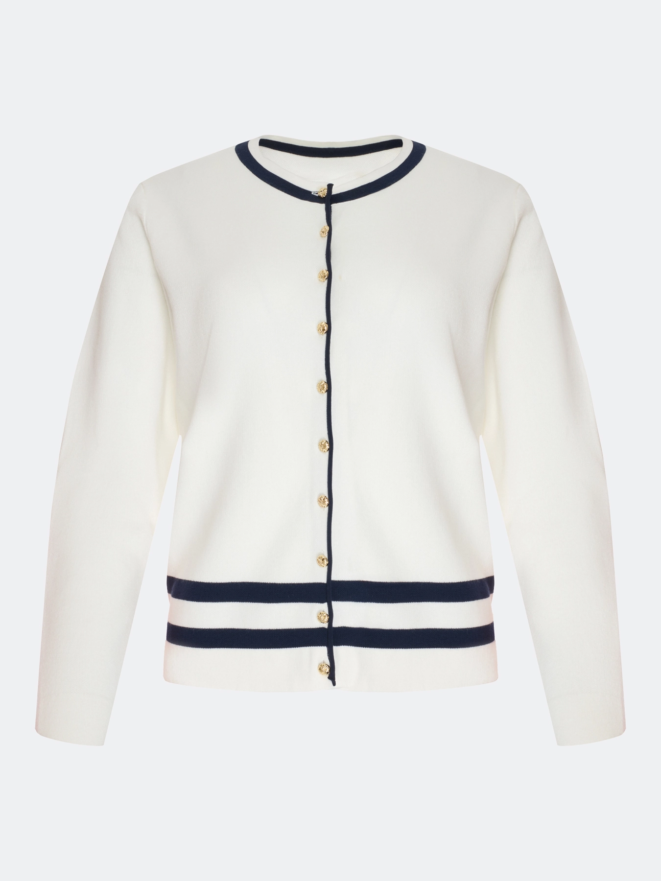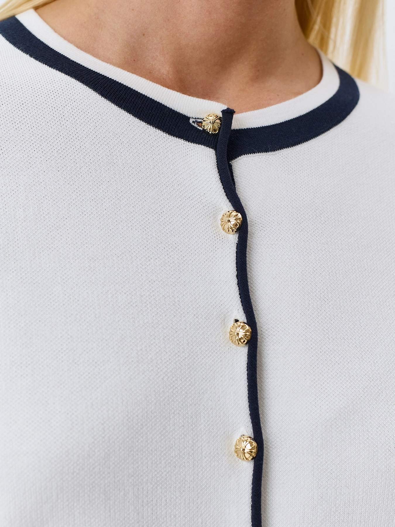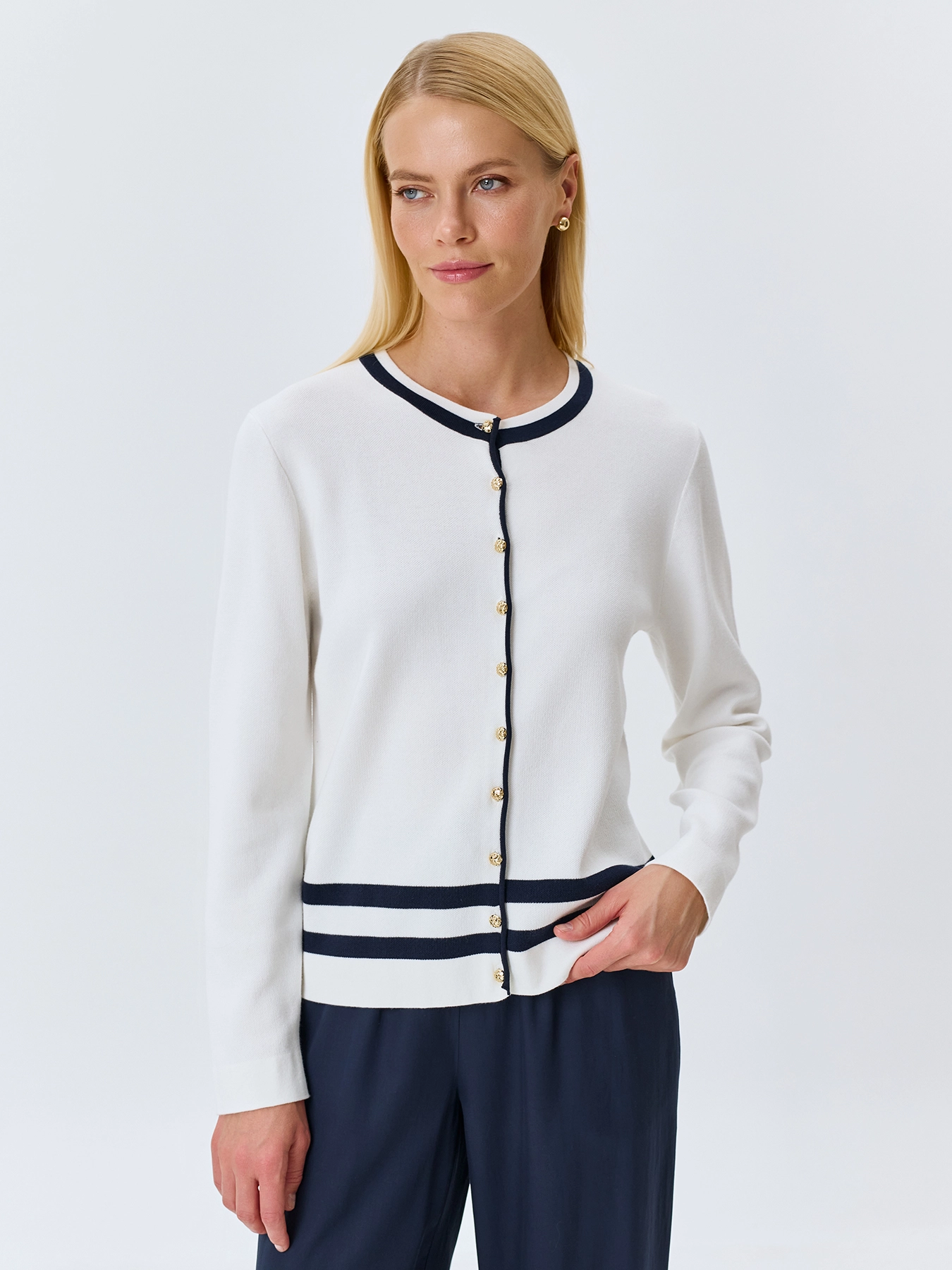 Кардиган из мягкого модала и хлопка с контрастной отделкой. Прямой силуэт. Круглый вырез. Застежка на золотистые пуговицы. Длинные втачные рукава.