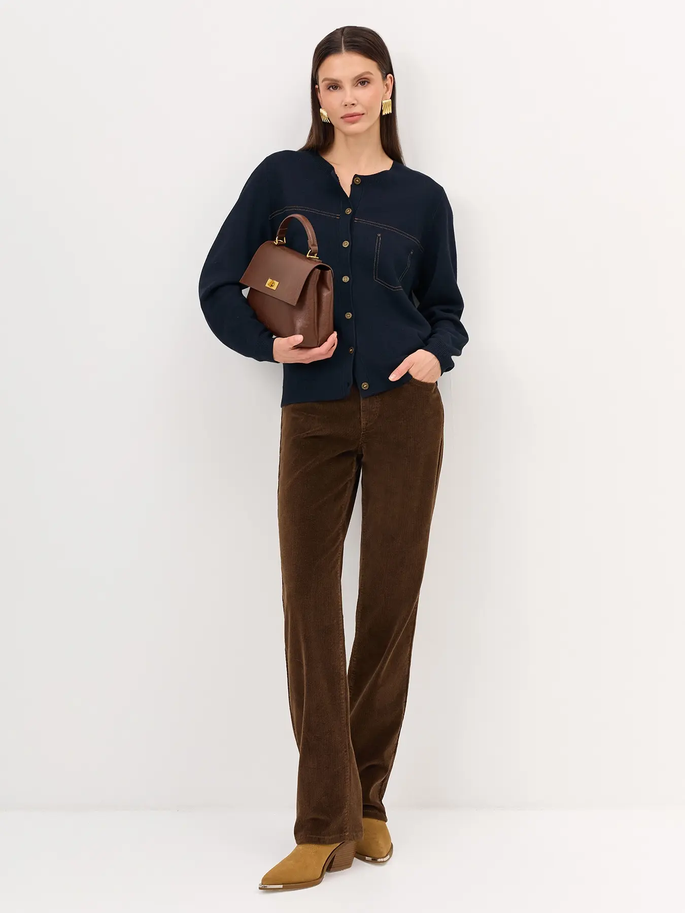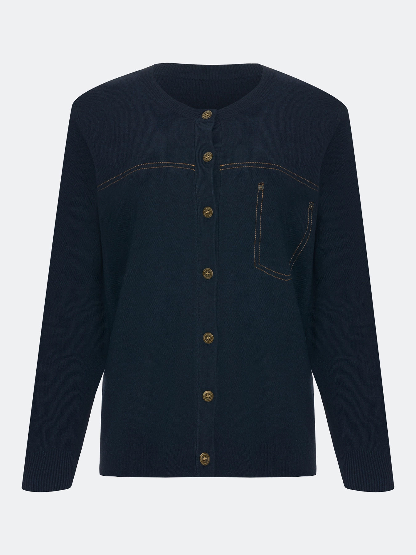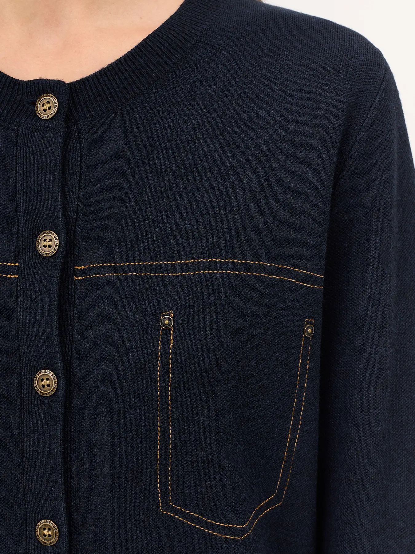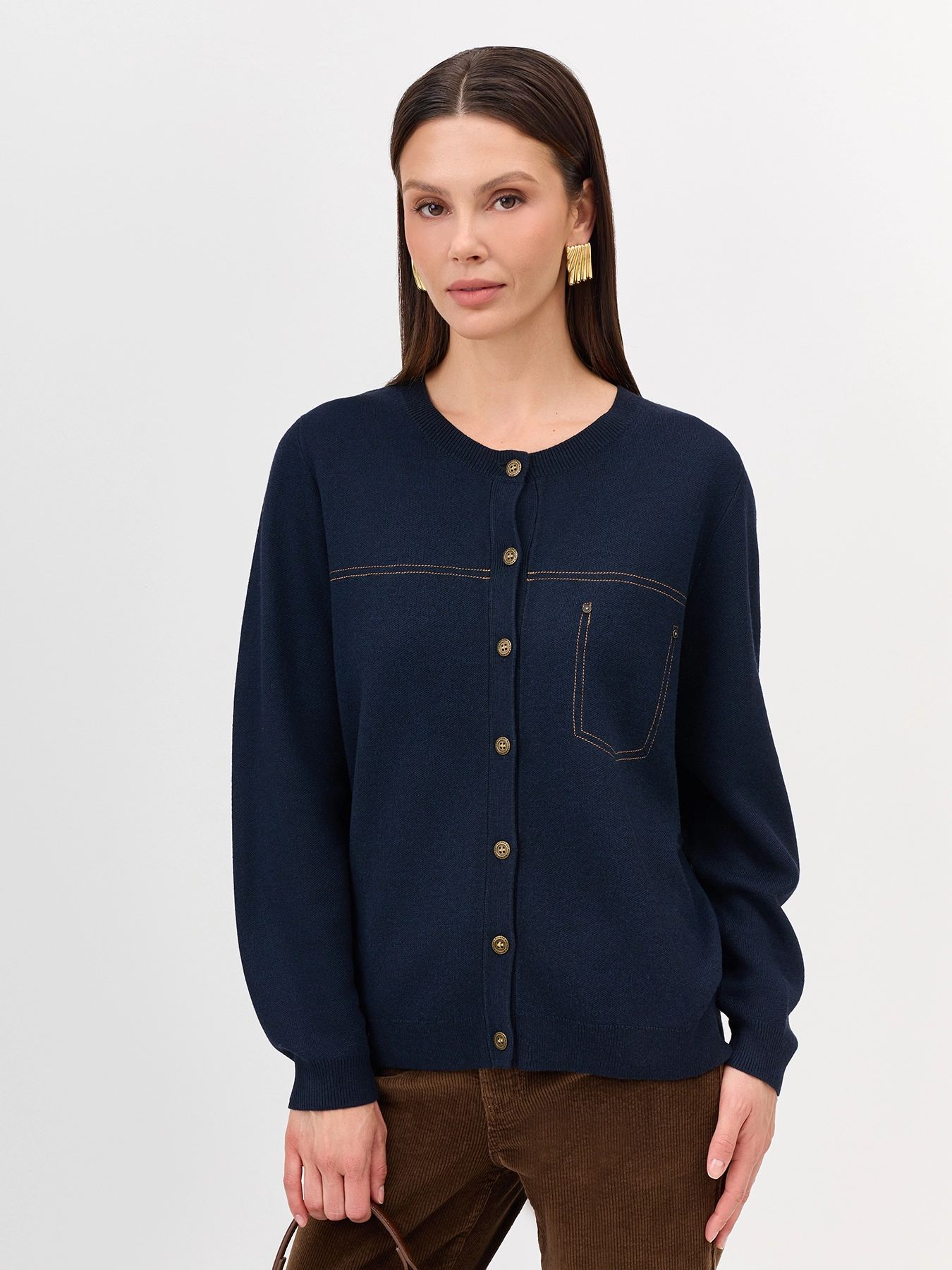 Кардиган «Bulmer» — стильное решение вашего осенне-зимнего гардероба! Прямой силуэт подчеркивает фигуру, а глубокий синий цвет придает образу элегантности. Долговечность немецкого качества сочетается здесь с комфортом вязаного изделия. Контрастные строчки добавляют оригинальности и делают его идеальным акцентным элементом образа. Подходит для демисезона и зимы благодаря легкому фасону и удобной застежке-пуговицам. Доступен размерный ряд от 44 до 50 российского стандарта – найдётся для каждого!