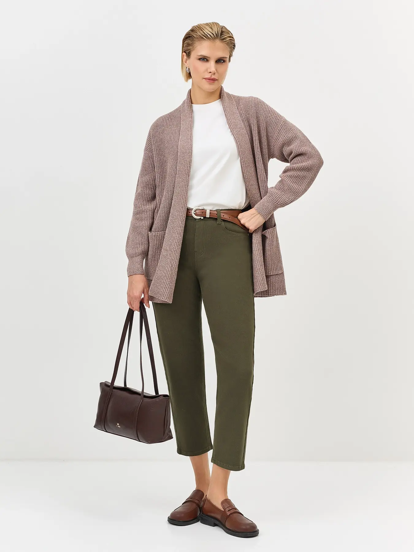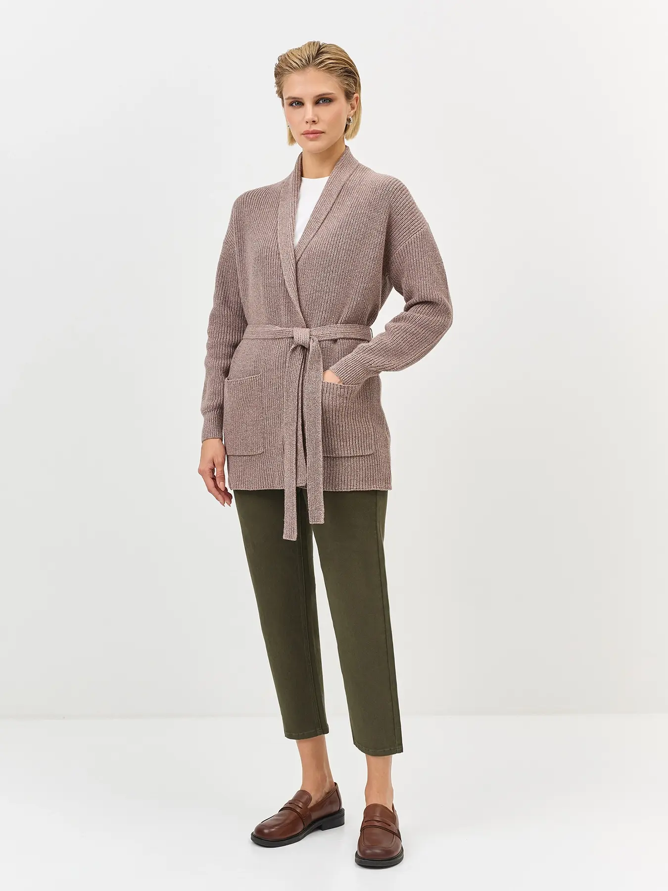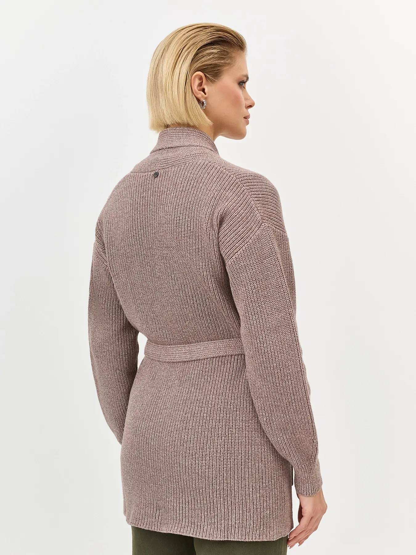 Вязаный свободного силуэта из 100% хлопка. Объемная вязка. Свободный силуэт можно приталить поясом. V-образный вырез. Спущенная линия плеч. Длинные рукава с широкими отворотами по низу. Накладные боковые карманы.