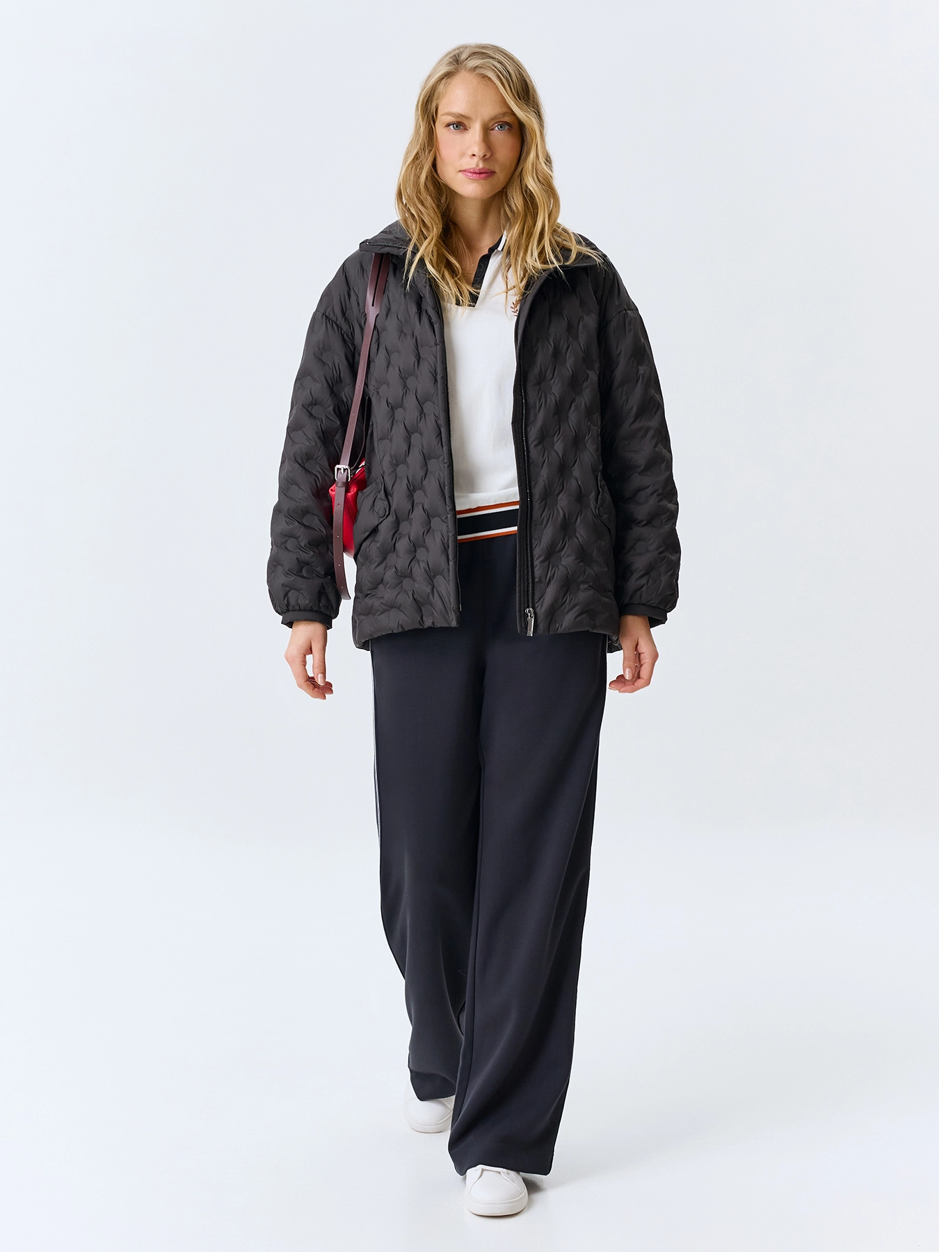 Легкая куртка с фантазийной горячей стежкой. Свободный силуэт. Воротник высокая стойка. Застежка на молнию. Спущенная линия плеч и длинные рукава с резинкой по низу. Боковые карманы с клапанами и кнопками в цвет. Дополнена утяжниками по низу изделия. В качестве утеплителя натуральный пух.