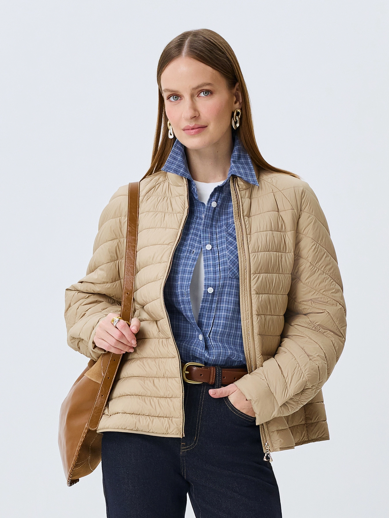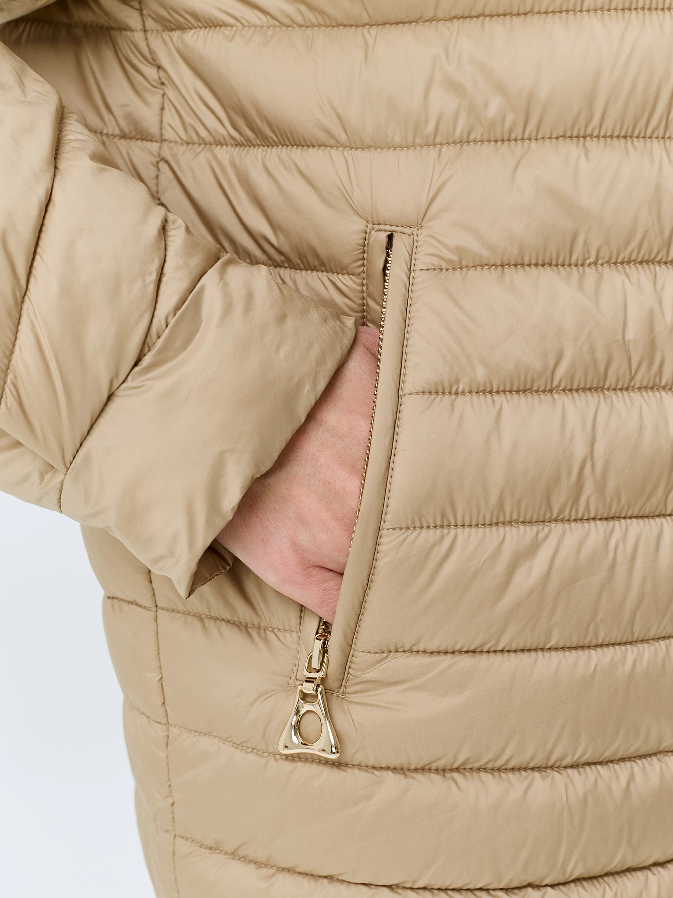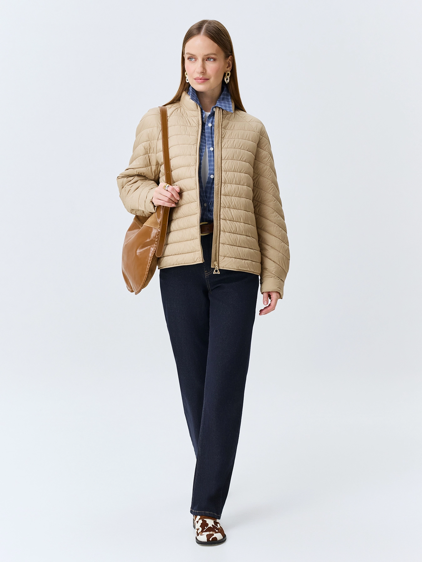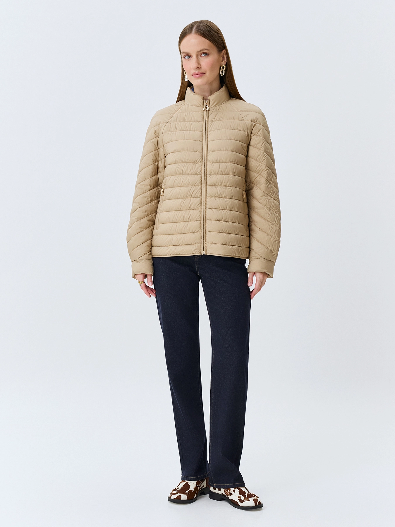 Легкая куртка с прямоугольной стежкой. Свободный силуэт. Воротник небольшая стойка. Застежка на молнию. Боковые карманы на молнии. Длинные рукава реглан с манжетами по низу.