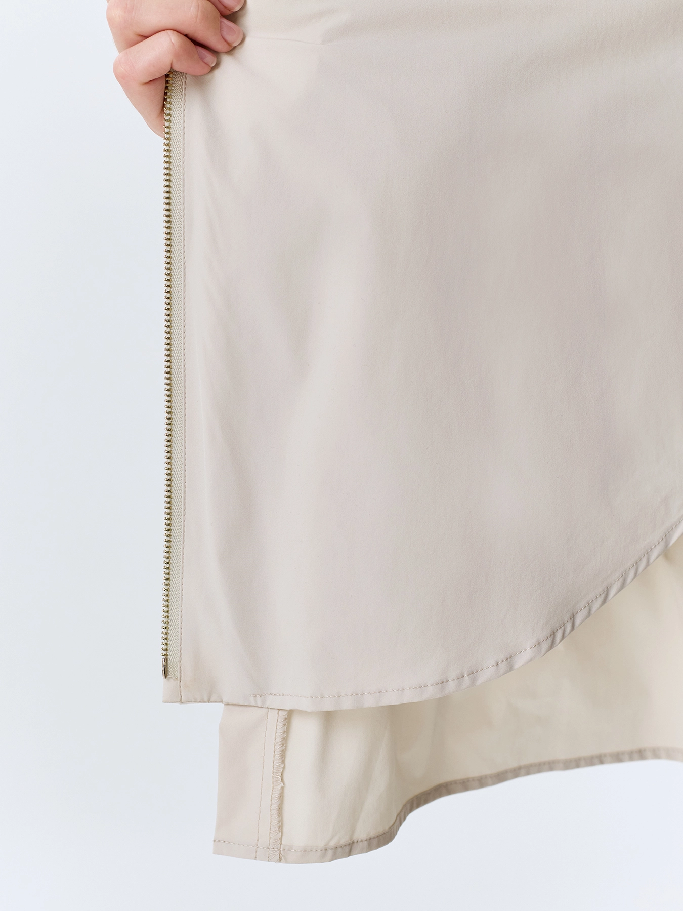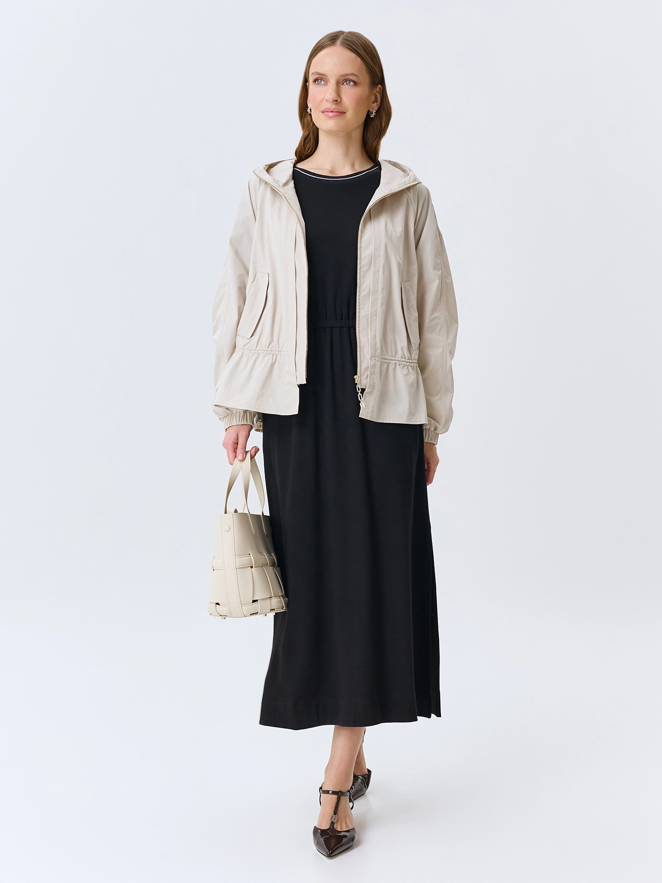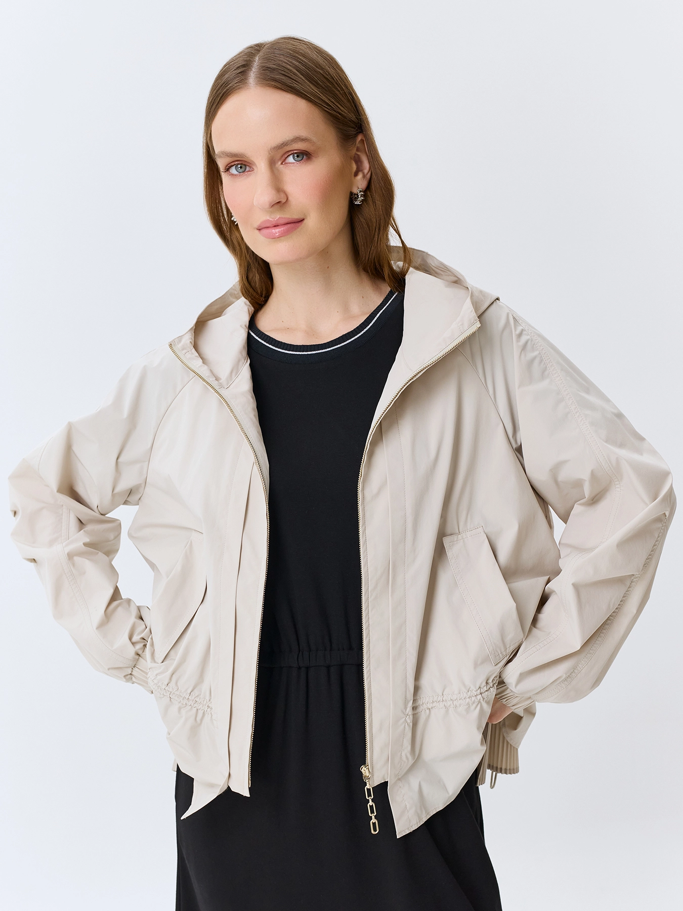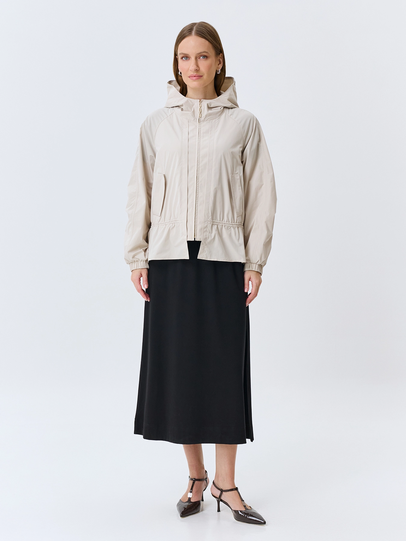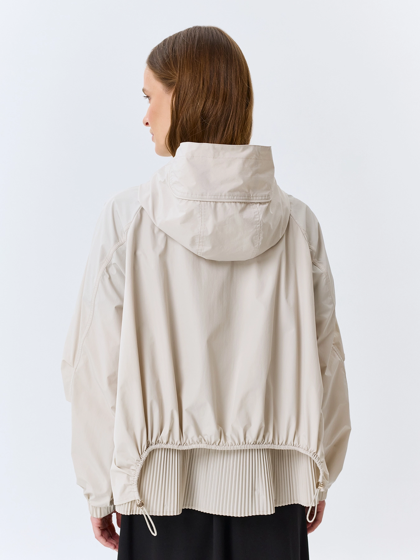 Легкая ветровка свободного силуэта. Воротник стойка. Дополнен капюшоном на кулисе. Застежка на молнию. Спущенная линия плеч и длинные рукава с резинкой по низу. Боковые карманы с листочками. Дополнена резинкой по линии талии и фигурным вырезом с плиссированной деталью по спинке. Кулиса по линии низа.