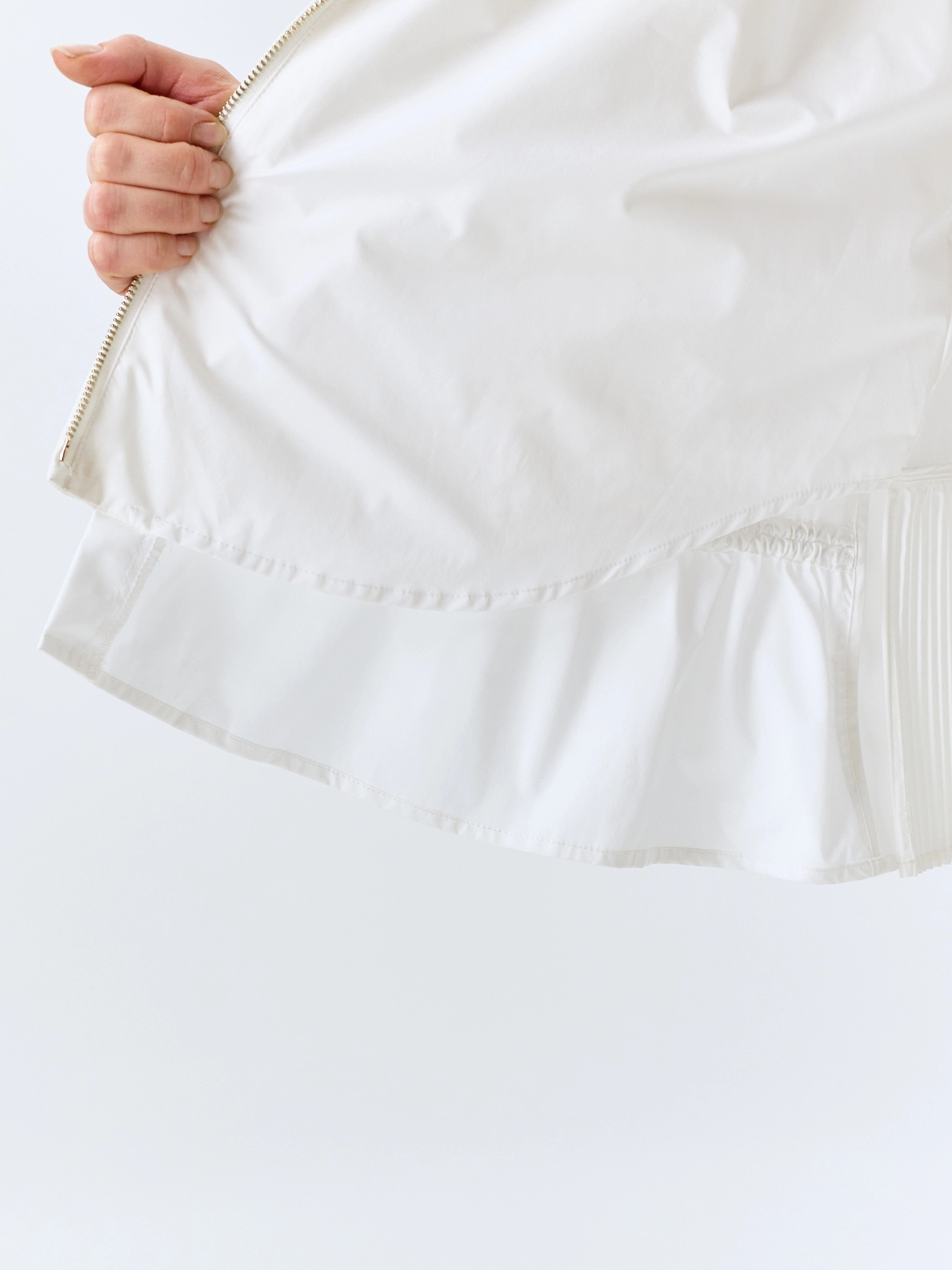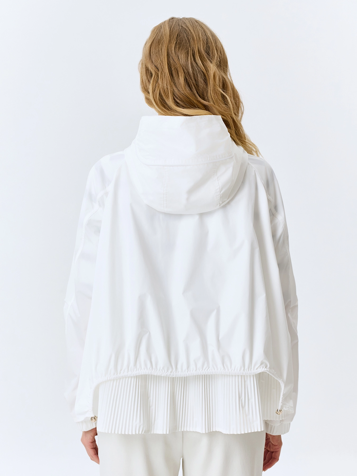Легкая ветровка свободного силуэта. Воротник стойка. Дополнен капюшоном на кулисе. Застежка на молнию. Спущенная линия плеч и длинные рукава с резинкой по низу. Боковые карманы с листочками. Дополнена резинкой по линии талии и фигурным вырезом с плиссированной деталью по спинке. Кулиса по линии низа.