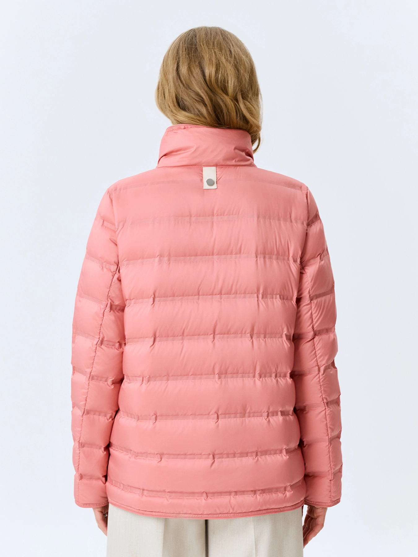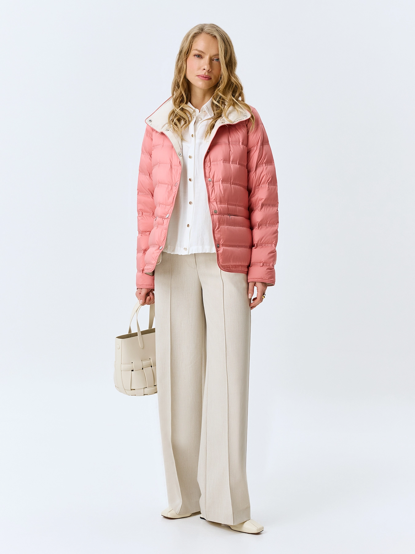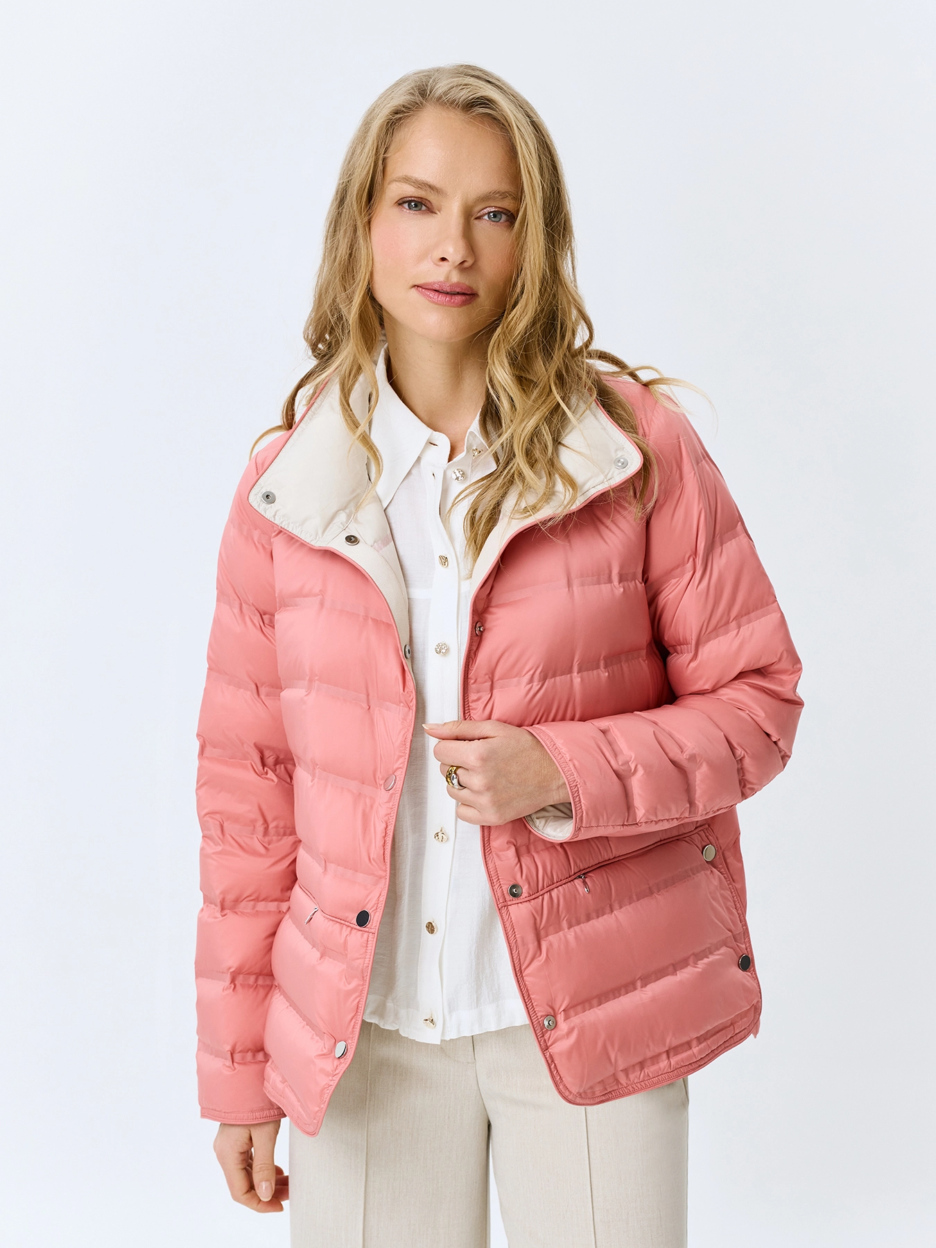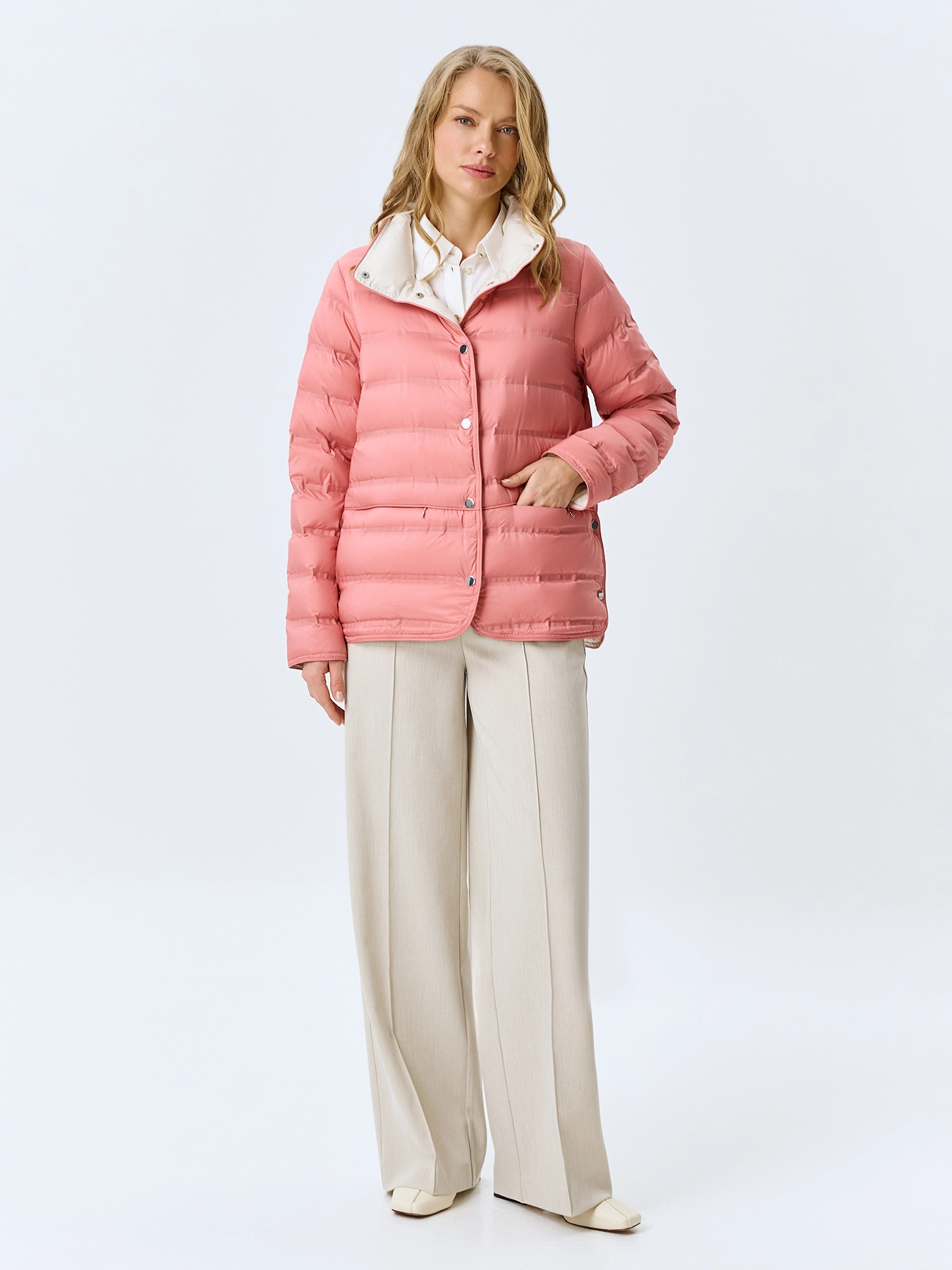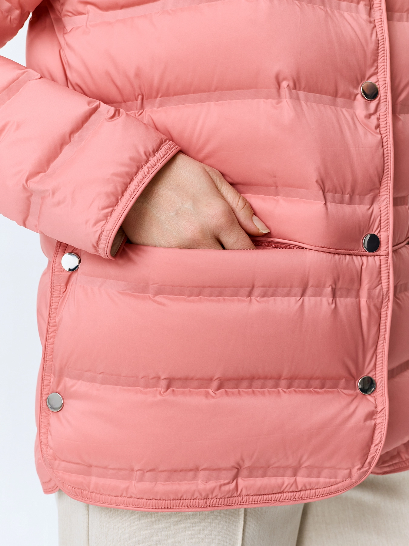 Легкая куртка с горизонтальной горячей стежкой. Прямой силуэт. Воротник стойка на кнопках. Застежка на металлические кнопки. Боковые карманы на молнии. Длинные втачные рукава. Дополнена контрастной подкладкой и акцентными разрезами на кнопках в боковых швах. В качестве утеплителя натуральный пух.