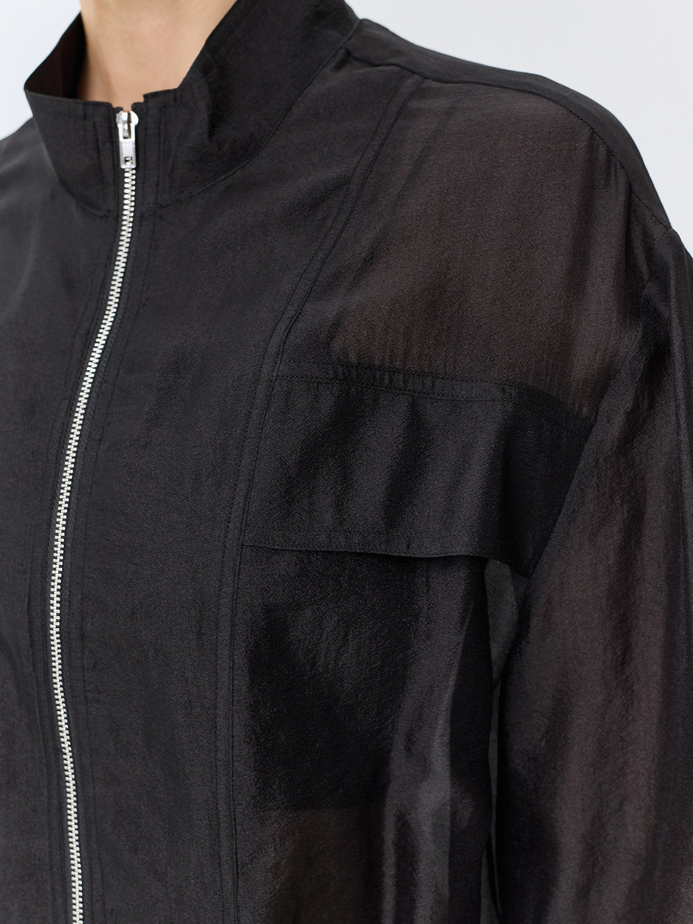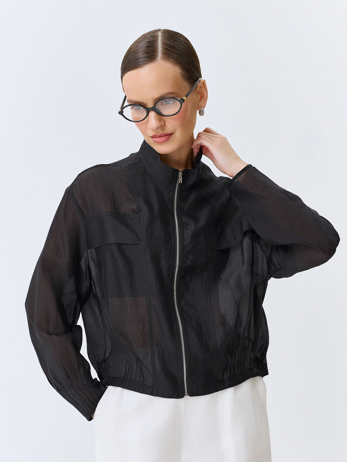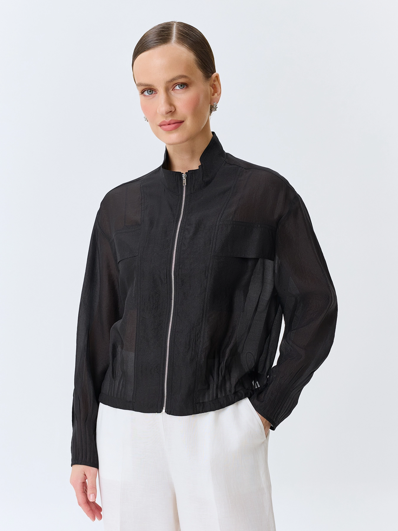 Полупрозрачный жакет из смесовой вискозы. Свободный силуэт. Воротник стойка. Застежка на молнию. Спущенная линия плеч и длинные рукава с защипами по низу. Накладные нагрудные карманы с клапанами. Защипы и кулиса по низу изделия.
