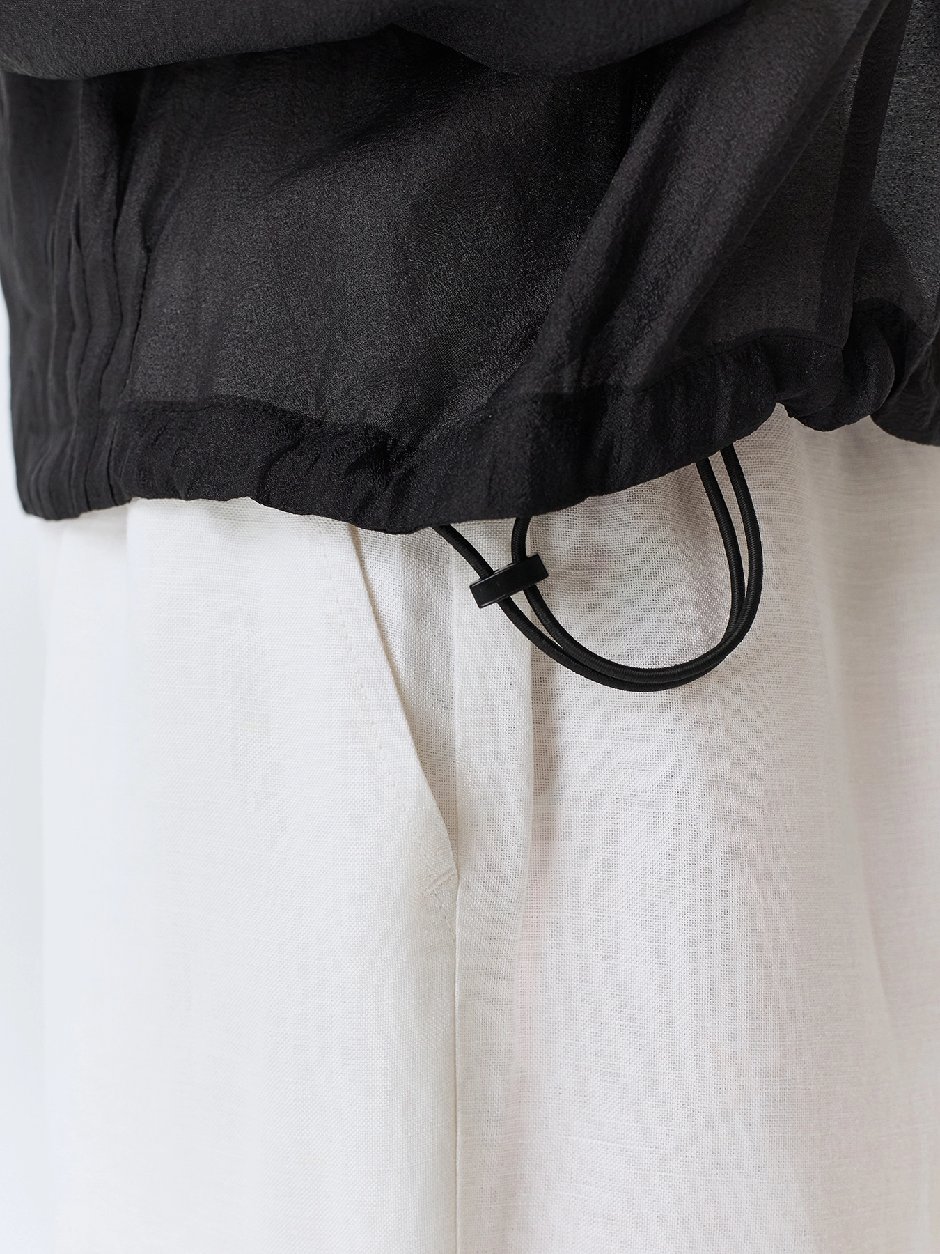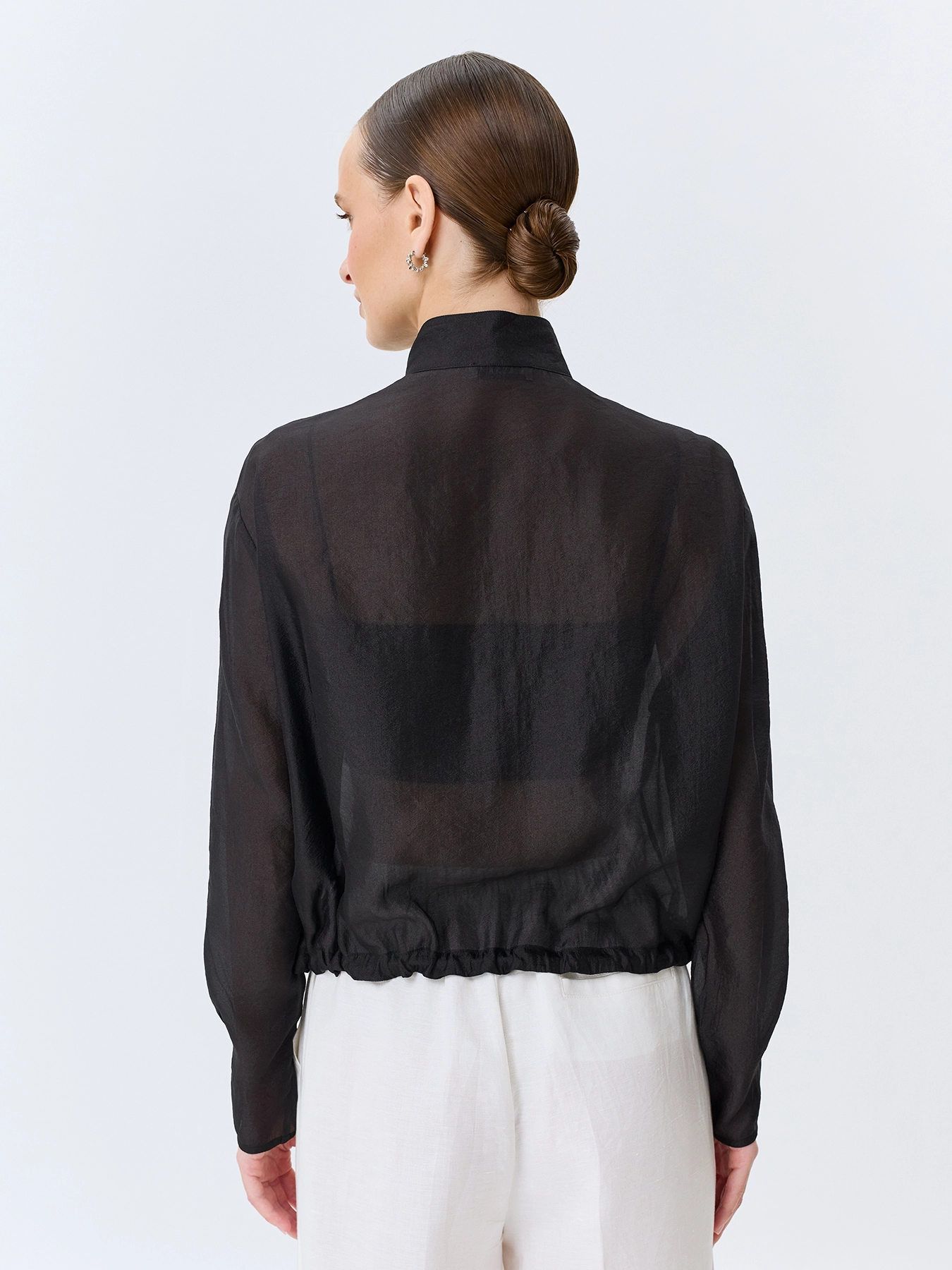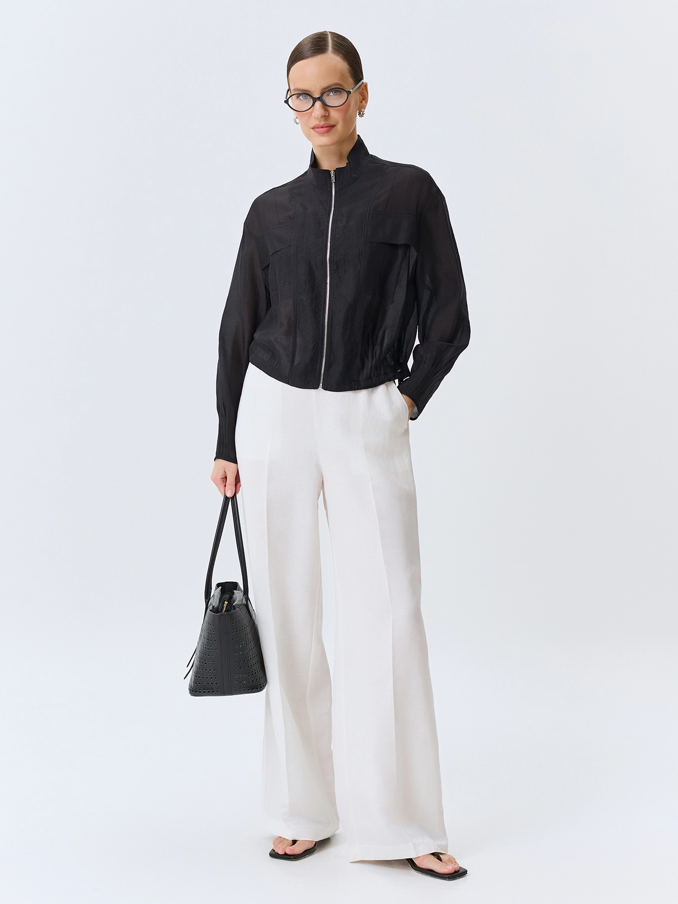 Полупрозрачный жакет из смесовой вискозы. Свободный силуэт. Воротник стойка. Застежка на молнию. Спущенная линия плеч и длинные рукава с защипами по низу. Накладные нагрудные карманы с клапанами. Защипы и кулиса по низу изделия.