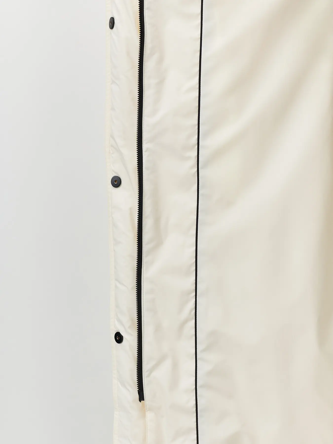 Oversize пуховик со съёмным капюшоном на натуральном утеплителе. Свободный силуэт. Длина миди. Спущенная линия плеч. Воротник стойка дополнен капюшоном на кнопках. Застежка на контрастную молнию и планку с потайными кнопками. Боковые карманы с листочками. В качестве утеплителя натуральный пух.